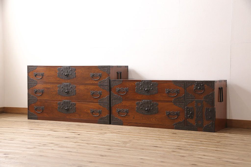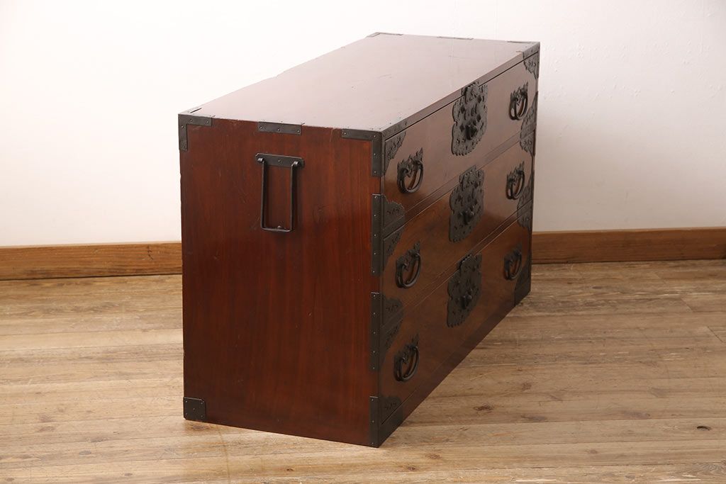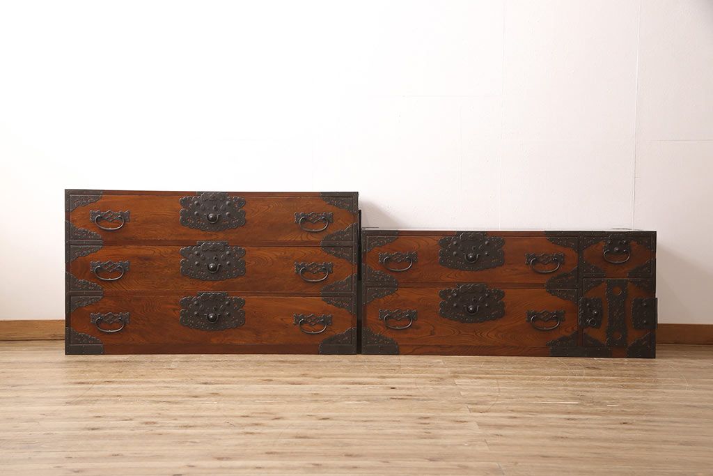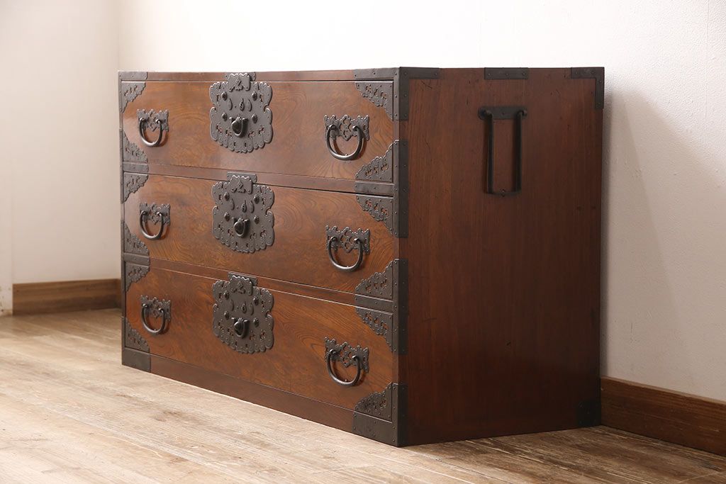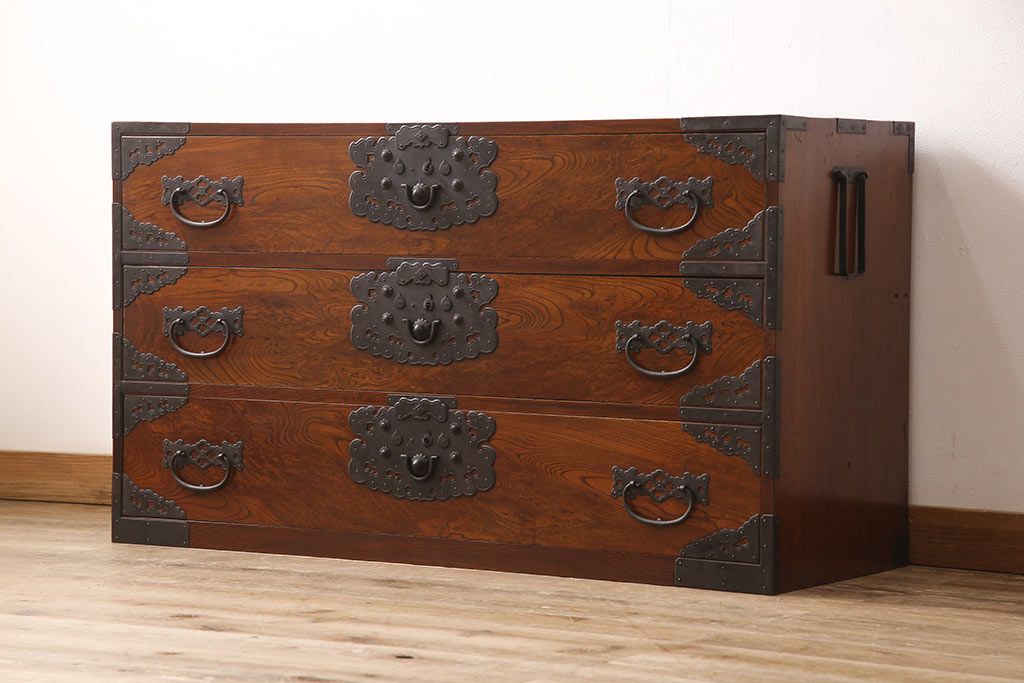 和製アンティーク 前面ケヤキ材 希少 迫力ある金具が目を引く佐渡小木箪笥・上段(衣装箪笥、引き出し、ローチェスト、ローボード)(R-052406)