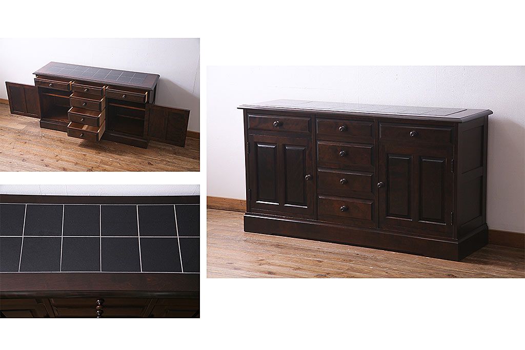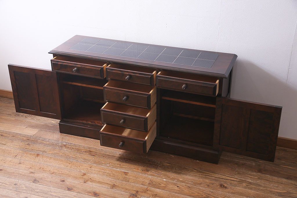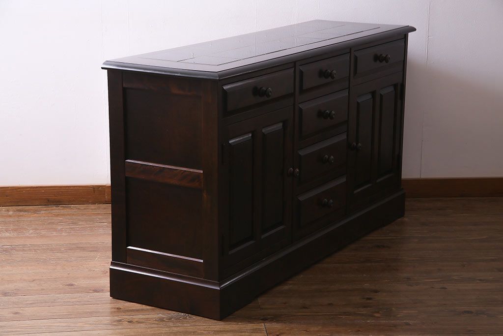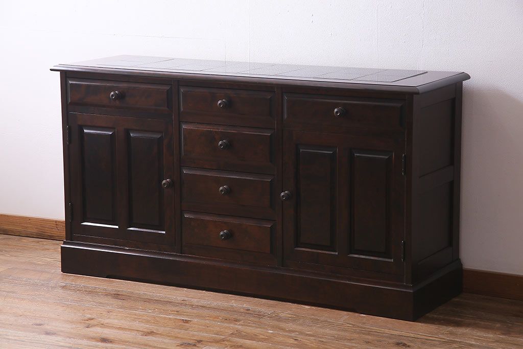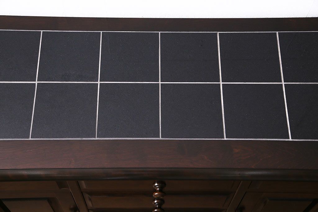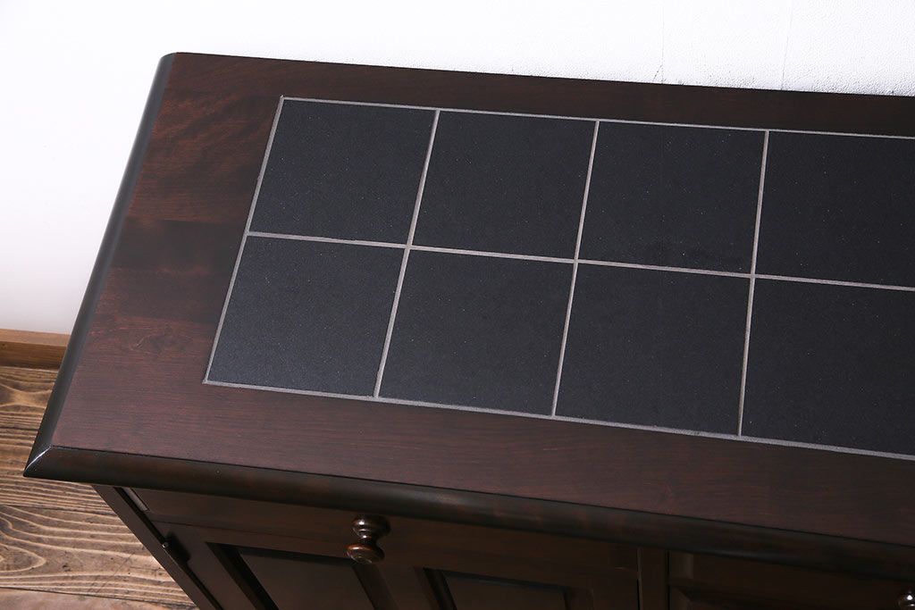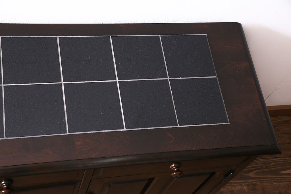 キャビネット・戸棚> サイドボード > 北海道民芸角のサイドボードをリペア&カスタム!天然御影石を使用したタイルトップ天板を取り付け、黄味がかった濃い茶色に着色し仕上げ。(収納棚、カウンター)
