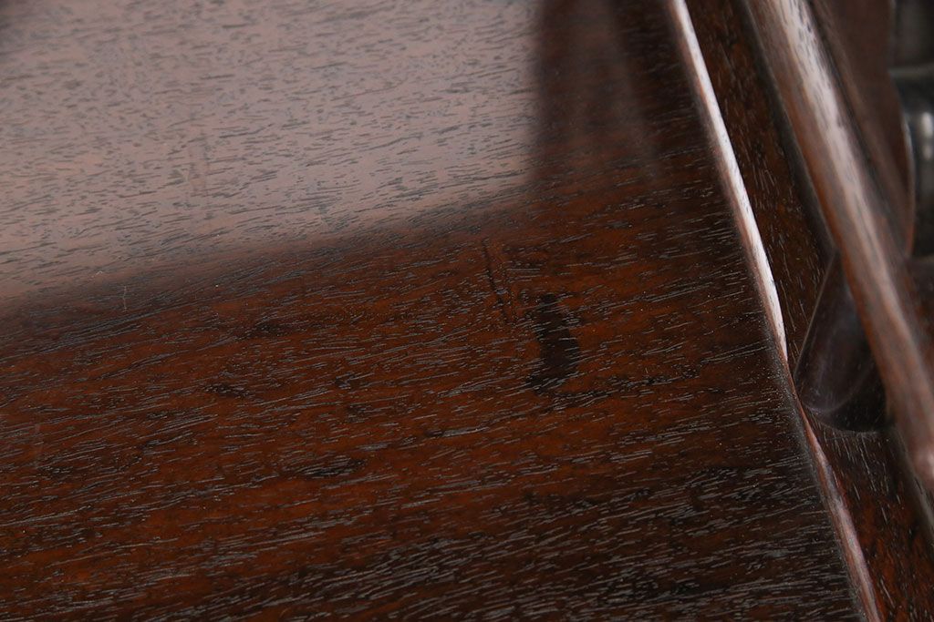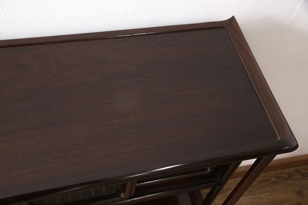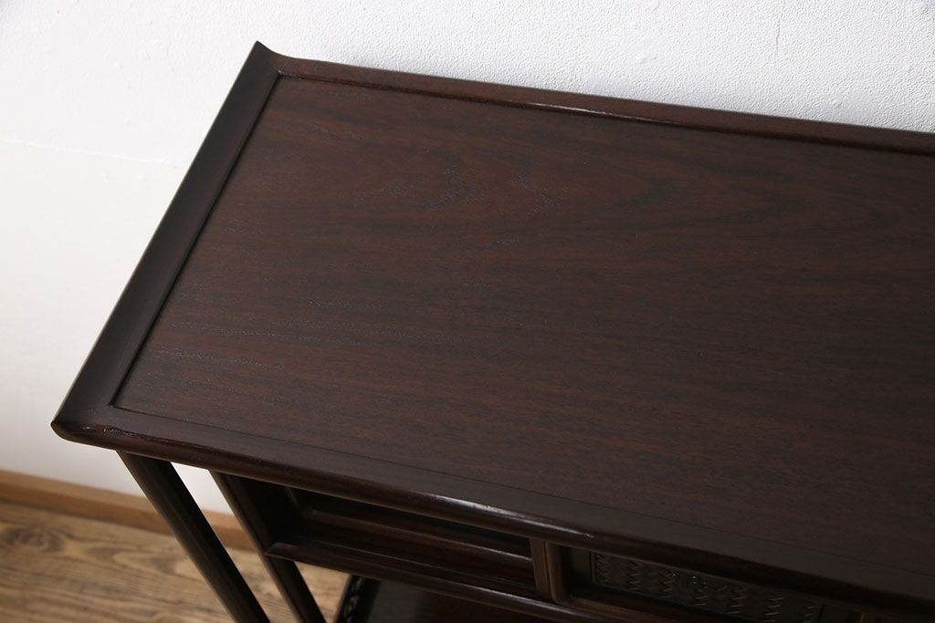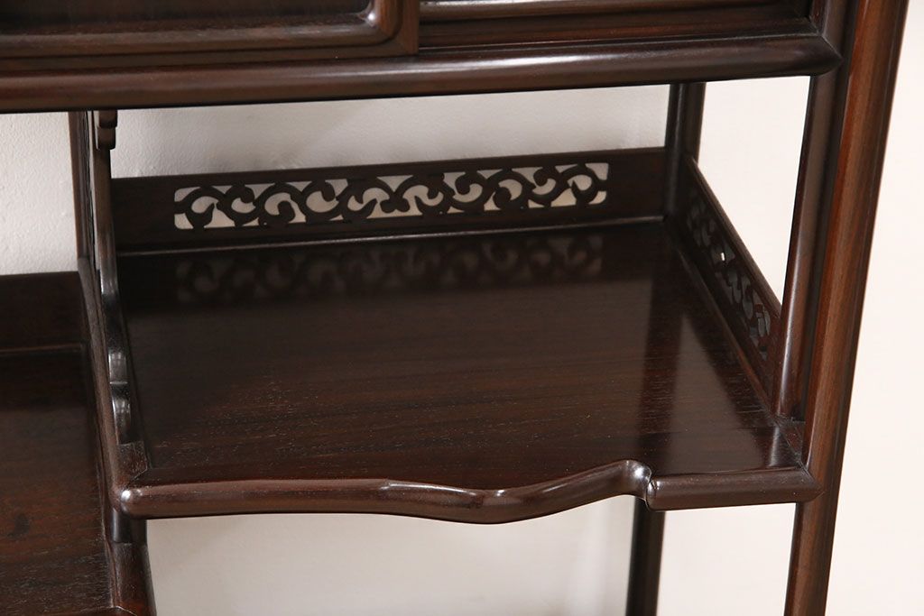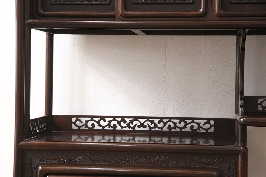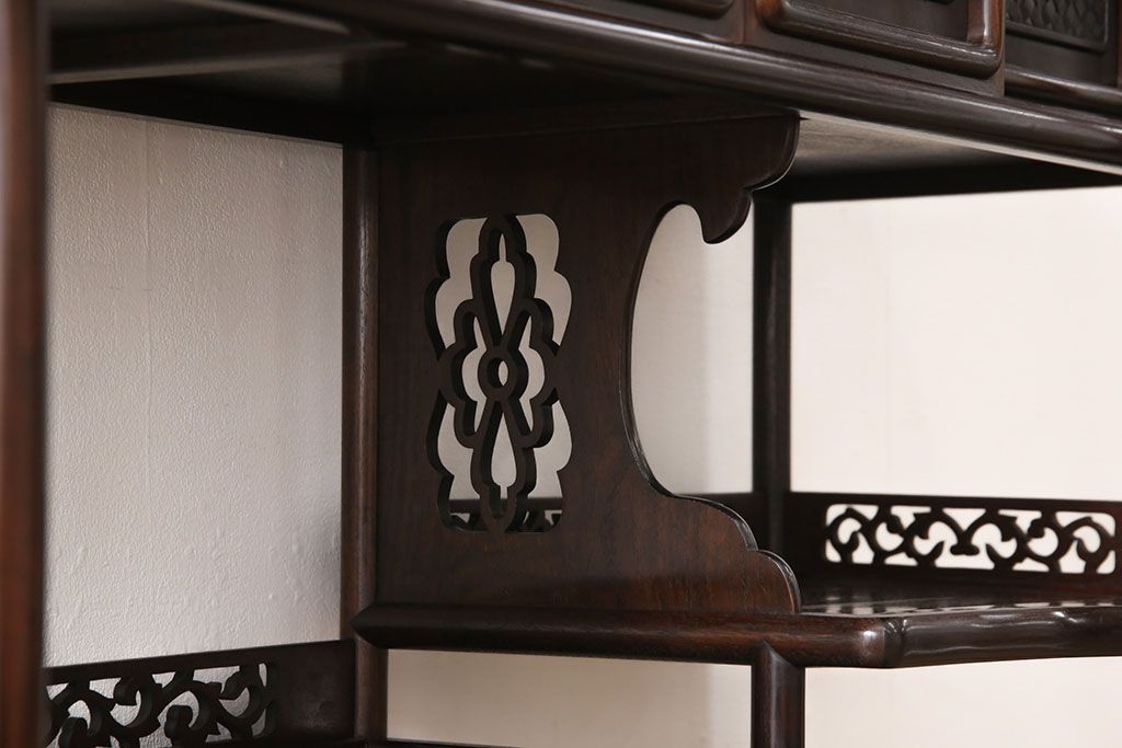 和箪笥> 茶箪笥・茶棚 > 中古 美品 伝統工芸家具 大阪唐木指物 漆塗り 細やかな彫りの意匠が見事な総紫檀(シタン)材製の飾り棚(茶棚、収納棚、戸棚)(定価約80万円)(R-052156)