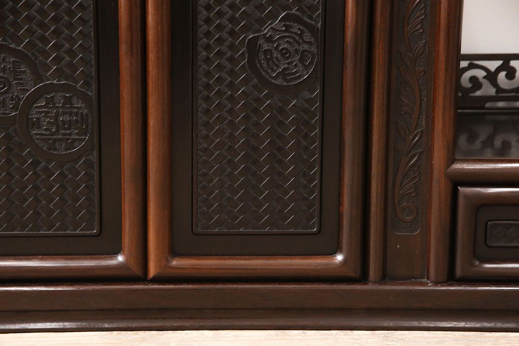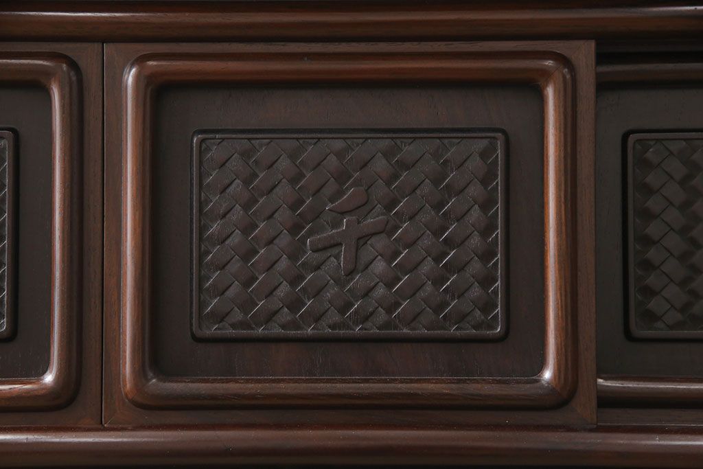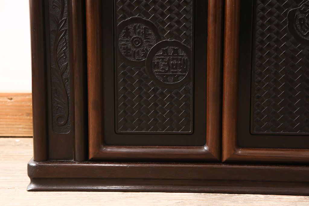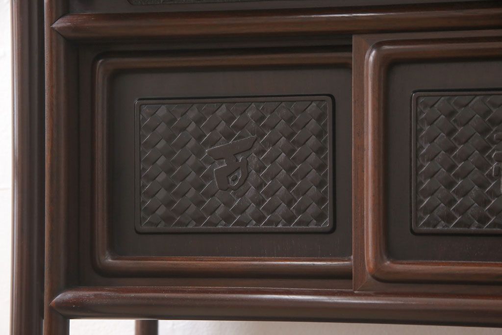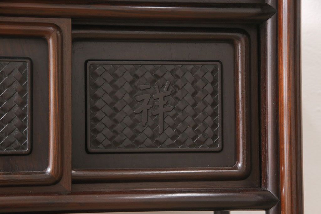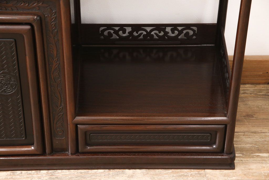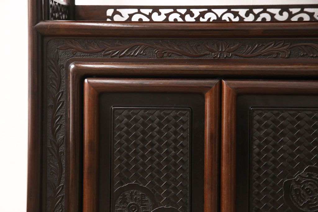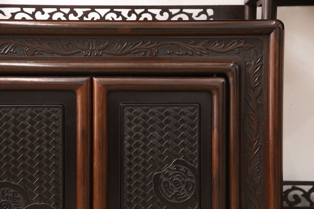 和箪笥 > 中古 美品 伝統工芸家具 大阪唐木指物 漆塗り 細やかな彫りの意匠が見事な総紫檀(シタン)材製の飾り棚(茶棚、収納棚、戸棚)(定価約80万円)(R-052156)