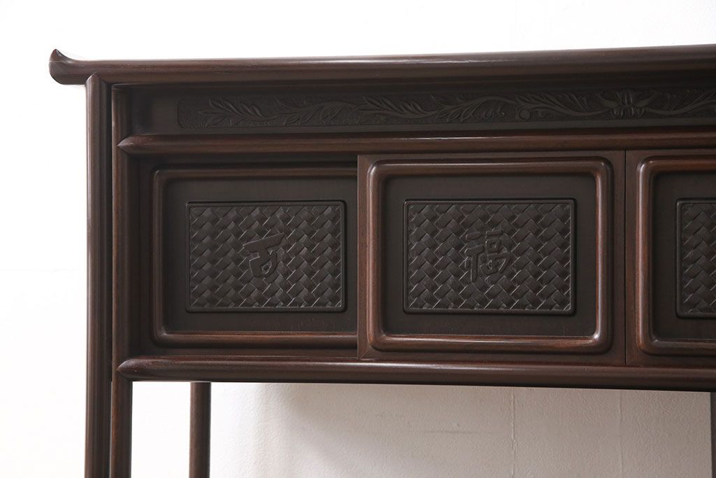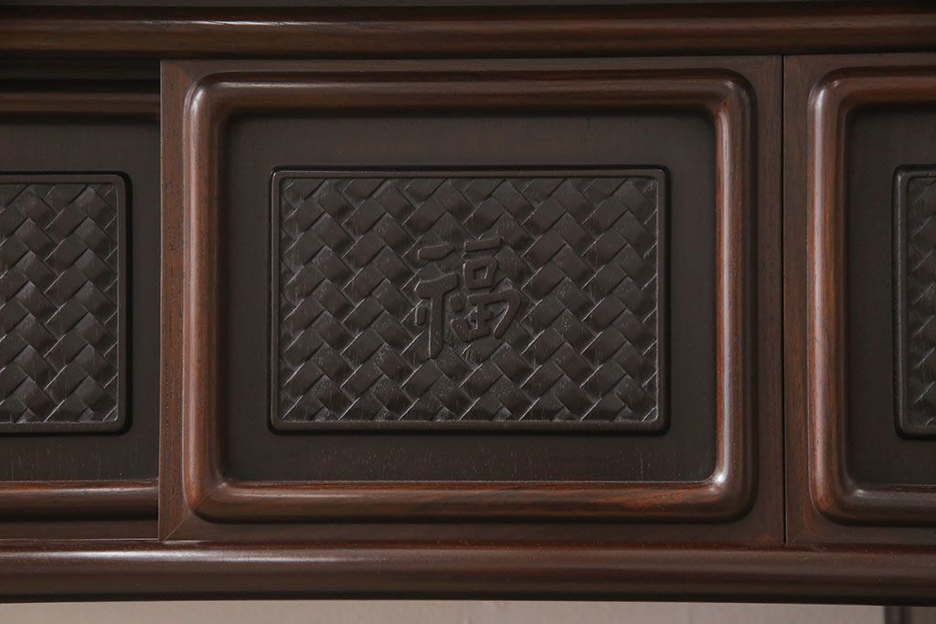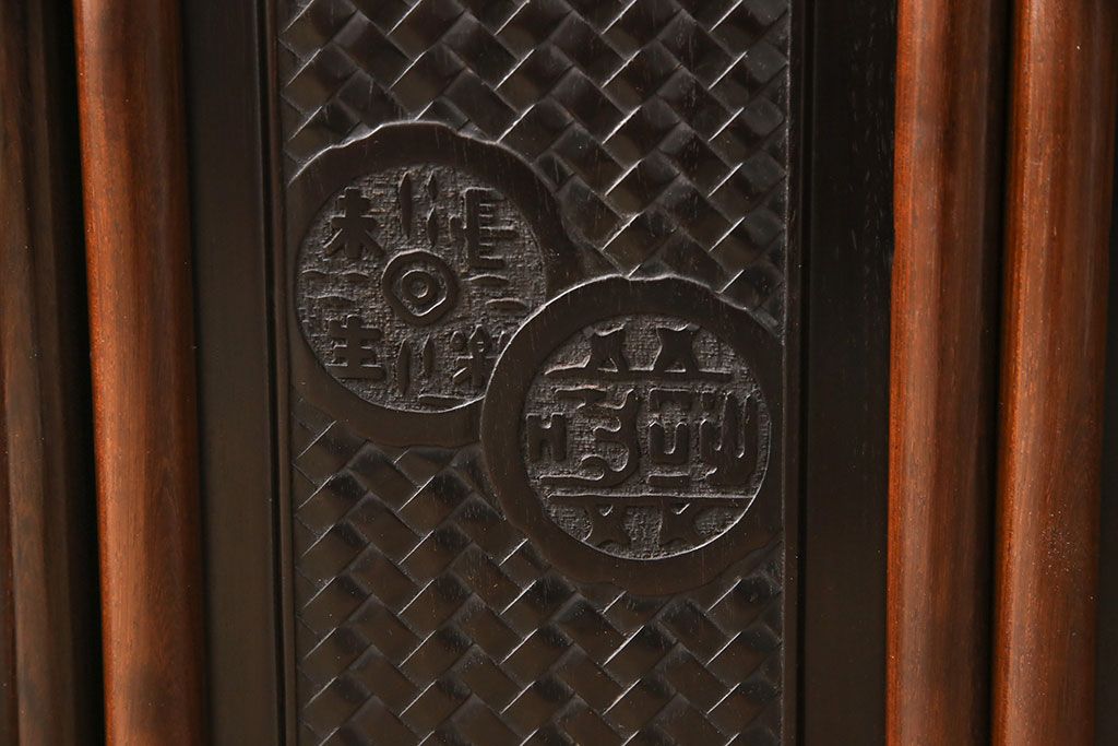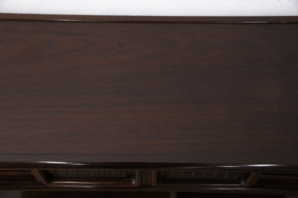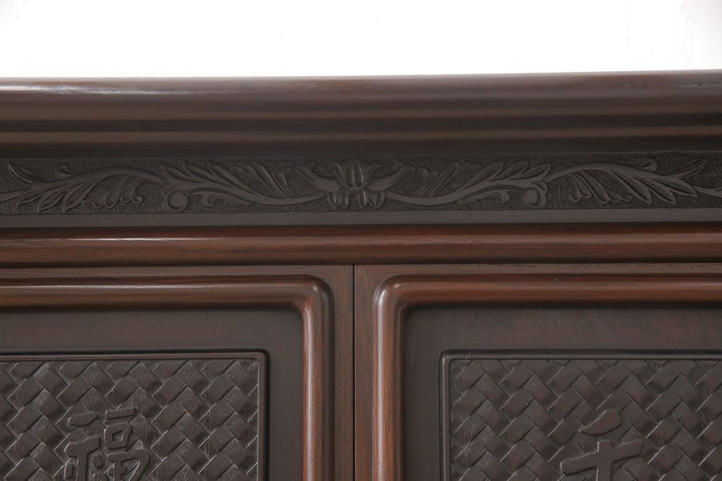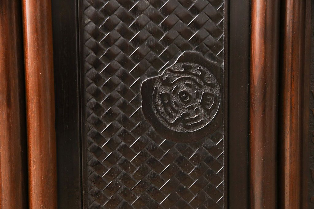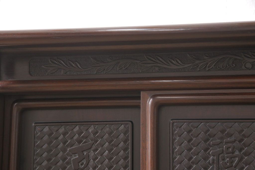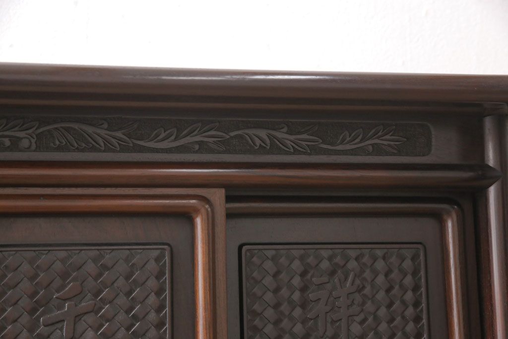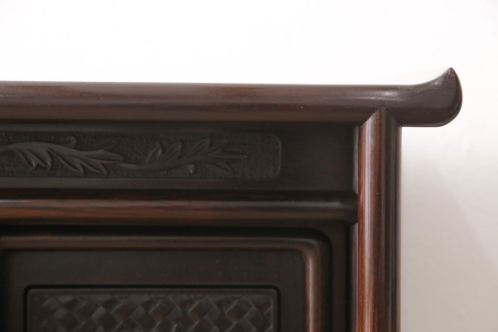 和箪笥 > 中古 美品 伝統工芸家具 大阪唐木指物 漆塗り 細やかな彫りの意匠が見事な総紫檀(シタン)材製の飾り棚(茶棚、収納棚、戸棚)(定価約80万円)(R-052156)