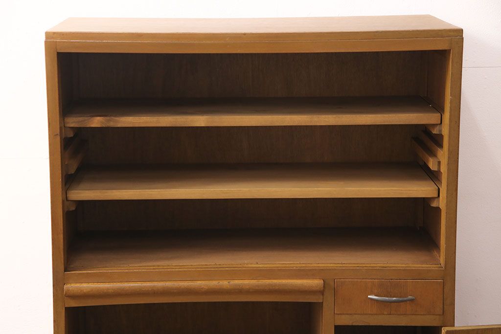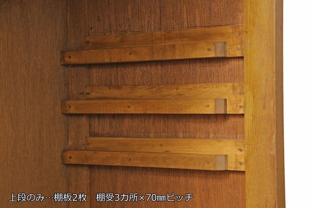 棚板は取り外しできます。上段のみ棚板は2枚あります。棚受けは3ヶ所、70mmピッチで調整できます。棚幅サイズのものが1枚の作りです。