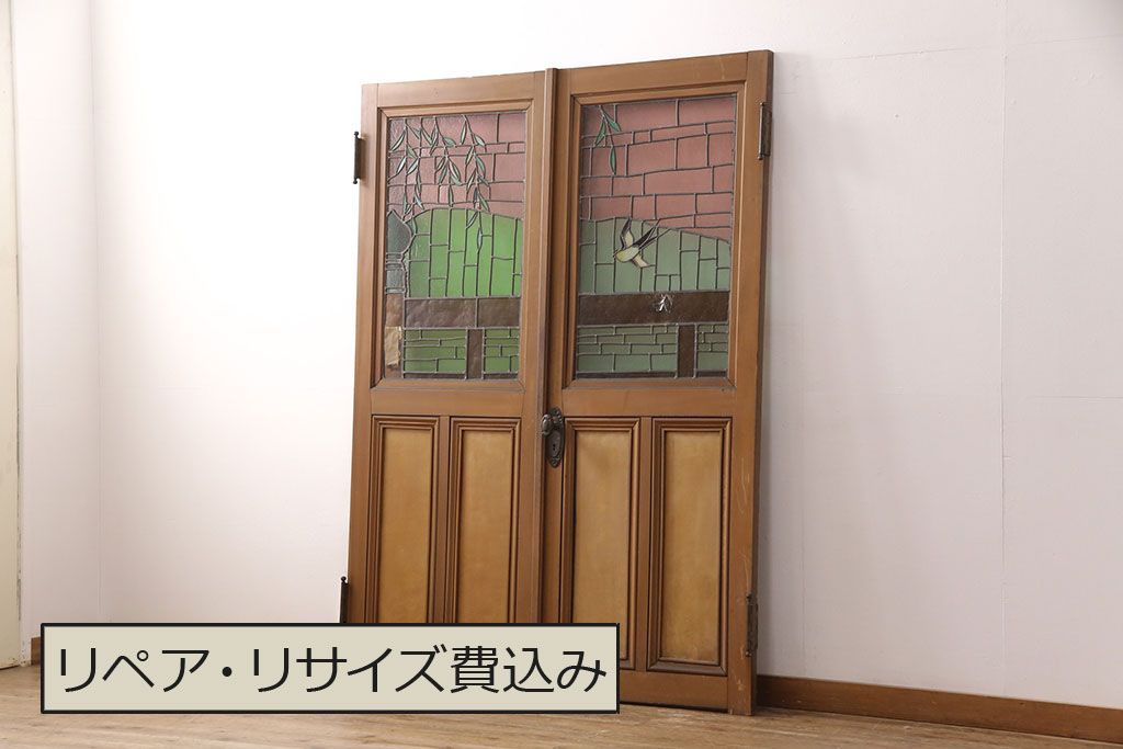 アンティーク建具 国産 ノスタルジックな雰囲気漂うステンドグラス入り両開きドア(玄関ドア、ガラス戸、ガラス扉)(R-051888)