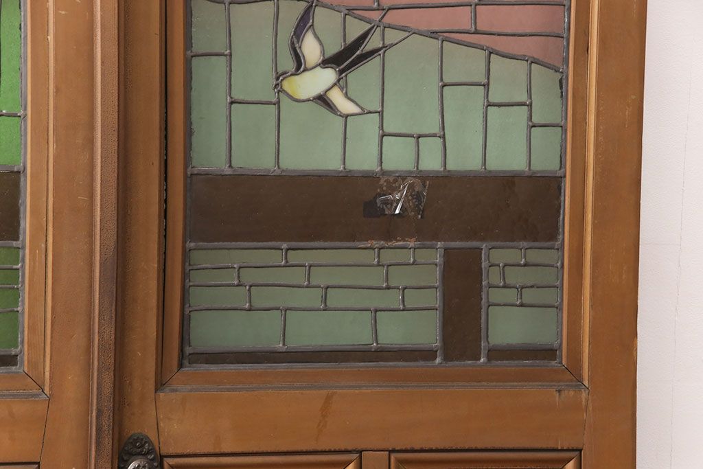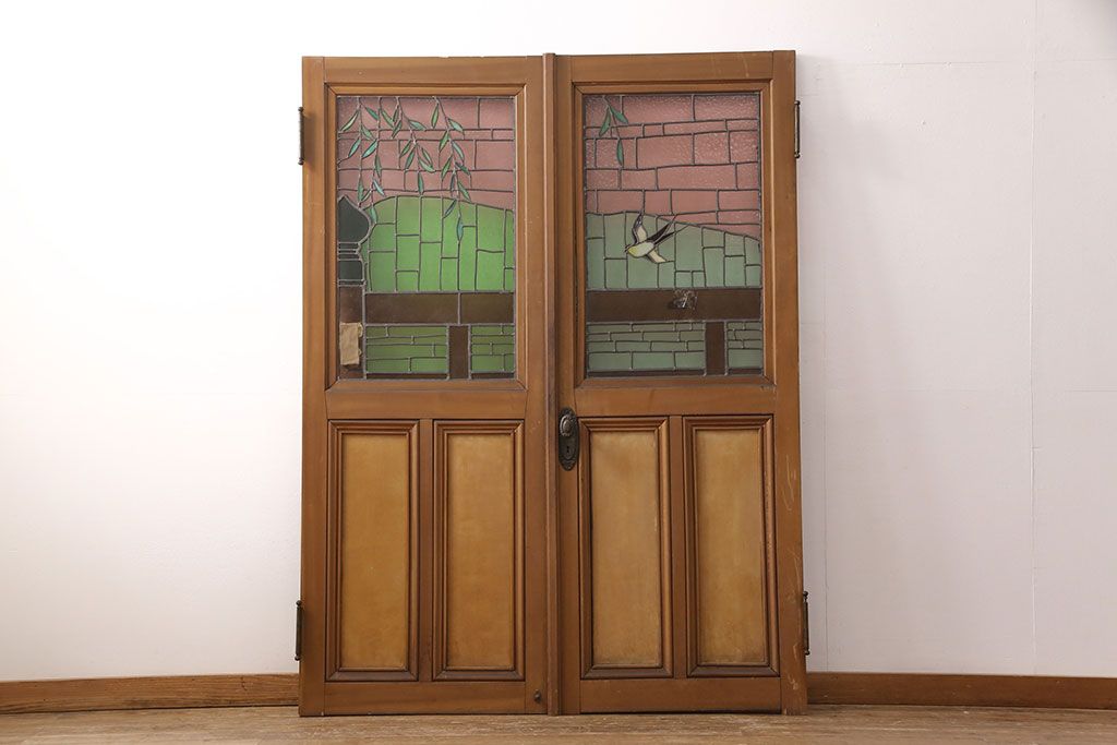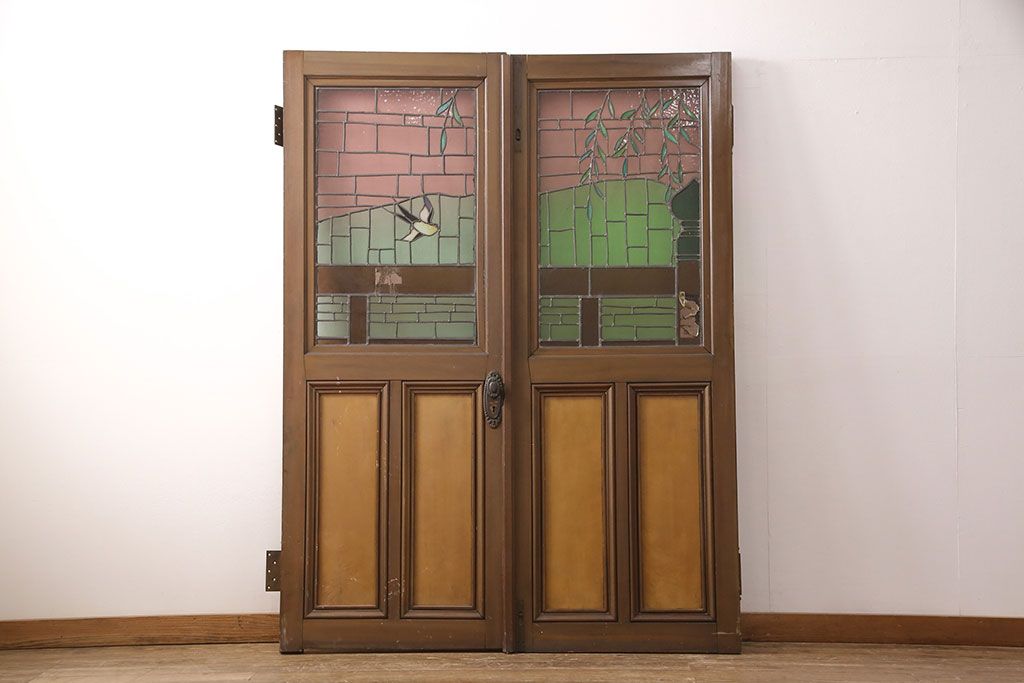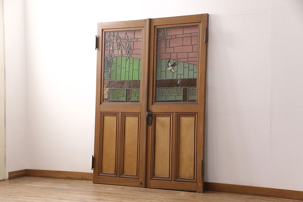 ドア・建具> ドア・扉 > アンティーク建具 国産 ノスタルジックな雰囲気漂うステンドグラス入り両開きドア(玄関ドア、ガラス戸、ガラス扉)(R-051888)
