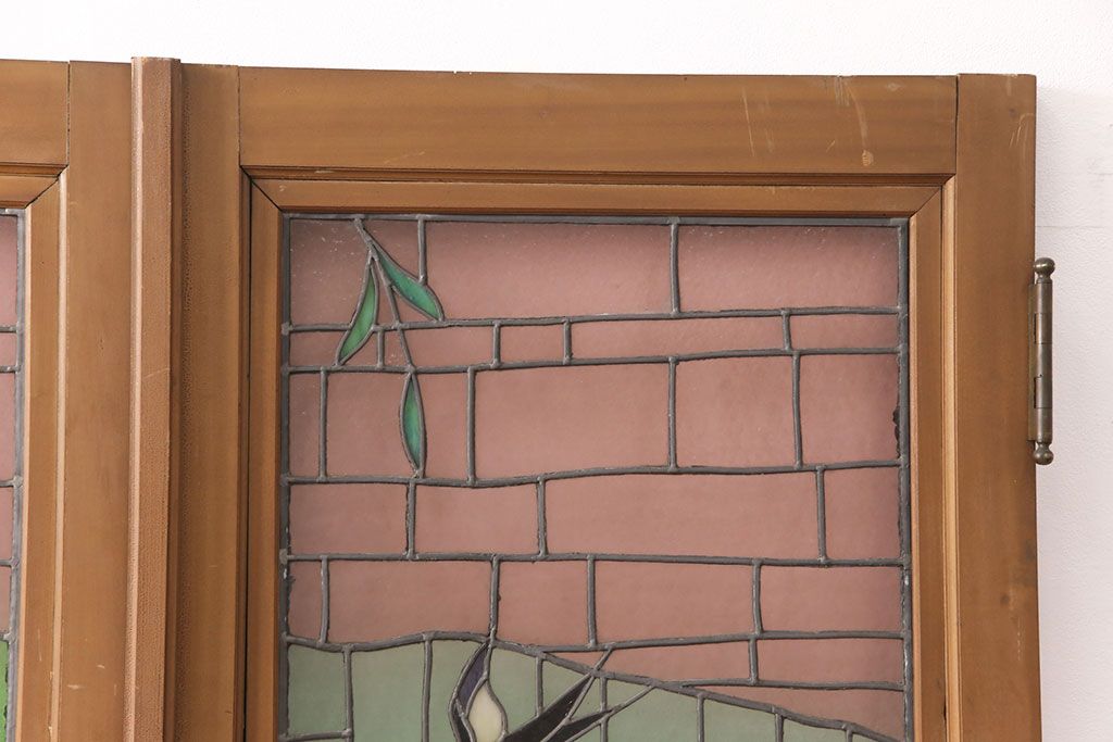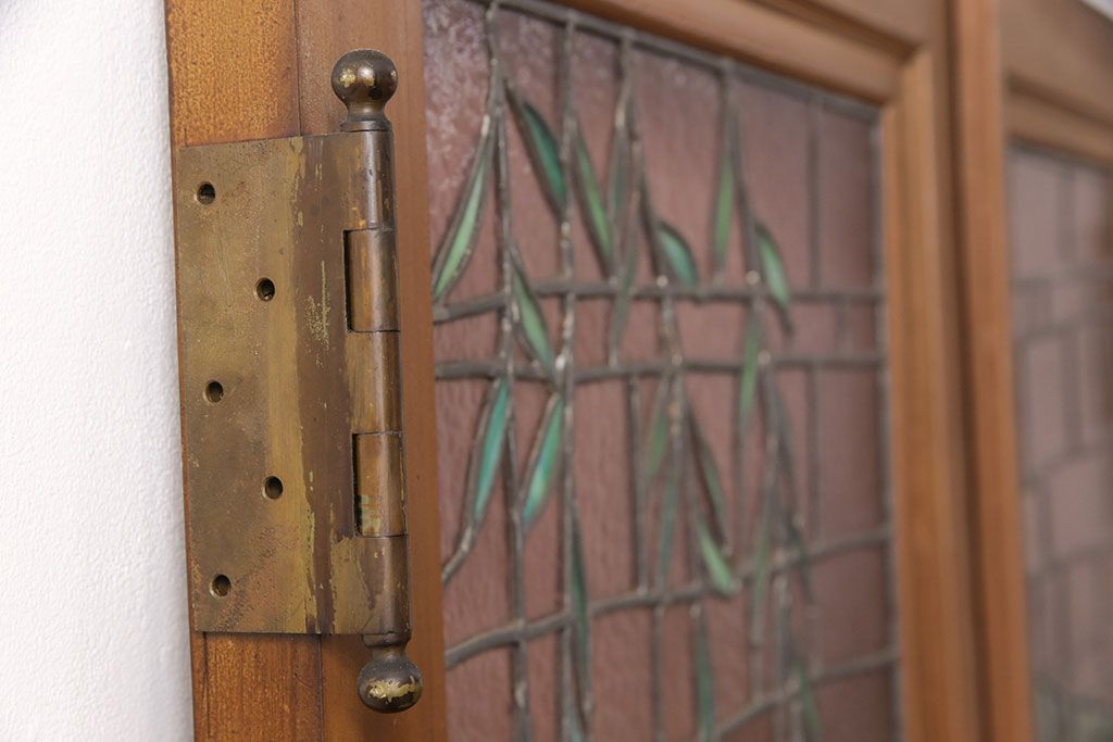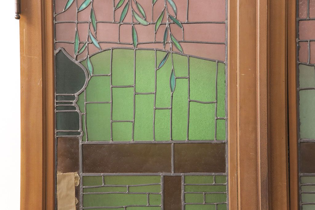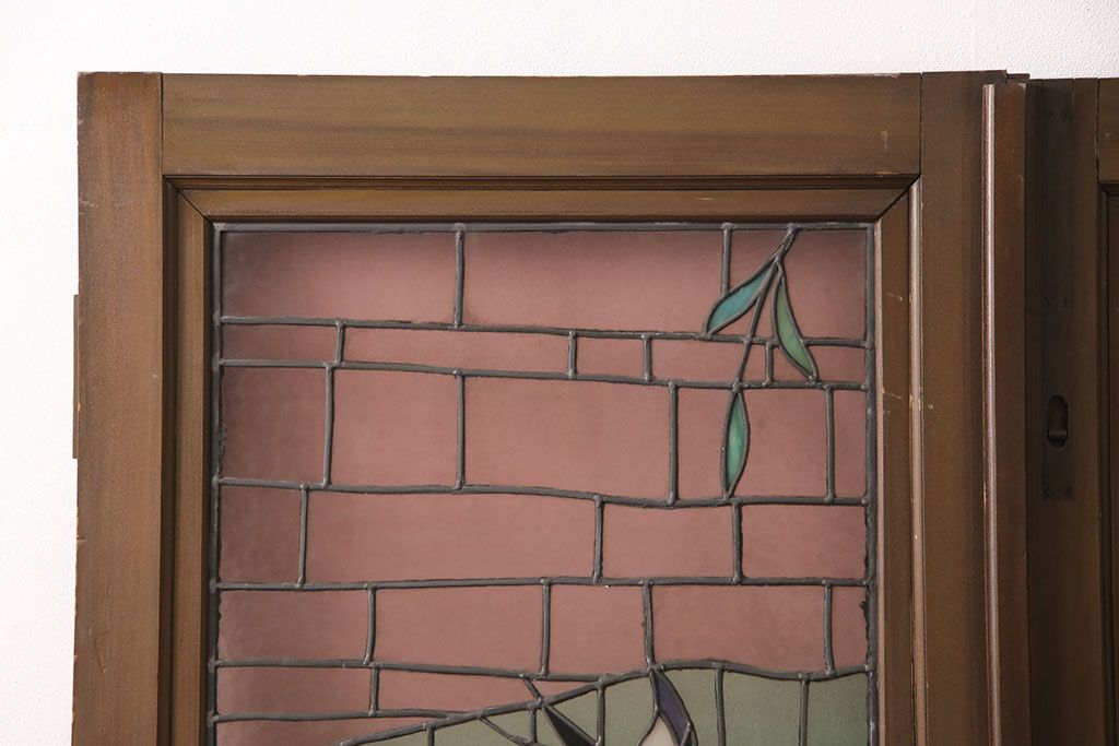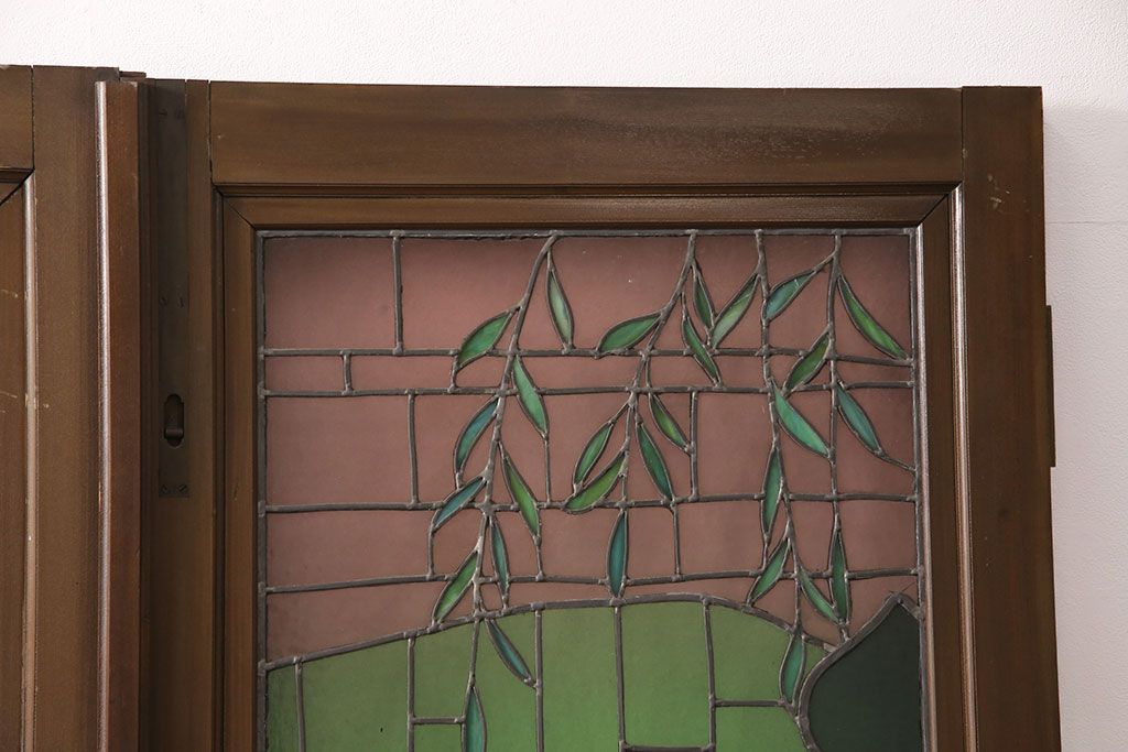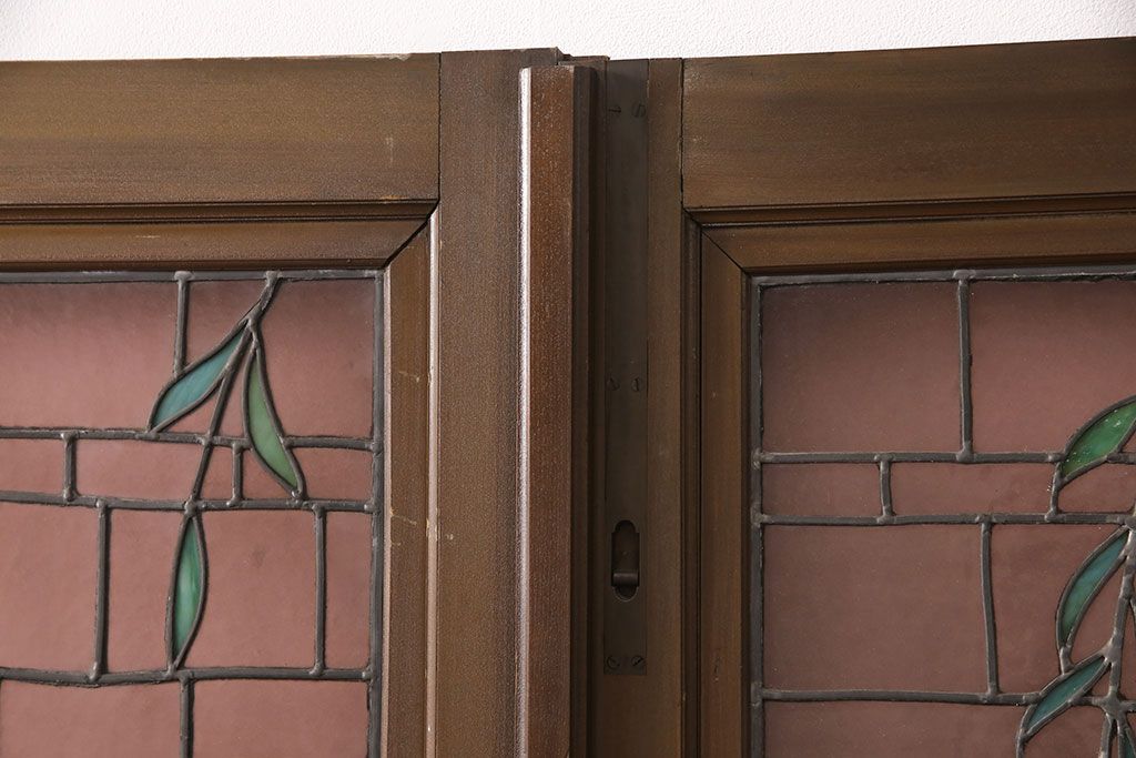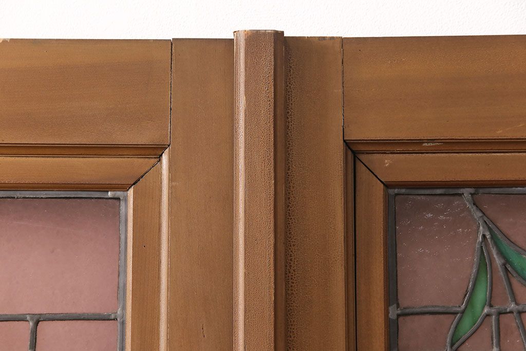 ドア・建具> ガラス戸 > アンティーク建具 国産 ノスタルジックな雰囲気漂うステンドグラス入り両開きドア(玄関ドア、ガラス戸、ガラス扉)(R-051888)
