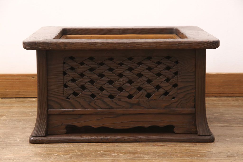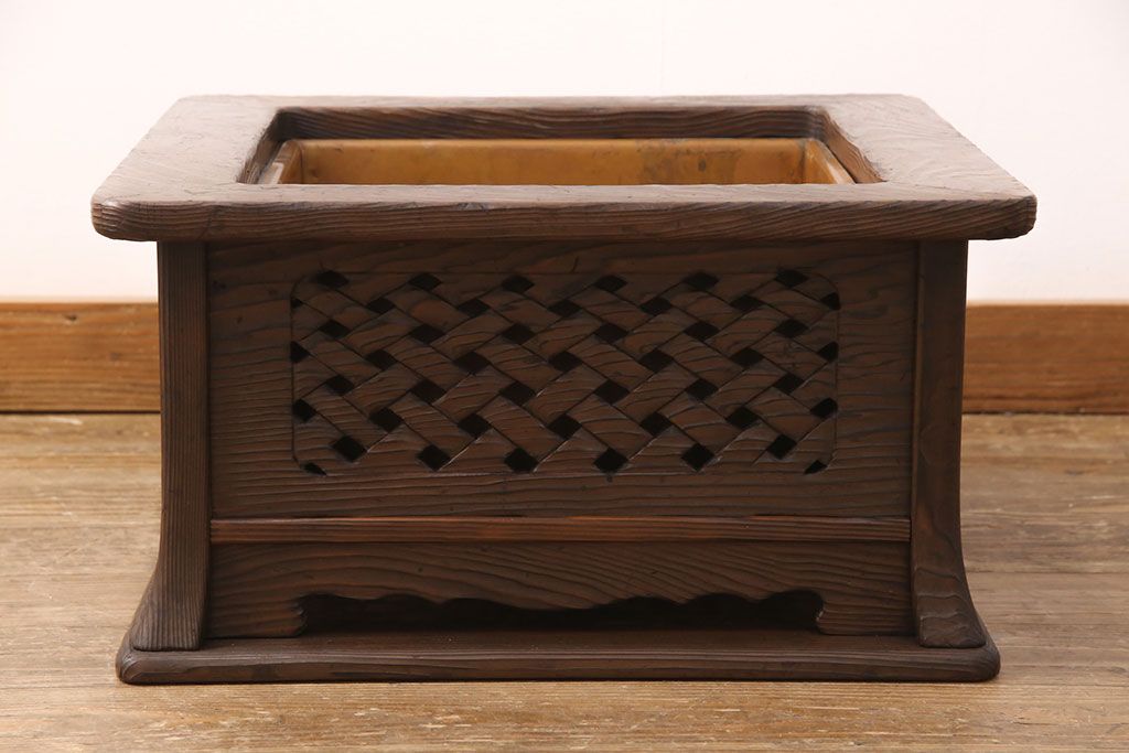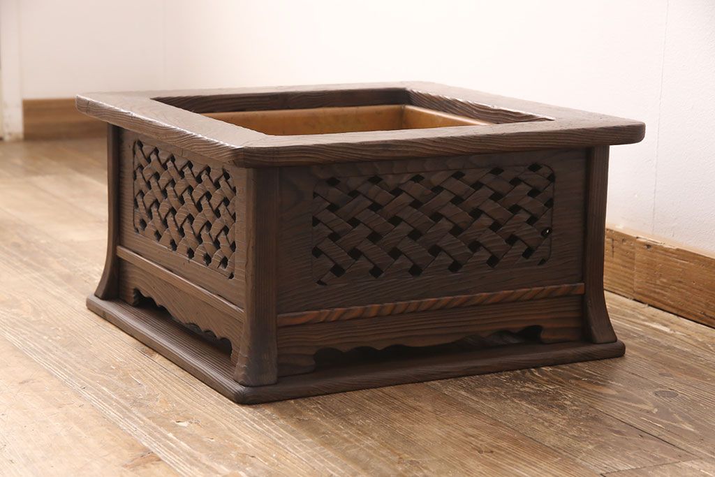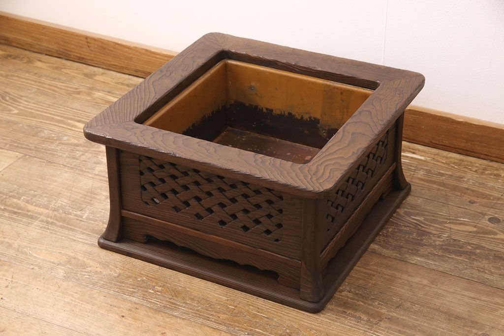 和製アンティーク 高級杉材 透かし彫りが美しい高級火鉢(木製火鉢、角火鉢)(R-052663)です。