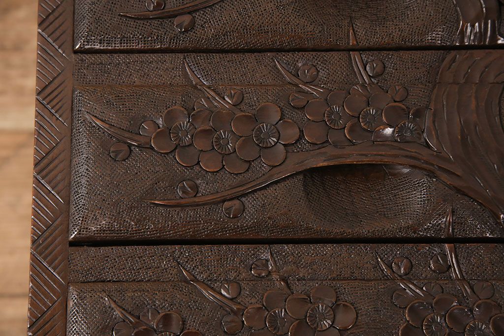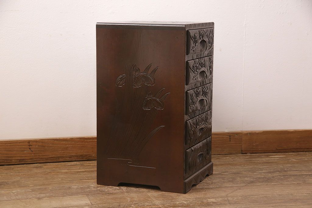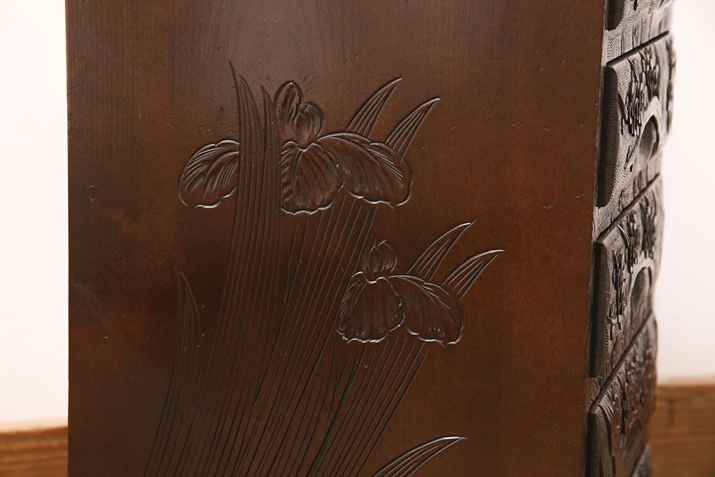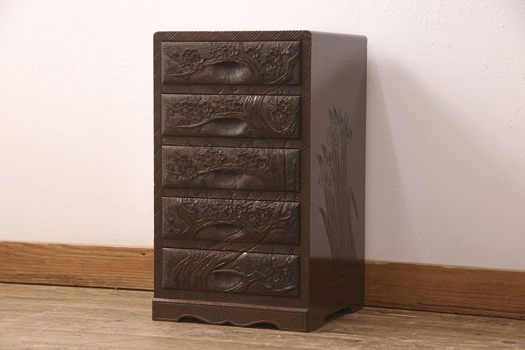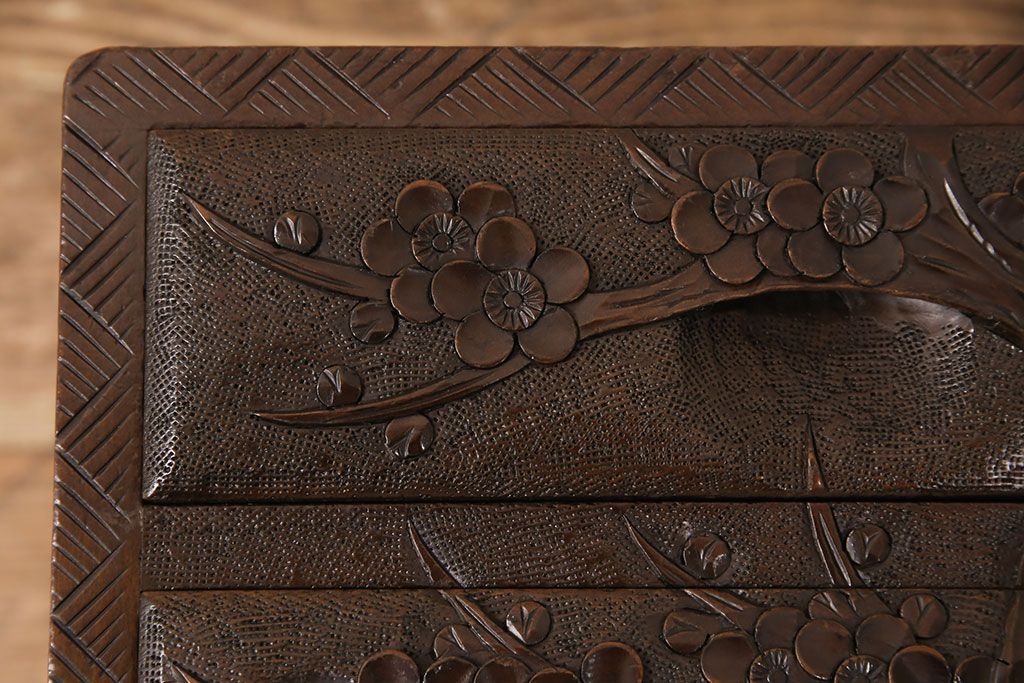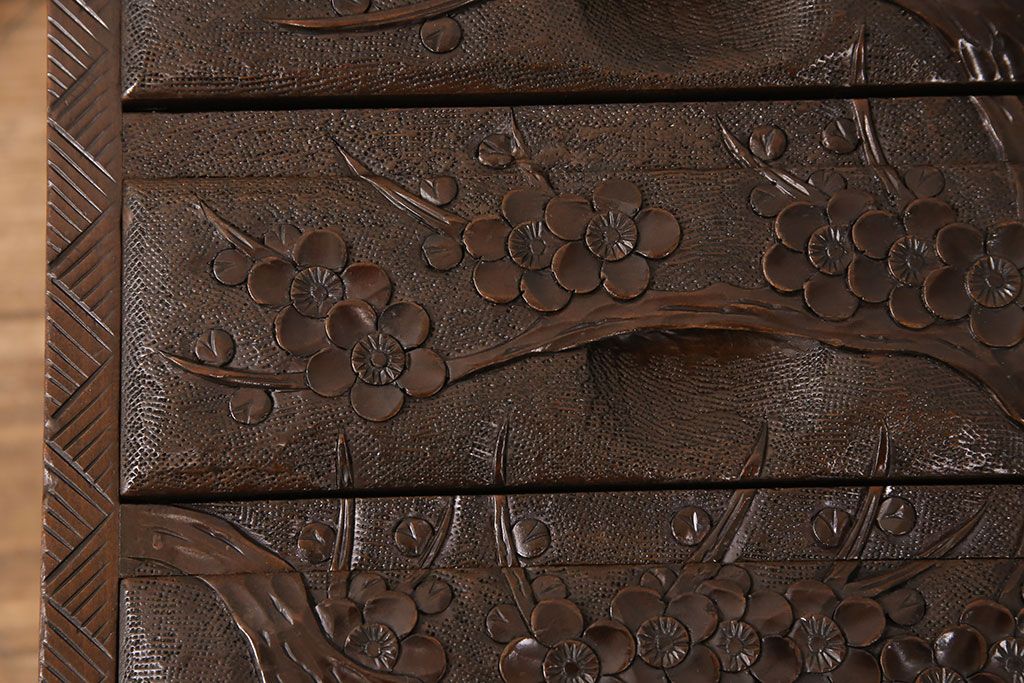 中古 伝統工芸 日光彫り 三種の花が楽しめる小引き出し(小物収納、卓上収納)(R-052609)