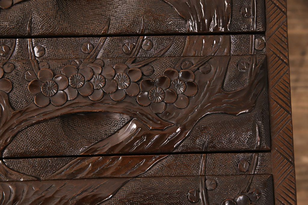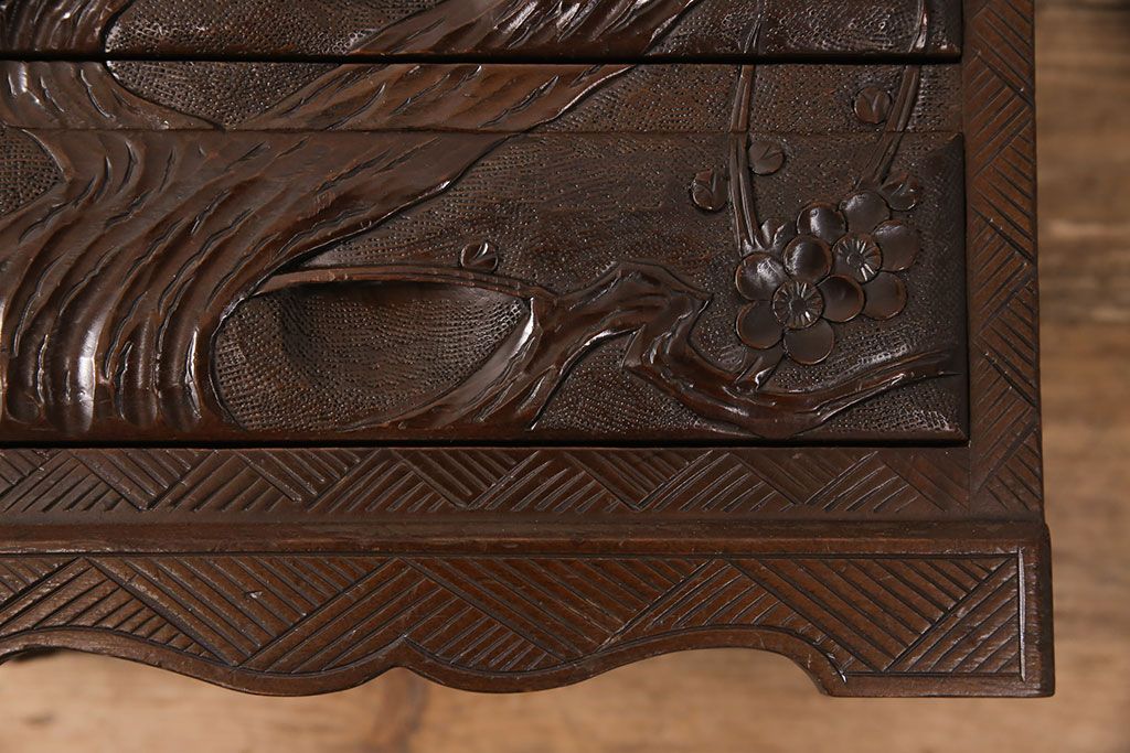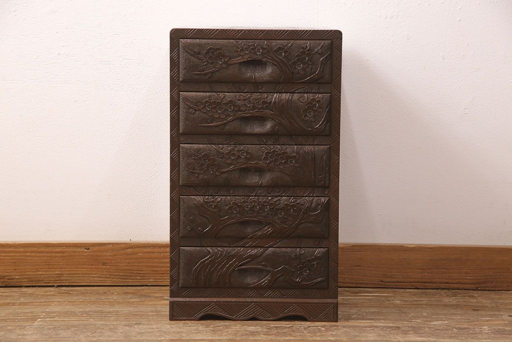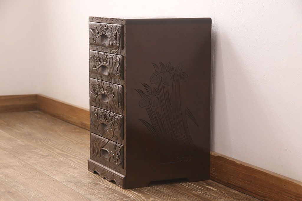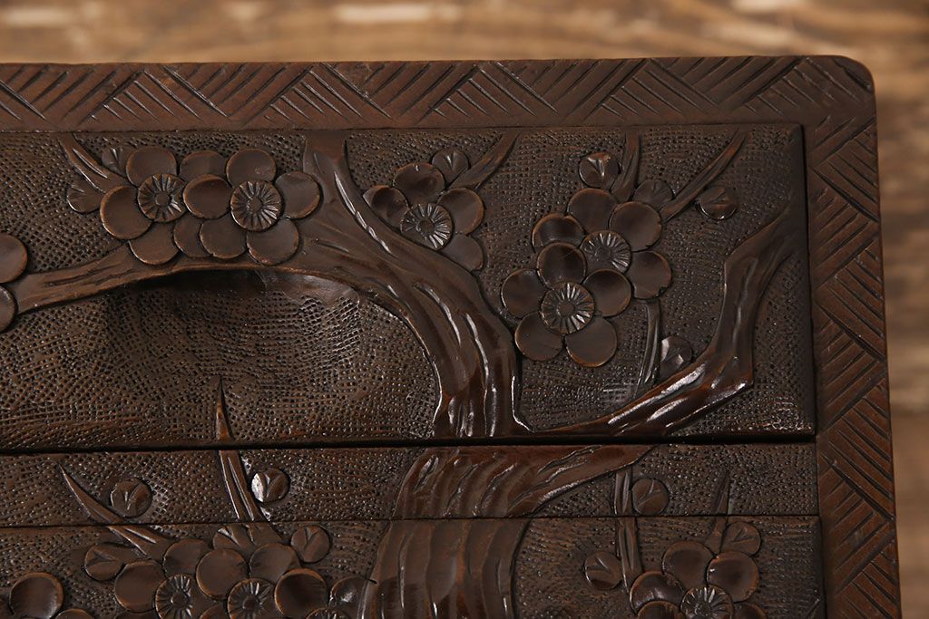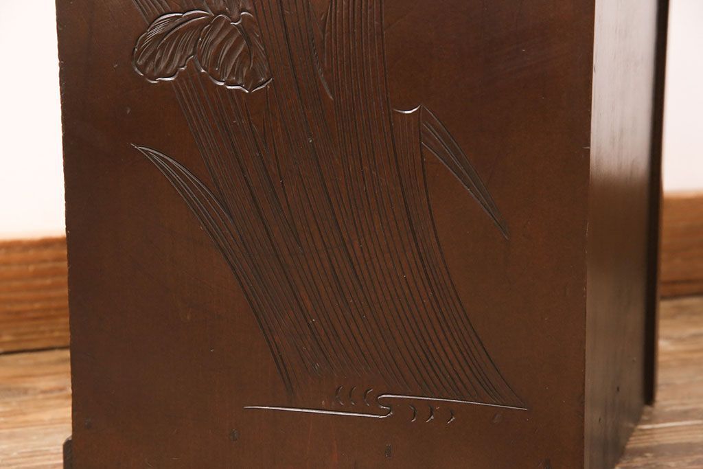 中古 伝統工芸 日光彫り 三種の花が楽しめる小引き出し(小物収納、卓上収納)(R-052609)