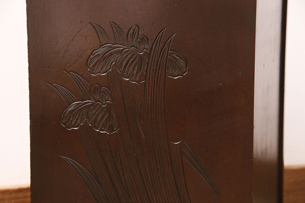 水辺に咲く花菖蒲の彫刻が彫られています。