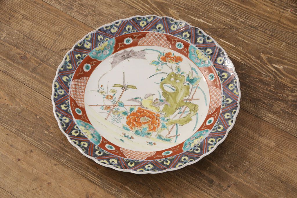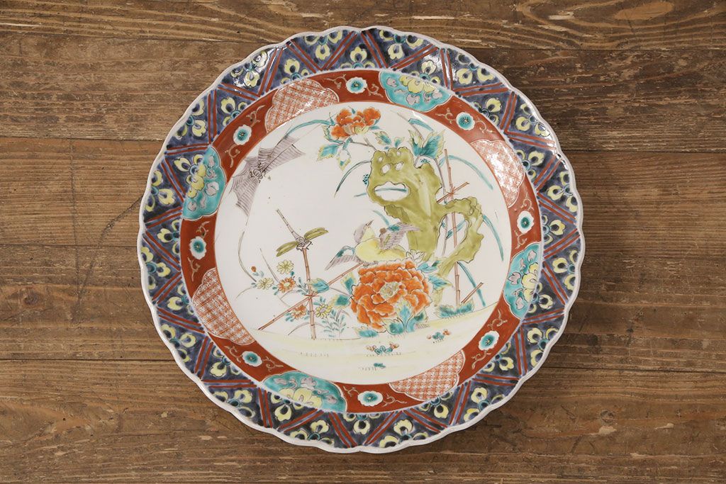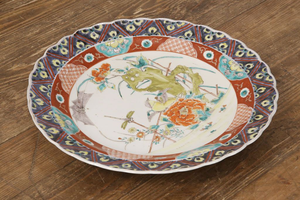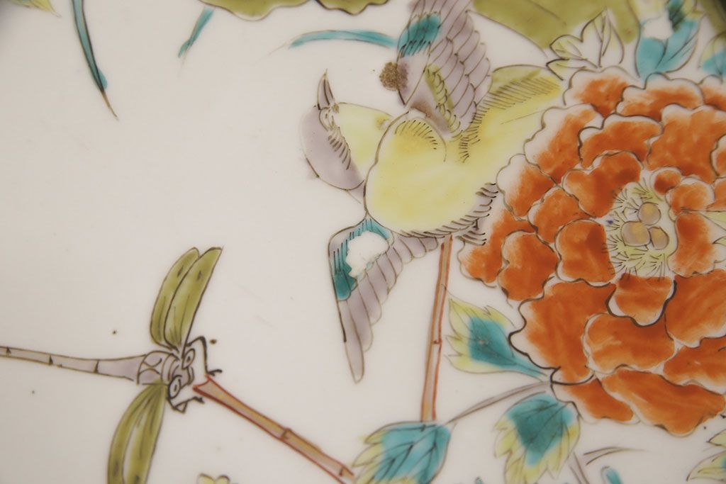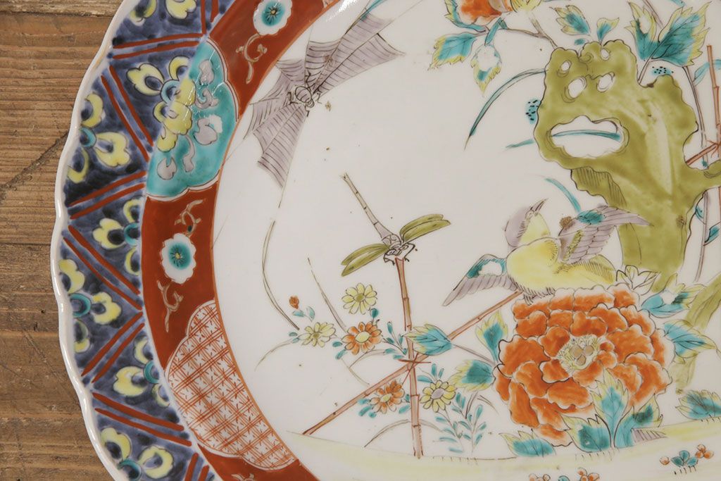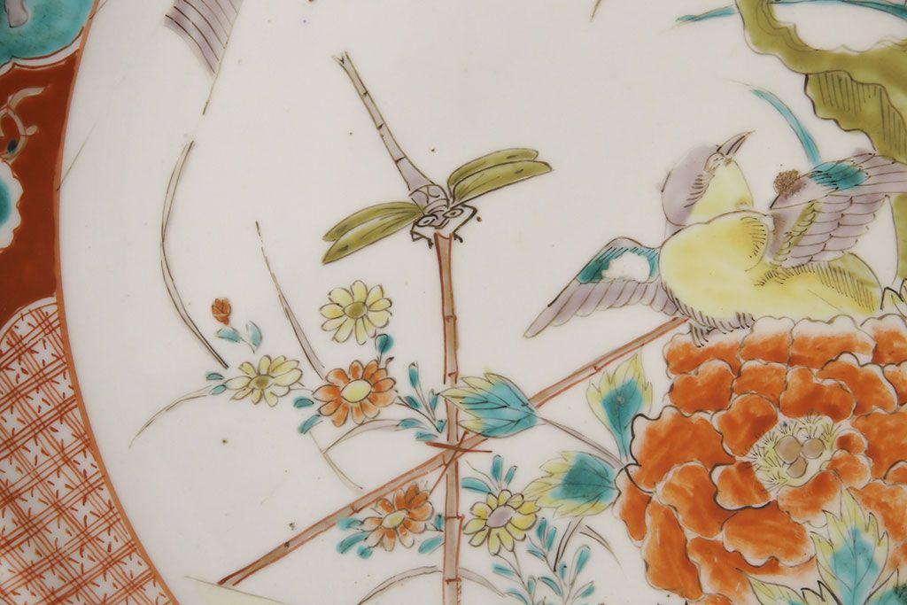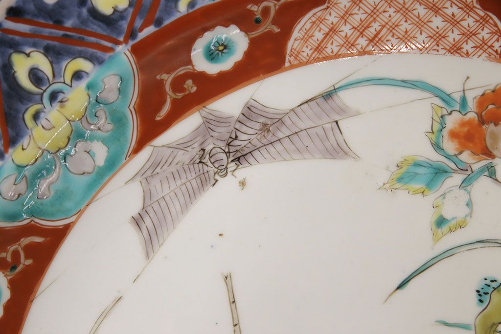 ラフジュ工房> 和食器・茶道具 > 江戸期 古伊万里 花鳥にトンボとクモ 色絵一尺四寸大皿(和食器)(R-052419)