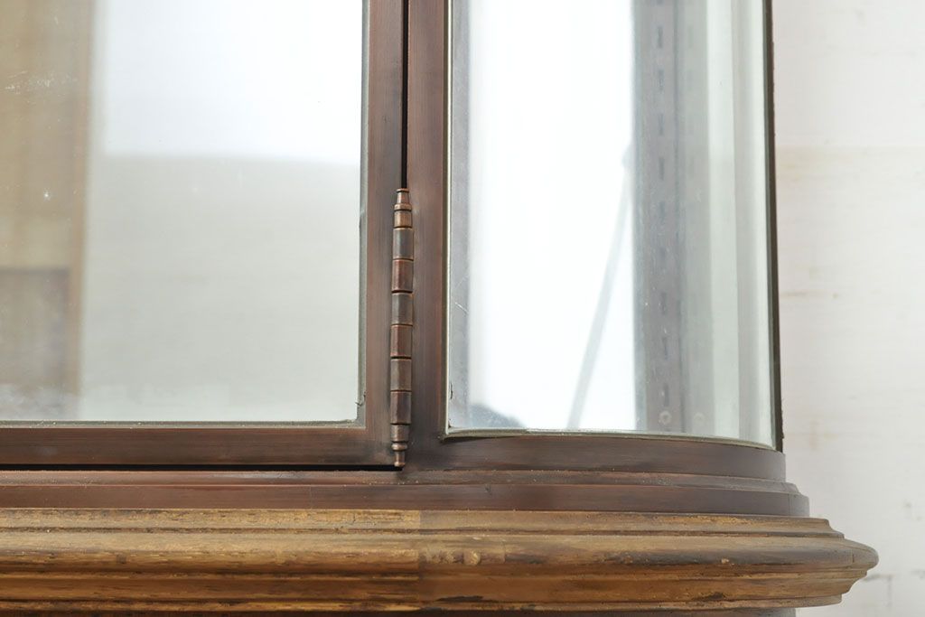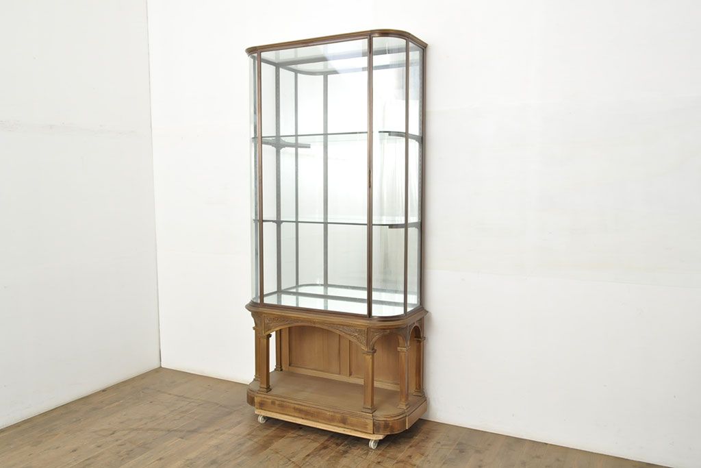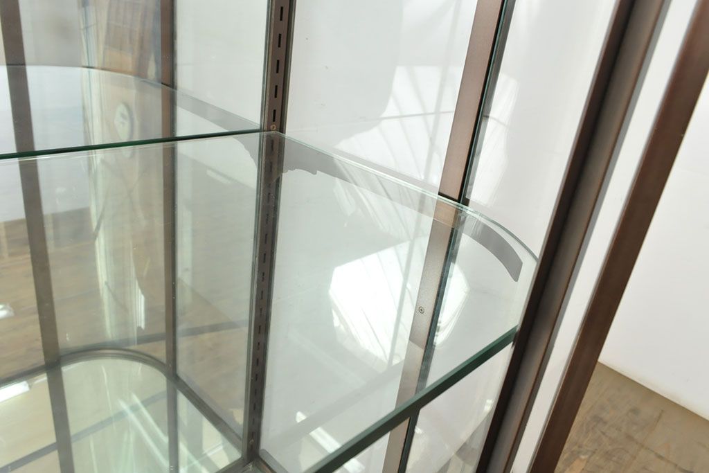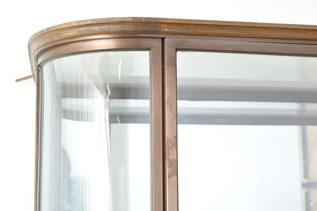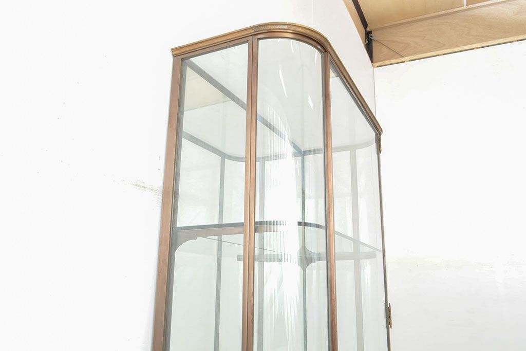 フランスビンテージ 激レアデザイン! Rガラス 真鍮枠 品のある佇まいが目を引く縦型ガラスケース(ショーケース、収納棚、飾り棚、キャビネット、ヴィンテージ、曲げガラス)(R-052732)