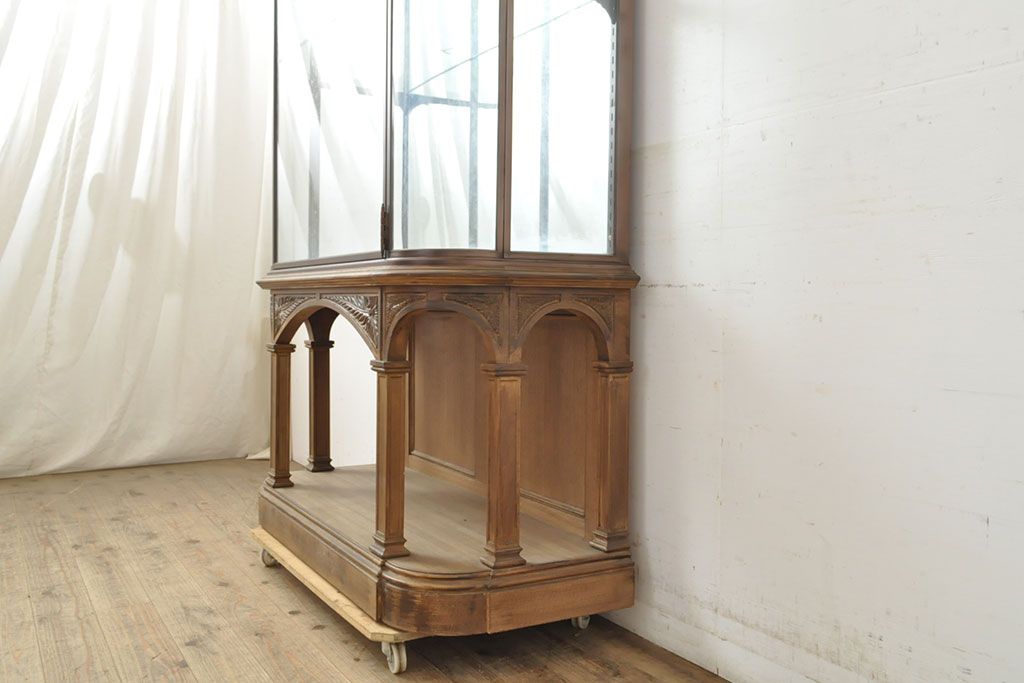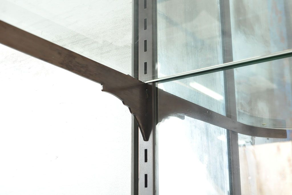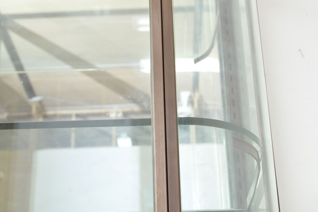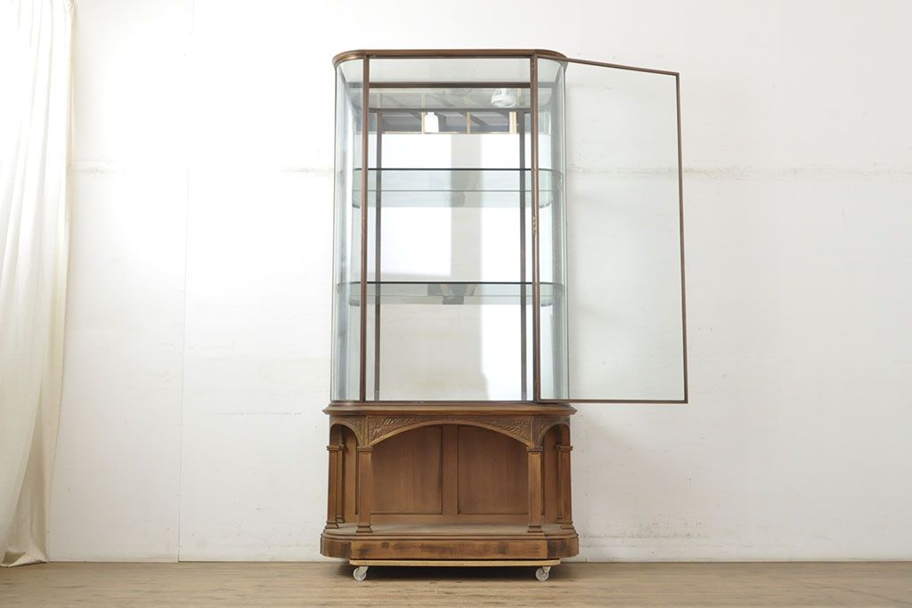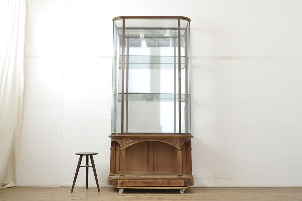 フランスビンテージ 激レアデザイン! Rガラス 真鍮枠 品のある佇まいが目を引く縦型ガラスケース(ショーケース、収納棚、飾り棚、キャビネット、ヴィンテージ、曲げガラス)(R-052732)
