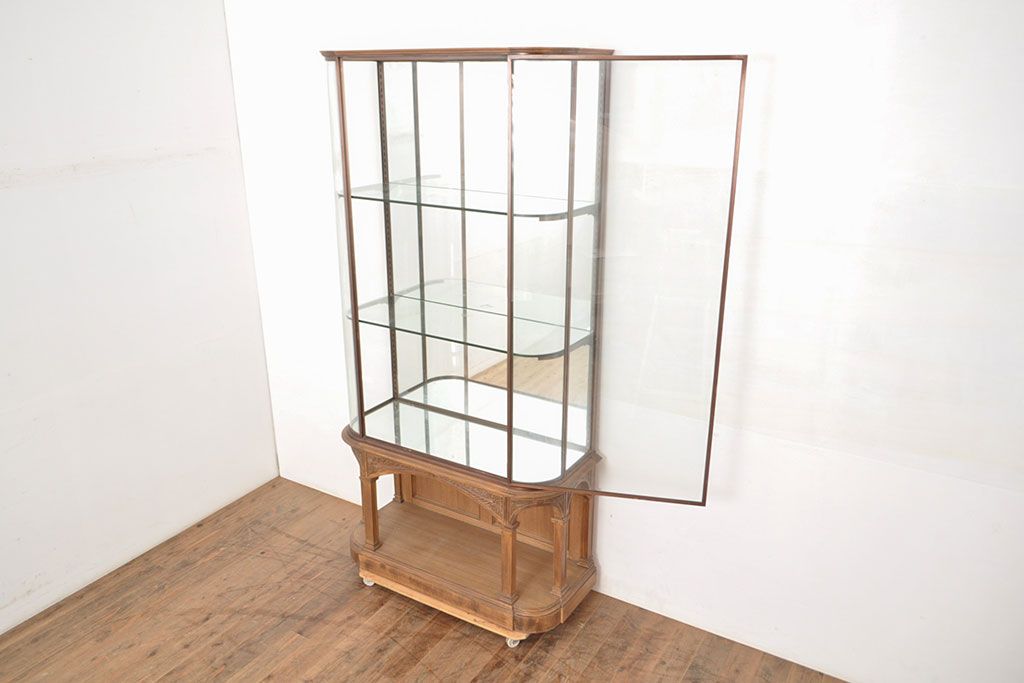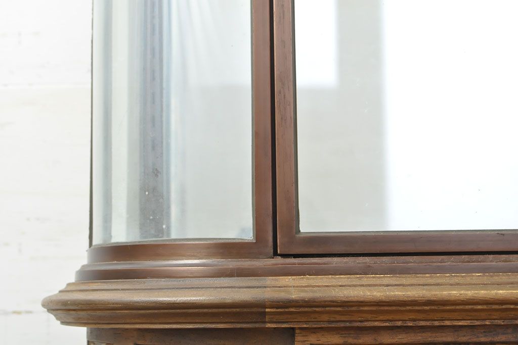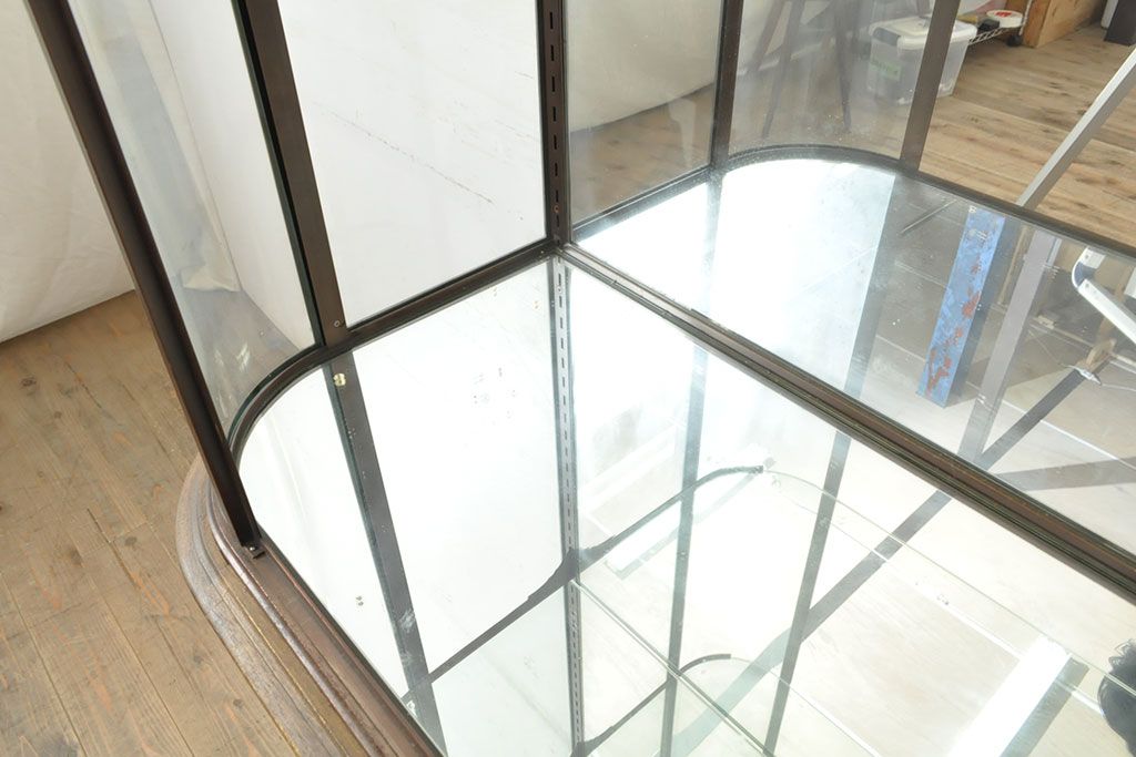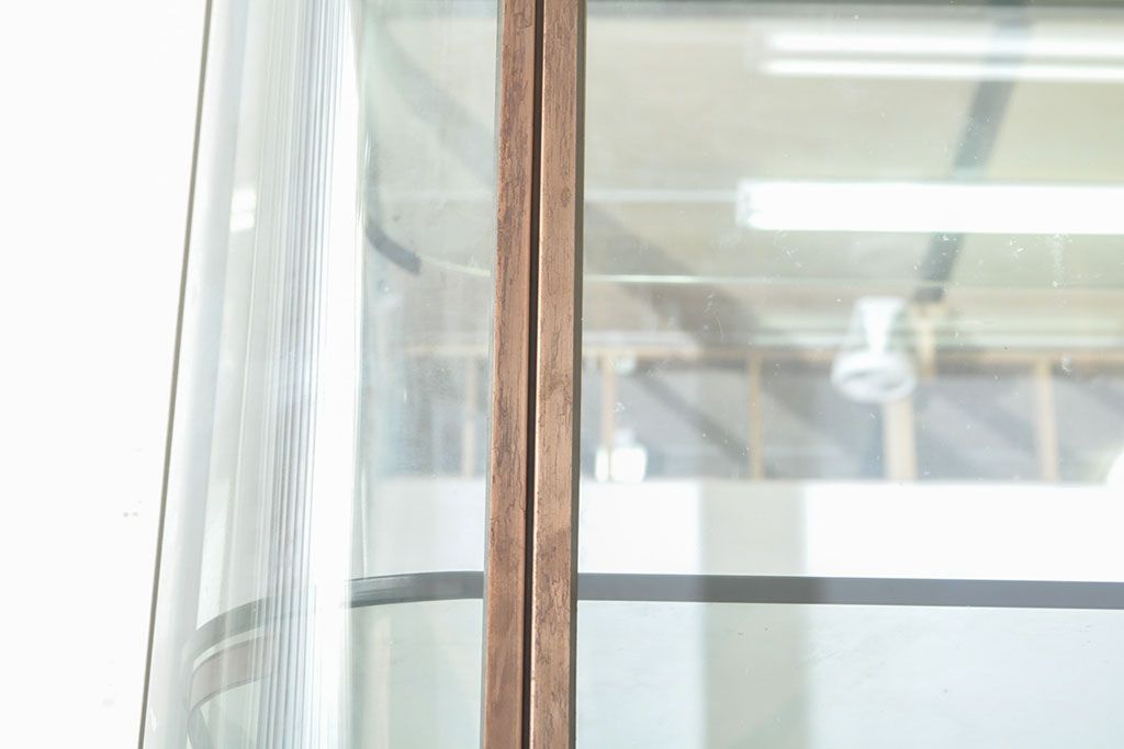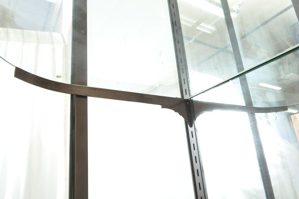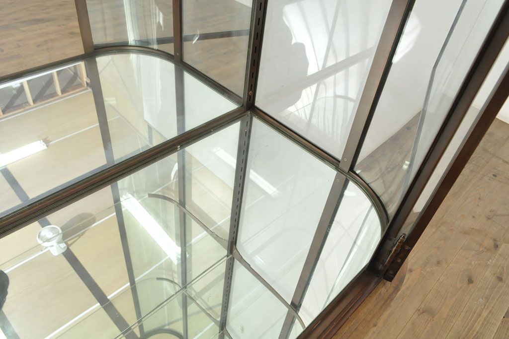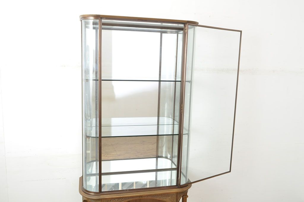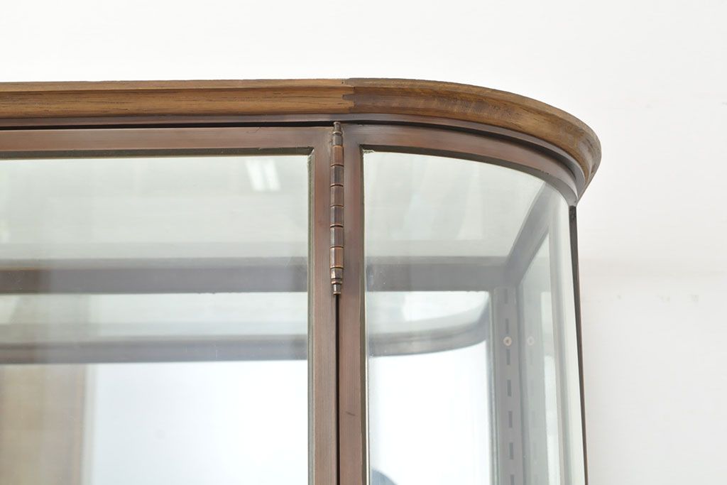 ラフジュ工房> ガラスケース・ショーケース > フランスビンテージ 激レアデザイン! Rガラス 真鍮枠 品のある佇まいが目を引く縦型ガラスケース(ショーケース、収納棚、飾り棚、キャビネット、ヴィンテージ、曲げガラス)(R-052732)