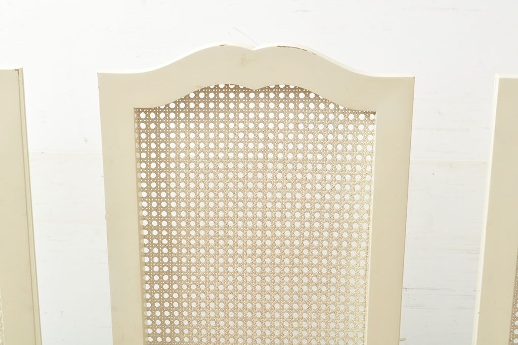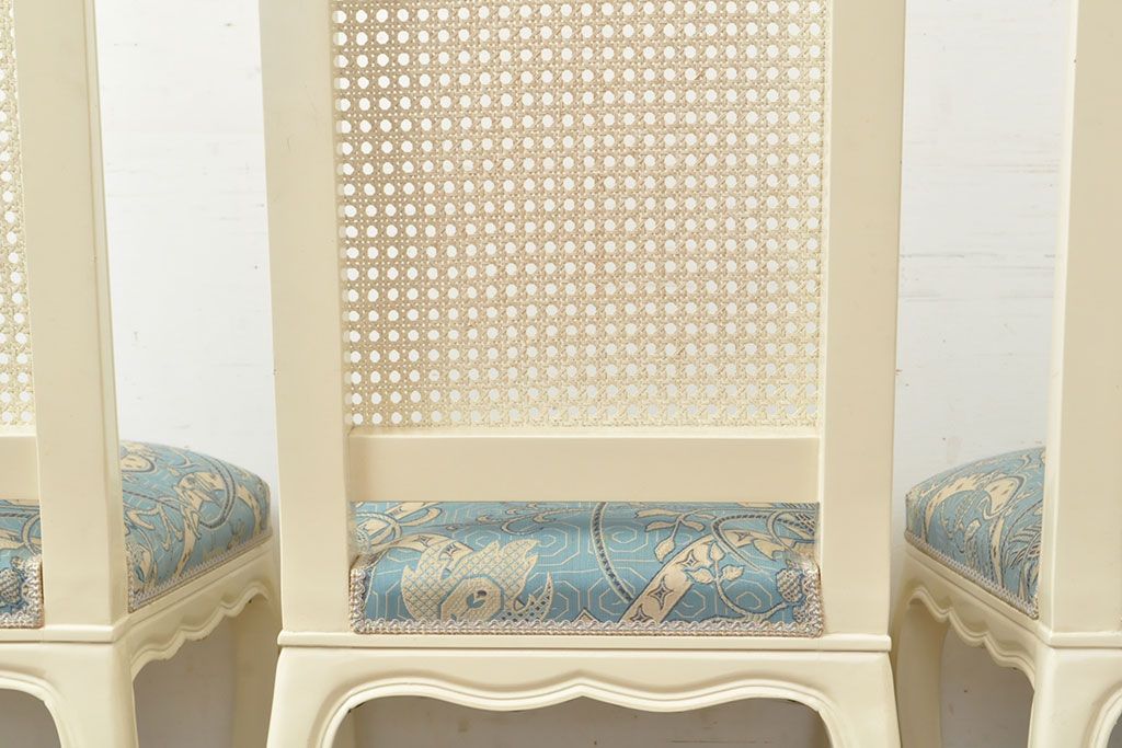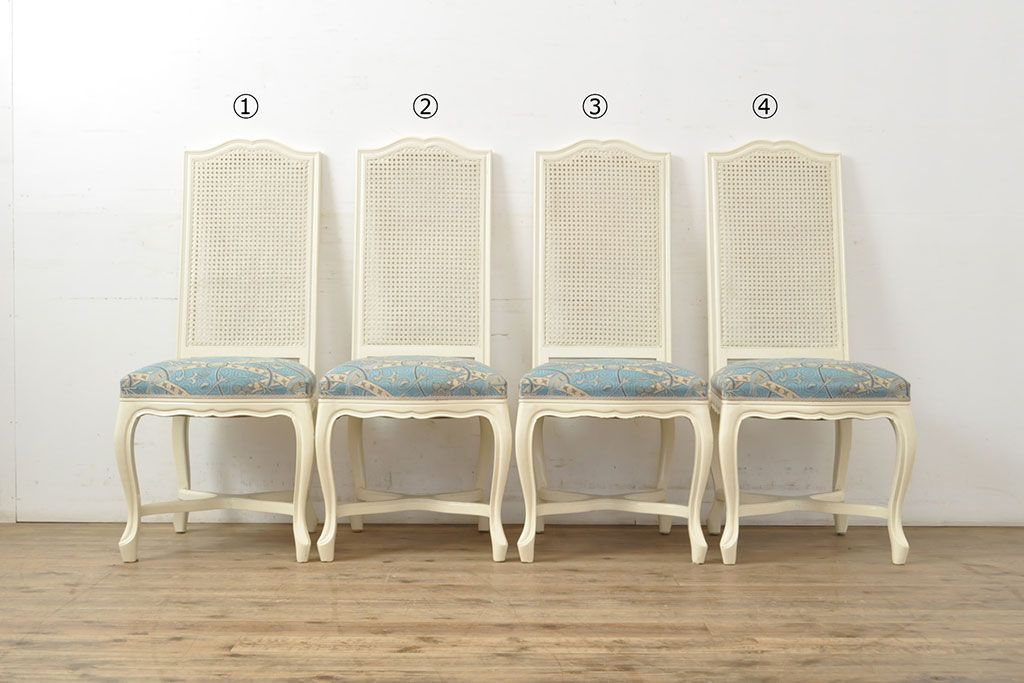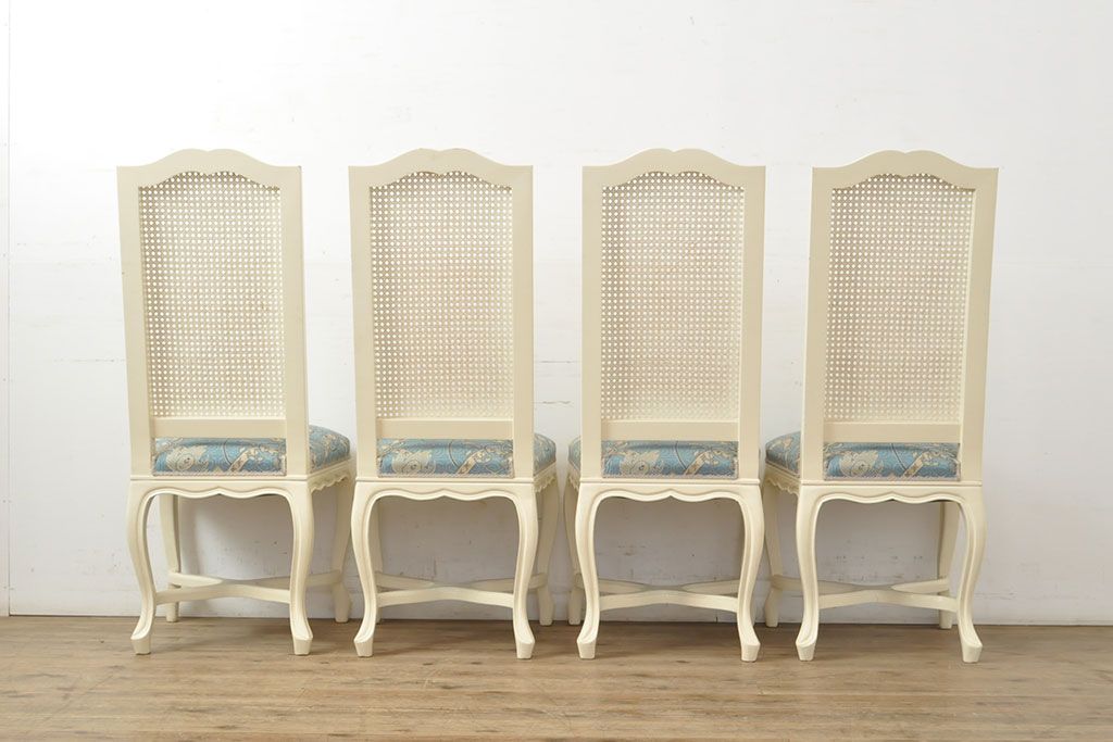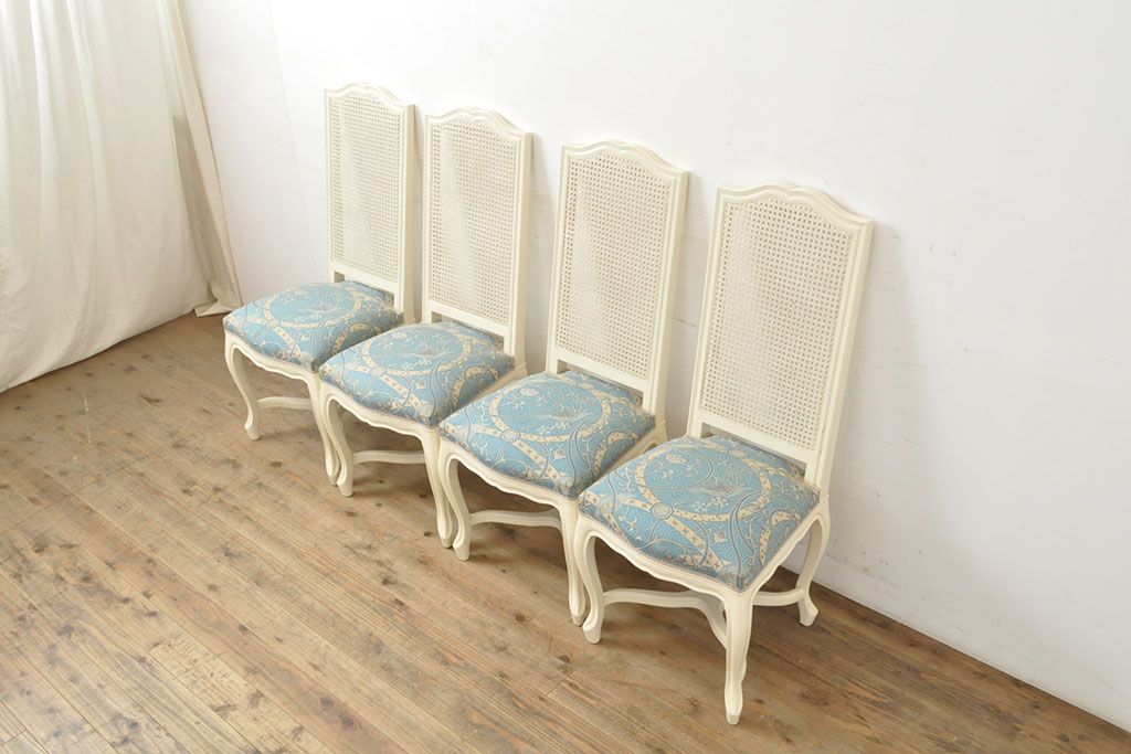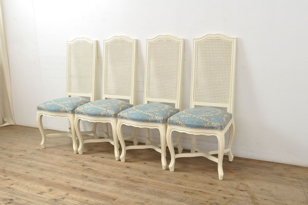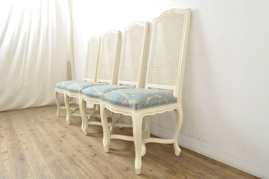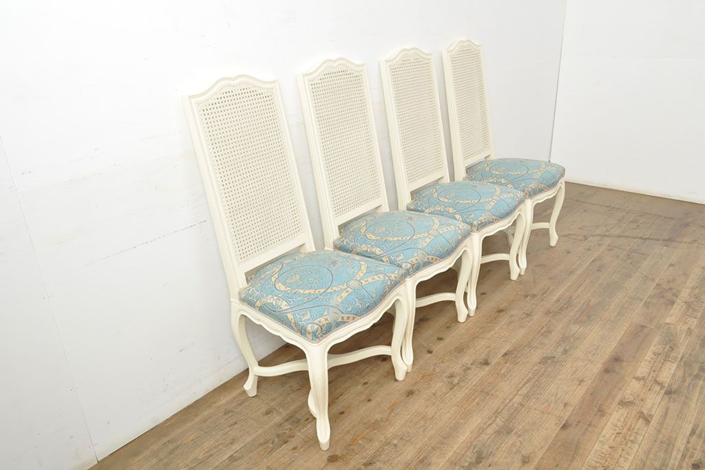 椅子・ベンチ> ダイニングチェア > 中古 フランス高級輸入家具 爽やかな色合いが美しいラタンバックチェア4脚セット(ダイニングチェア、椅子)(1脚定価 約12万円)(R-052718)