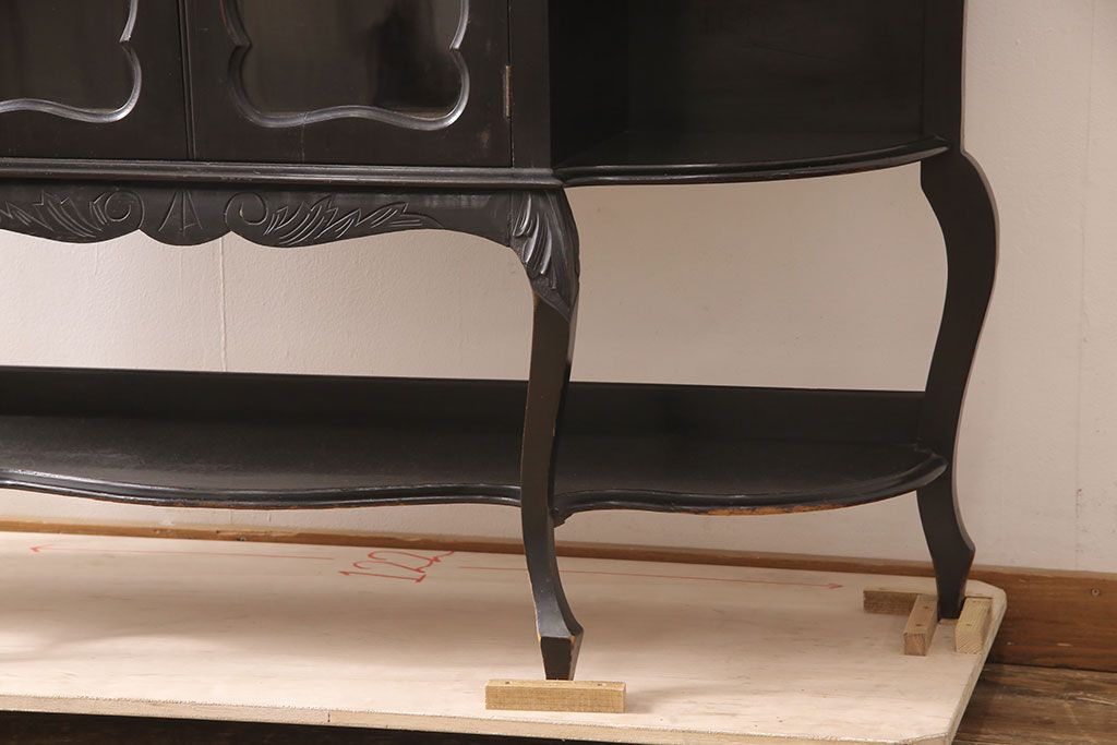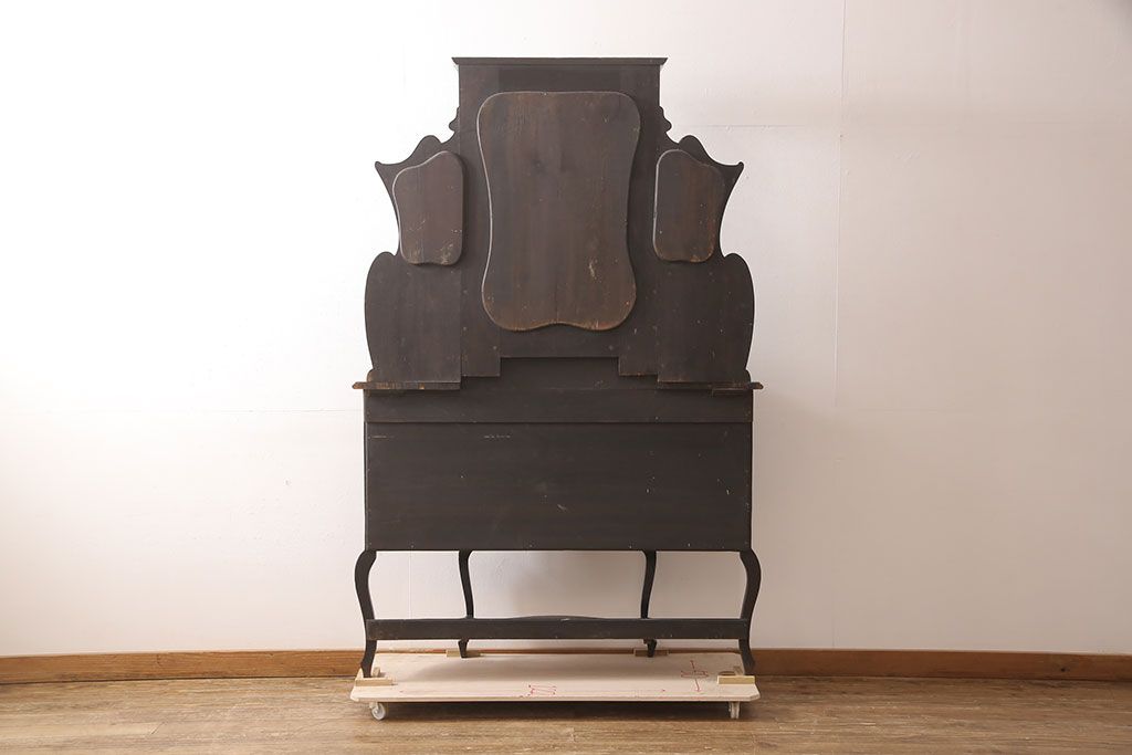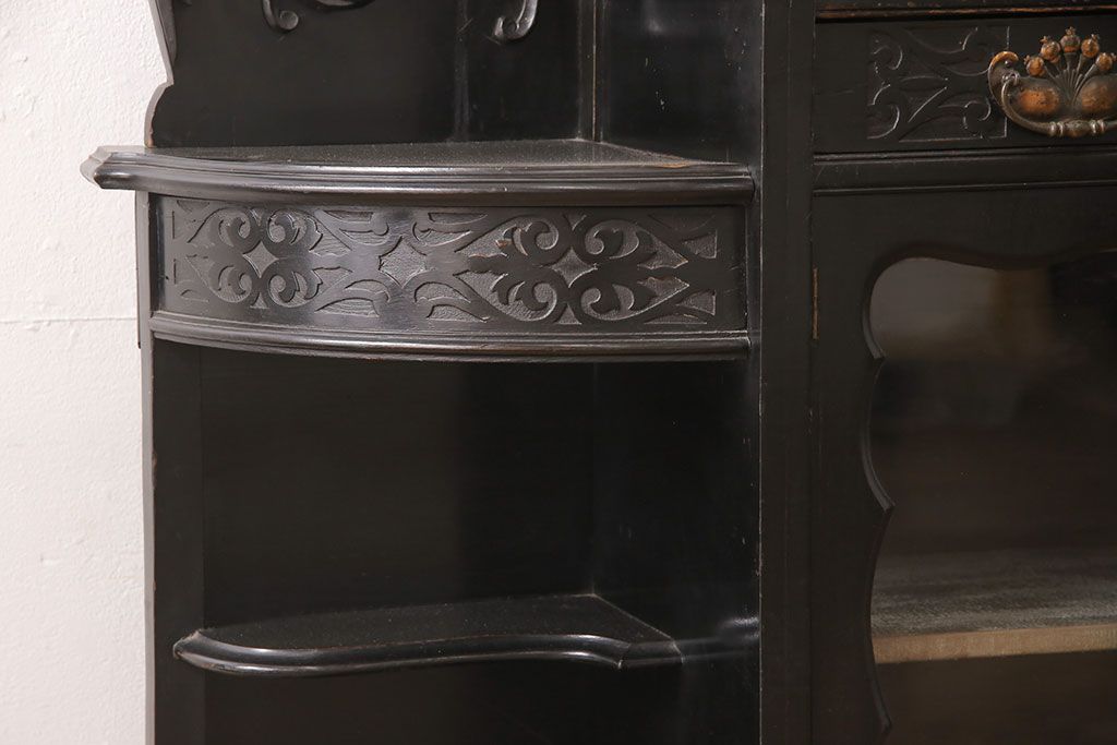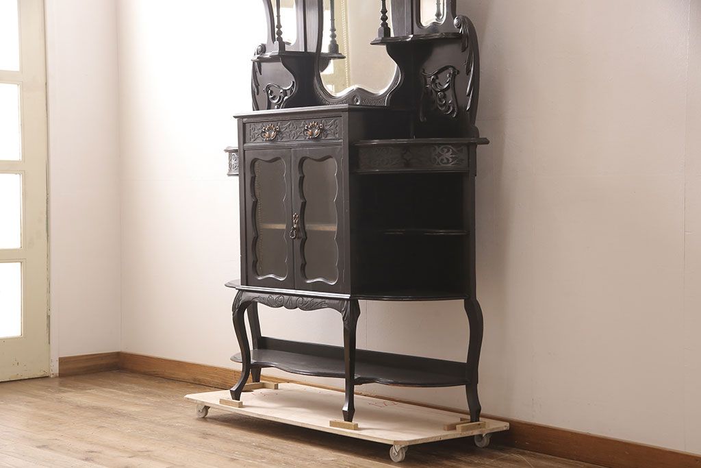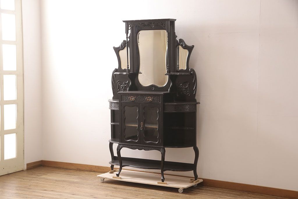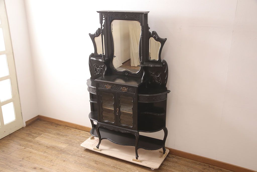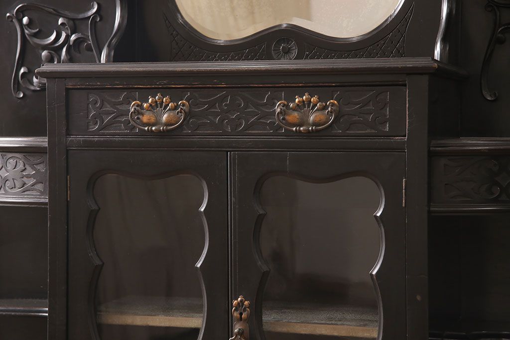 イギリスアンティーク ウォールナット材 細やかな彫刻と曲線のデザインが優雅なパーラーキャビネット(飾り棚、戸棚、ミラー)(R-052930)