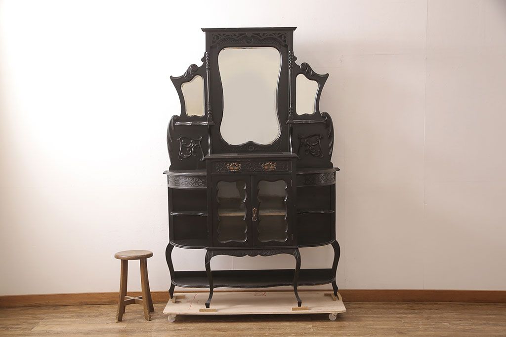 イギリスアンティーク ウォールナット材 細やかな彫刻と曲線のデザインが優雅なパーラーキャビネット(飾り棚、戸棚、ミラー)(R-052930)です。