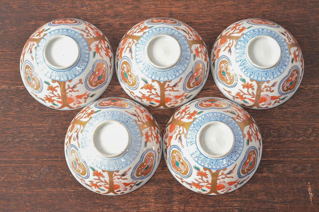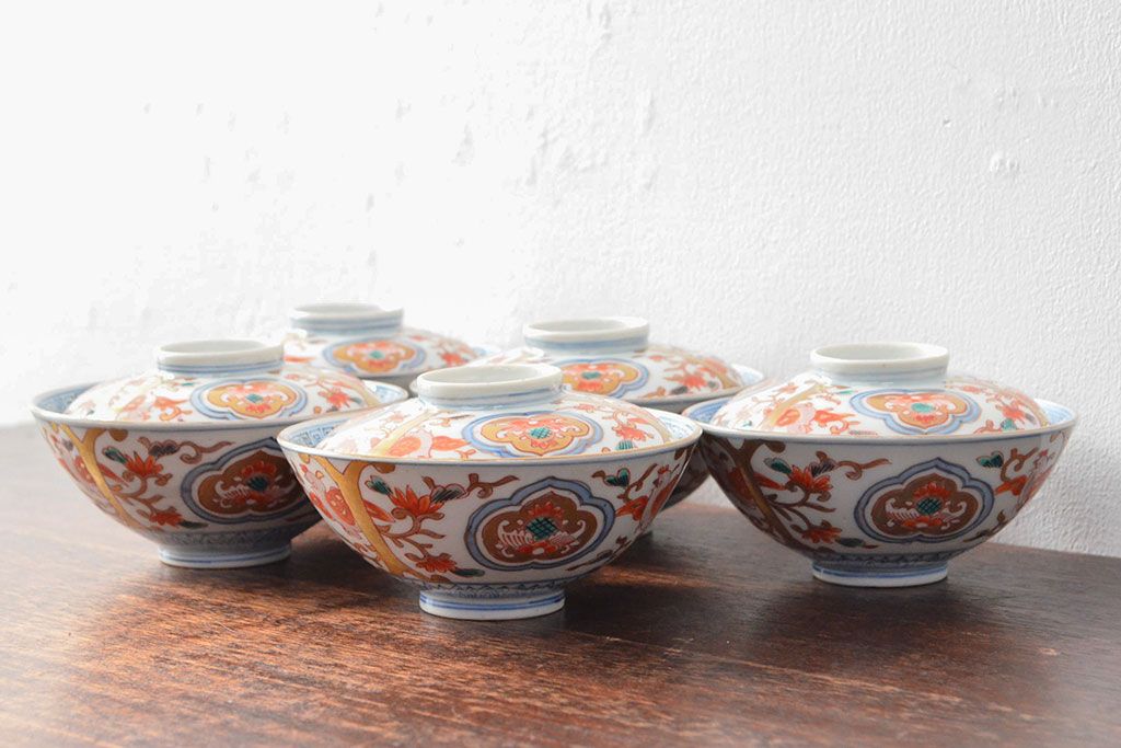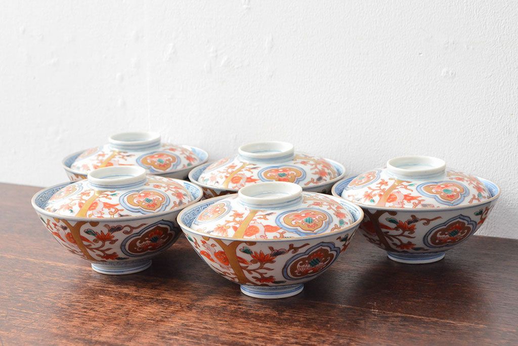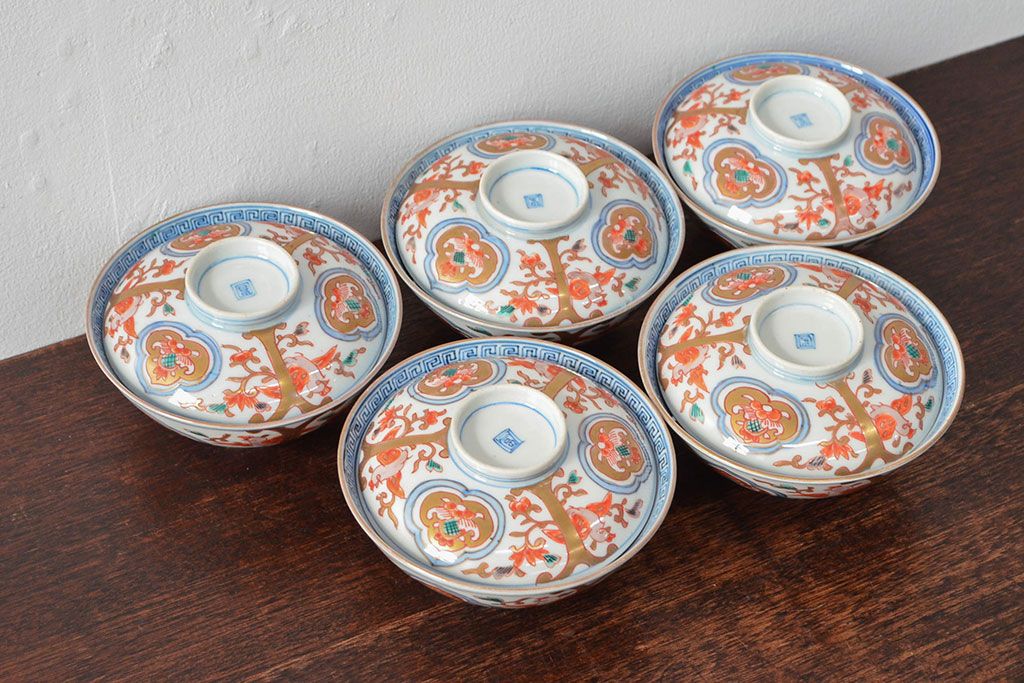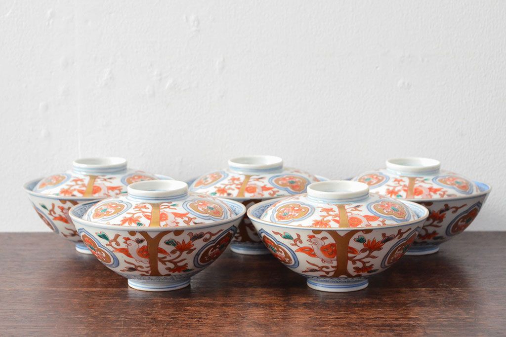ラフジュ工房> 和食器・茶道具 > 幕末〜明治 色絵染付 蓋茶碗5客(和食器)(R-052813)