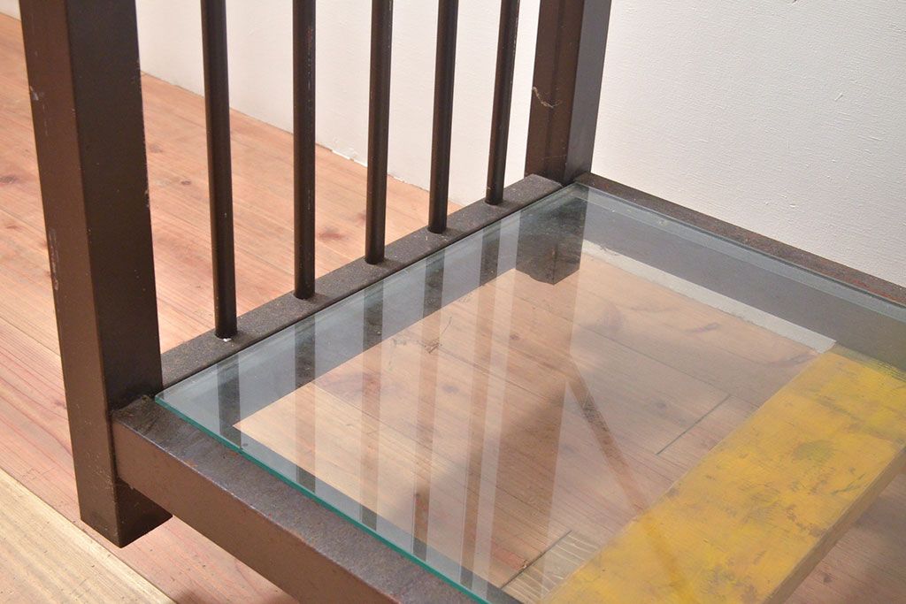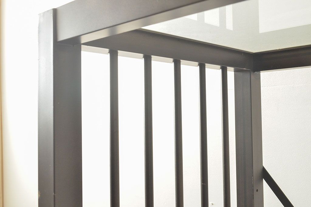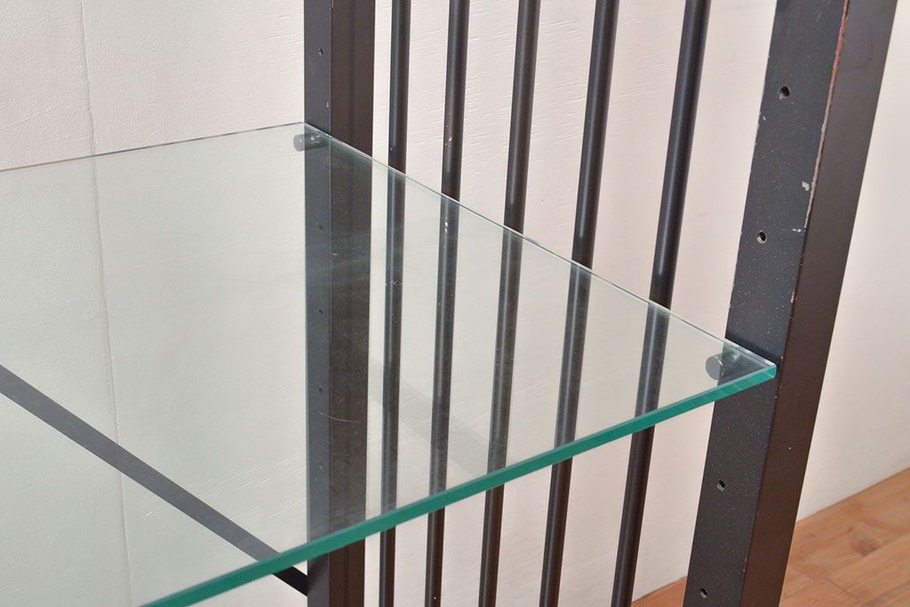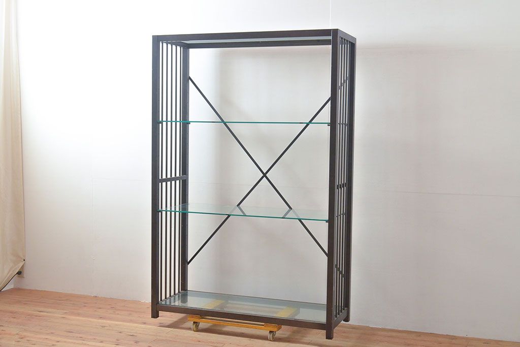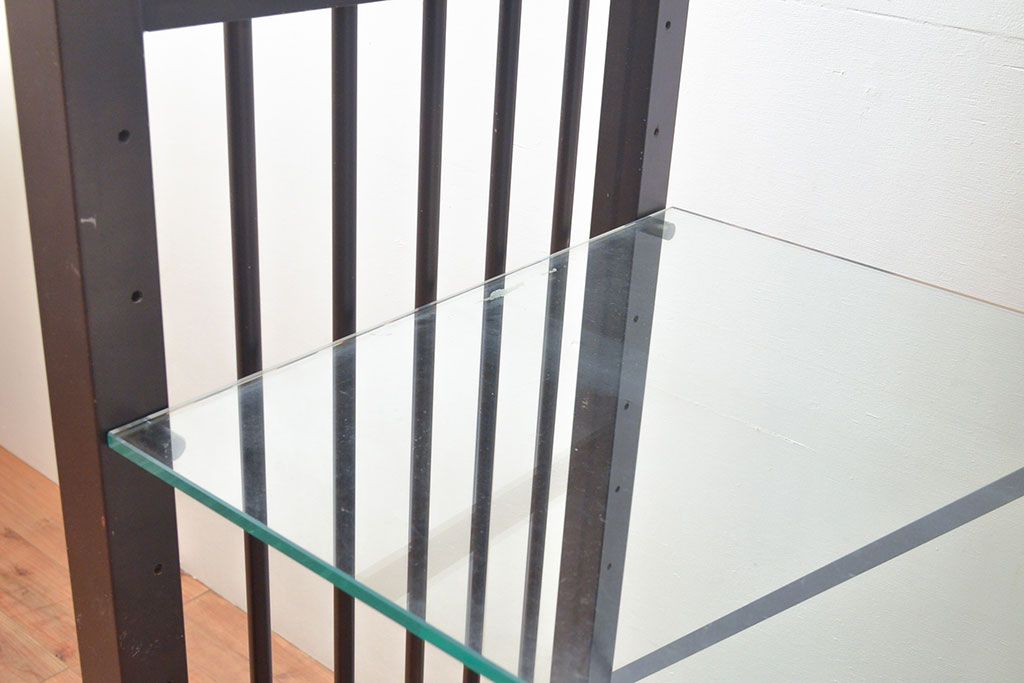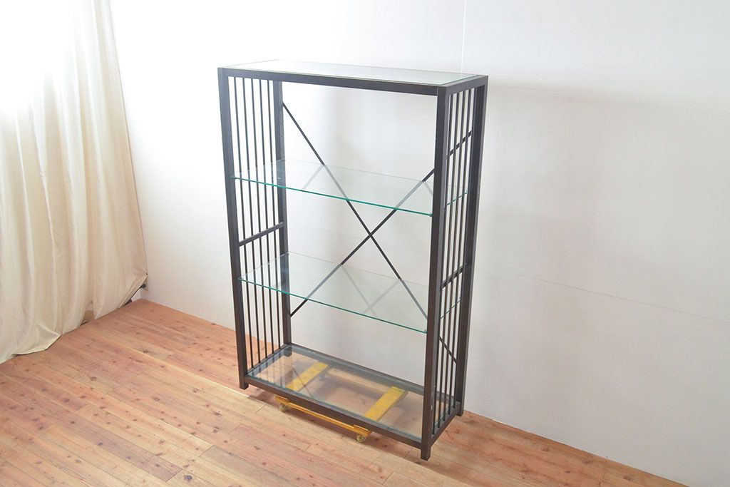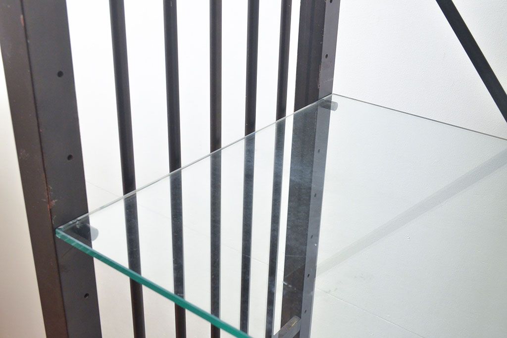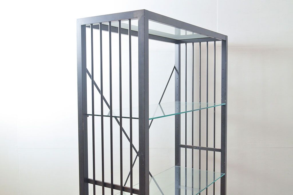 中古 ガラス棚とアイアンの組み合わせがクールでかっこいいアイアンラック(飾り棚、シェルフ、オープンラック、収納棚)(R-053053)