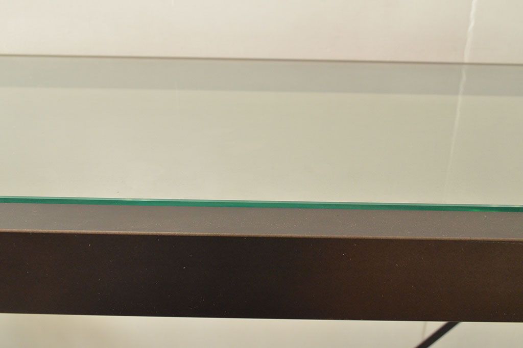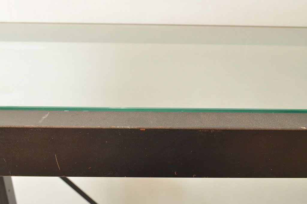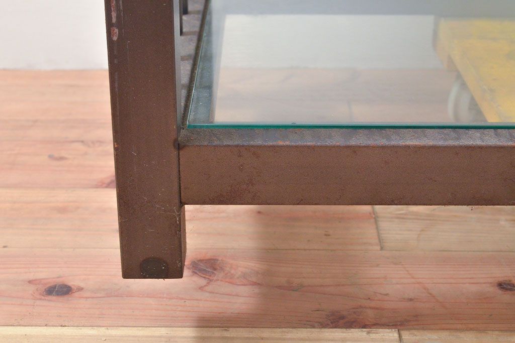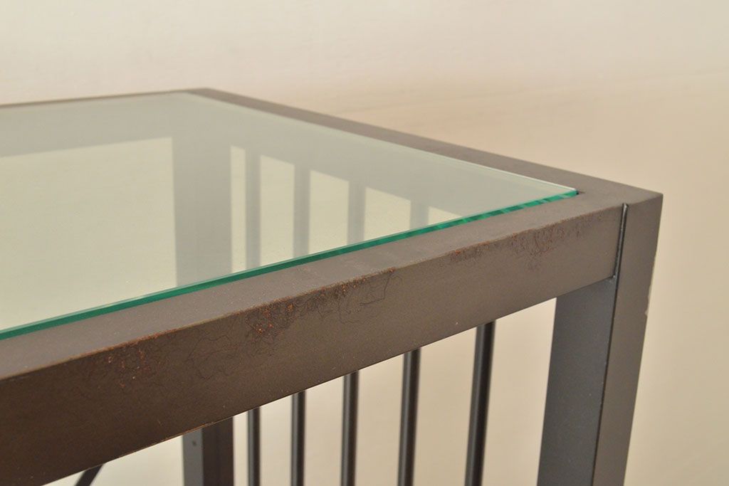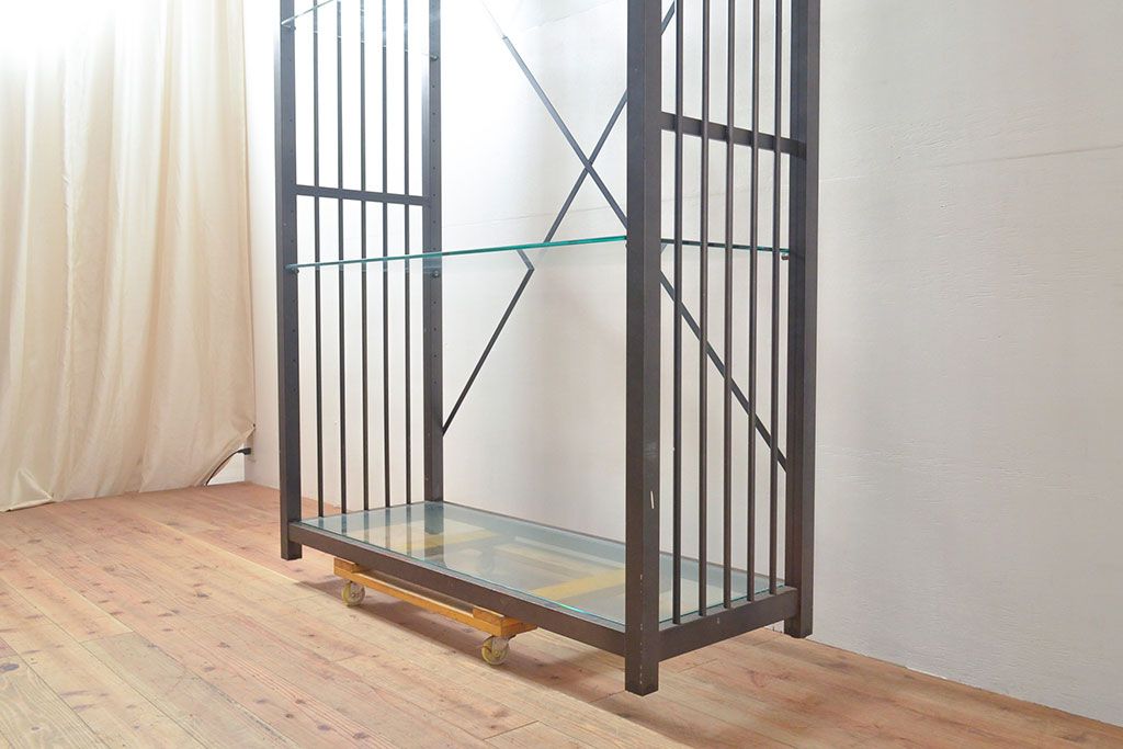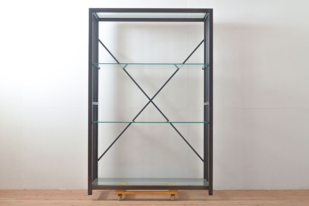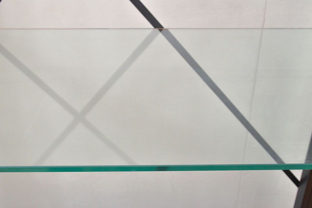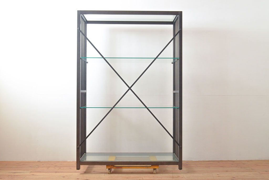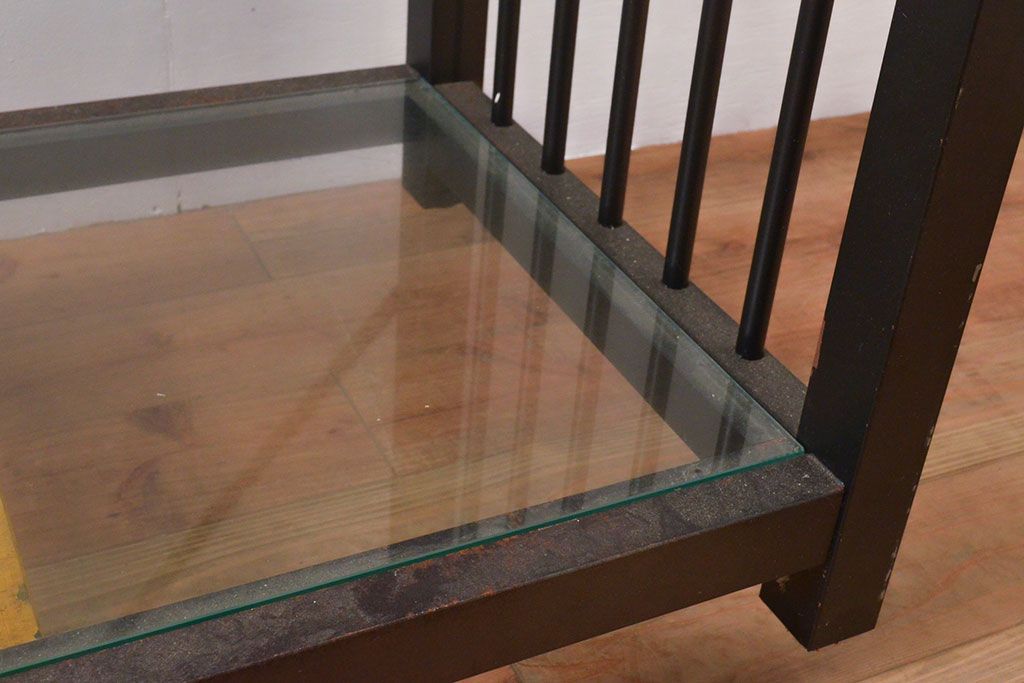 中古 ガラス棚とアイアンの組み合わせがクールでかっこいいアイアンラック(飾り棚、シェルフ、オープンラック、収納棚)(R-053053)