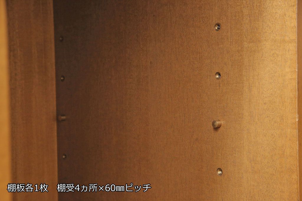 棚板は取り外しできます。棚板は左右各1枚あります。棚受けは4ヶ所、60mmピッチで調整できます。棚幅サイズのものが1枚の作りです。