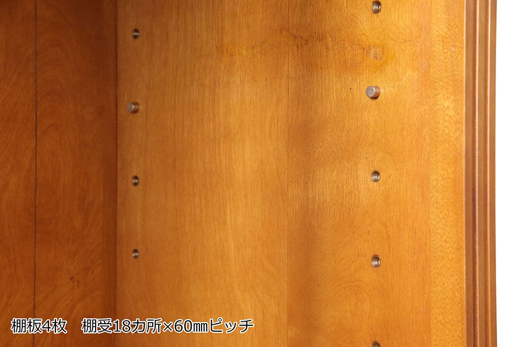 棚板は取り外しできます。棚板は4枚あります。棚受けは18ヶ所、60mmピッチで調整できます。棚幅サイズのものが1枚の作りです。