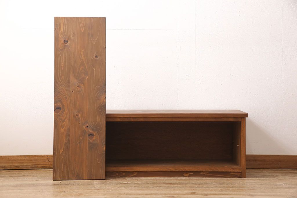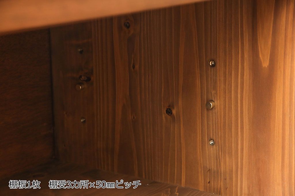 棚板は取り外しできます。棚板は1枚あります。棚受けは3ヶ所、50mmピッチで調整できます。棚幅サイズのものが1枚の作りです。