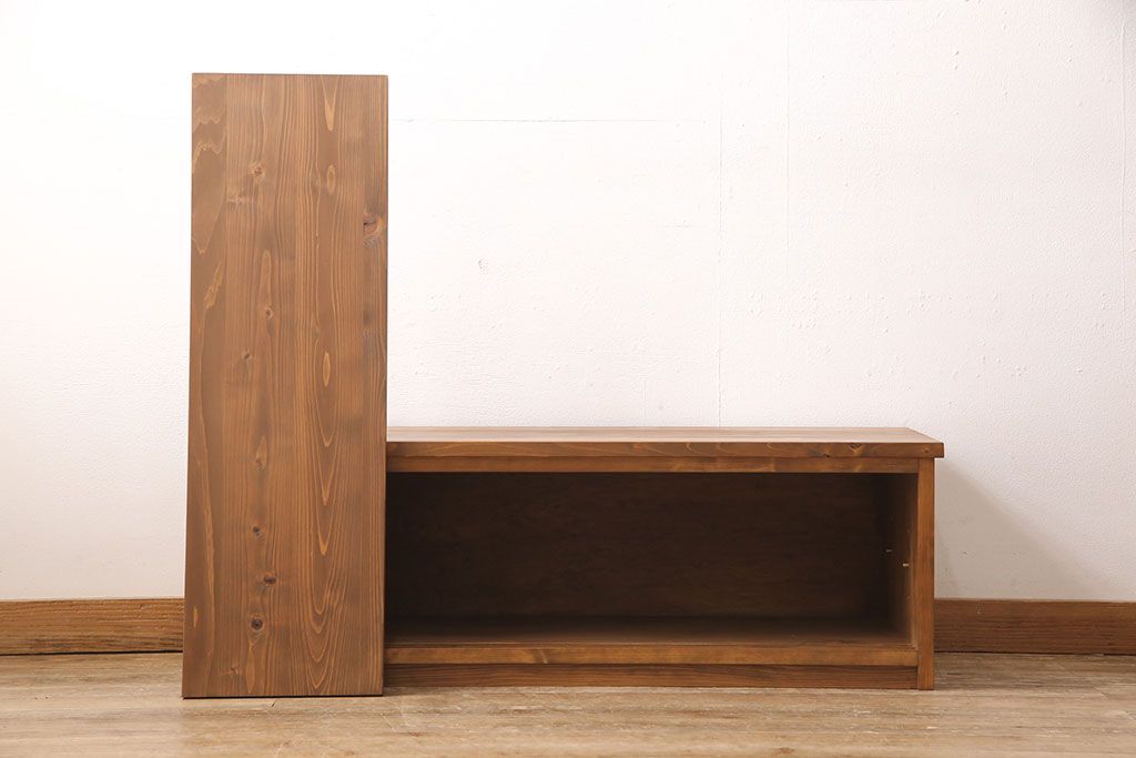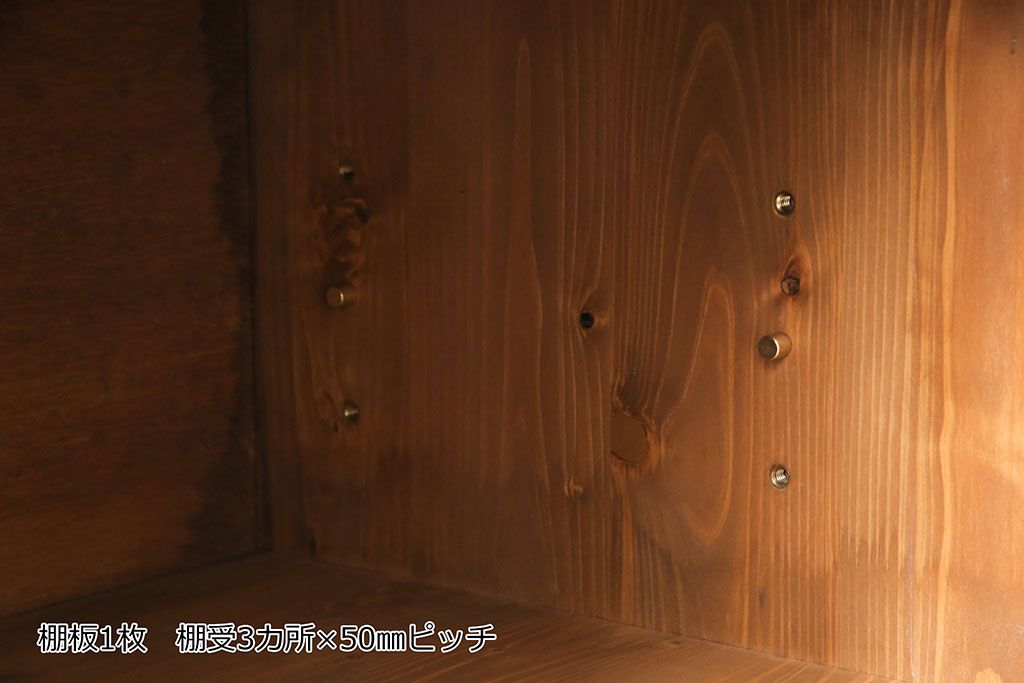 棚板は取り外しできます。棚板は1枚あります。棚受けは3ヶ所、50mmピッチで調整できます。棚幅サイズのものが1枚の作りです。