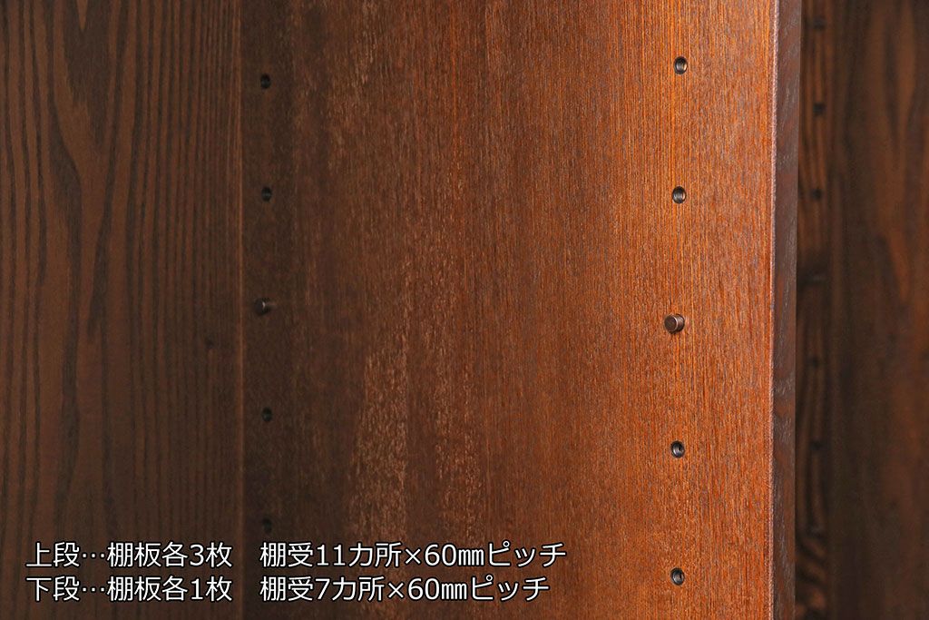 棚板は取り外しできます。棚板は上段各3枚、下段各1枚あります。棚受けは上段各11ヶ所、下段各7ヶ所、各60mmピッチで調整できます。棚幅サイズのものが1枚の作りです。