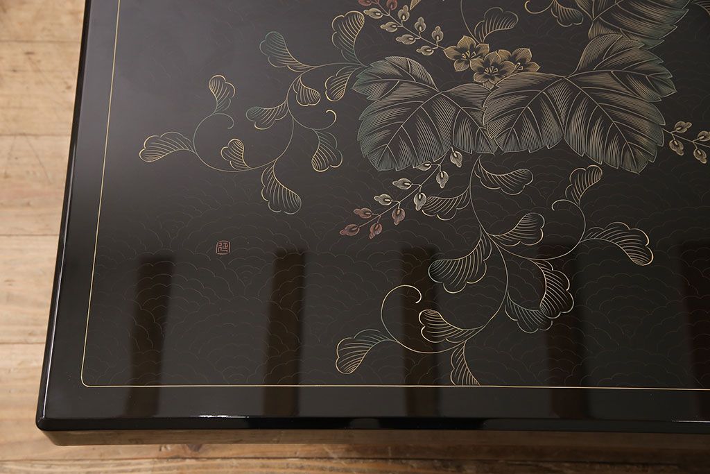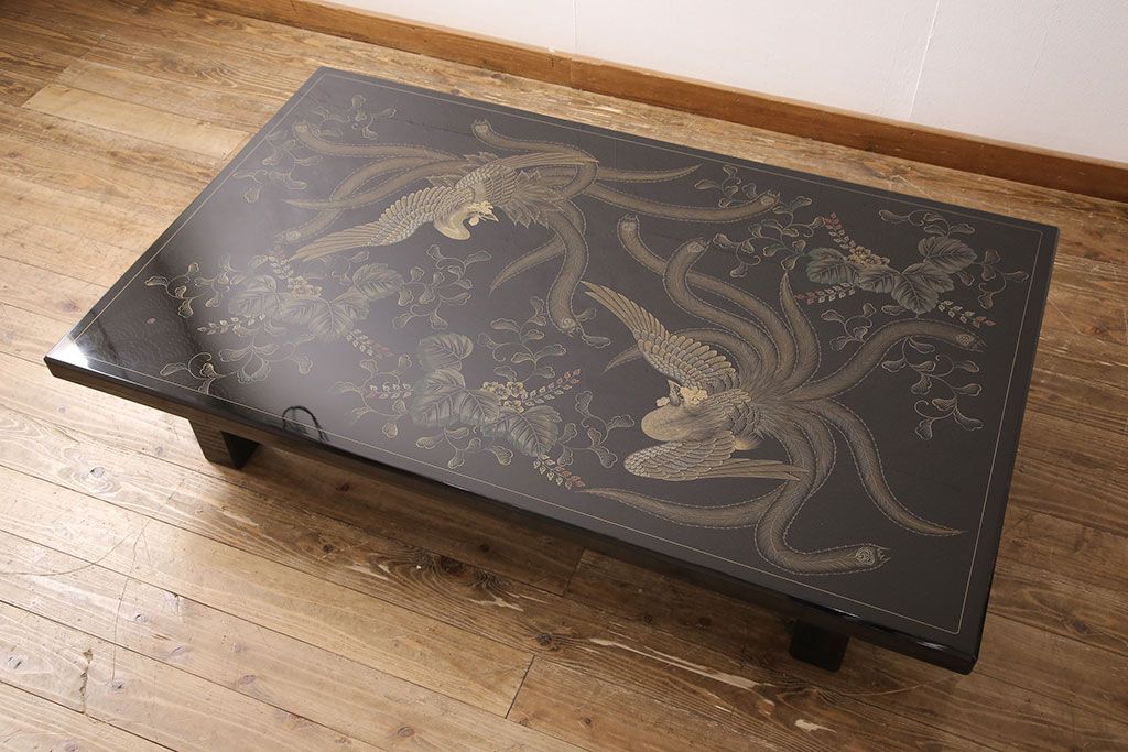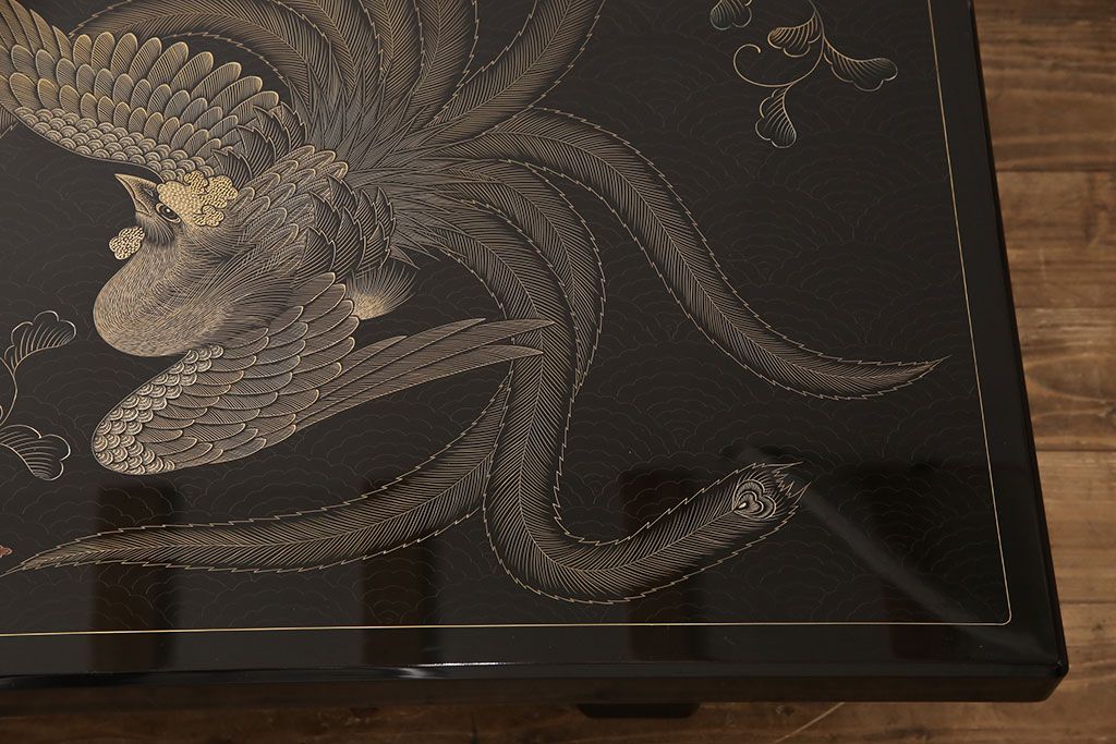 中古 輪島塗 ガラス天板付き 天板前面に描かれた鳳凰のデザインが美しい座卓(ローテーブル、センターテーブル)(R-053278)