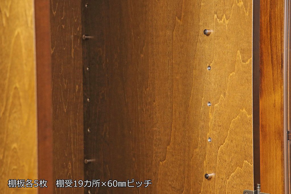 棚板は取り外しできます。棚板は各5枚あります。棚受けは各19ヶ所、60mmピッチで調整できます。棚幅サイズのものが1枚の作りです。