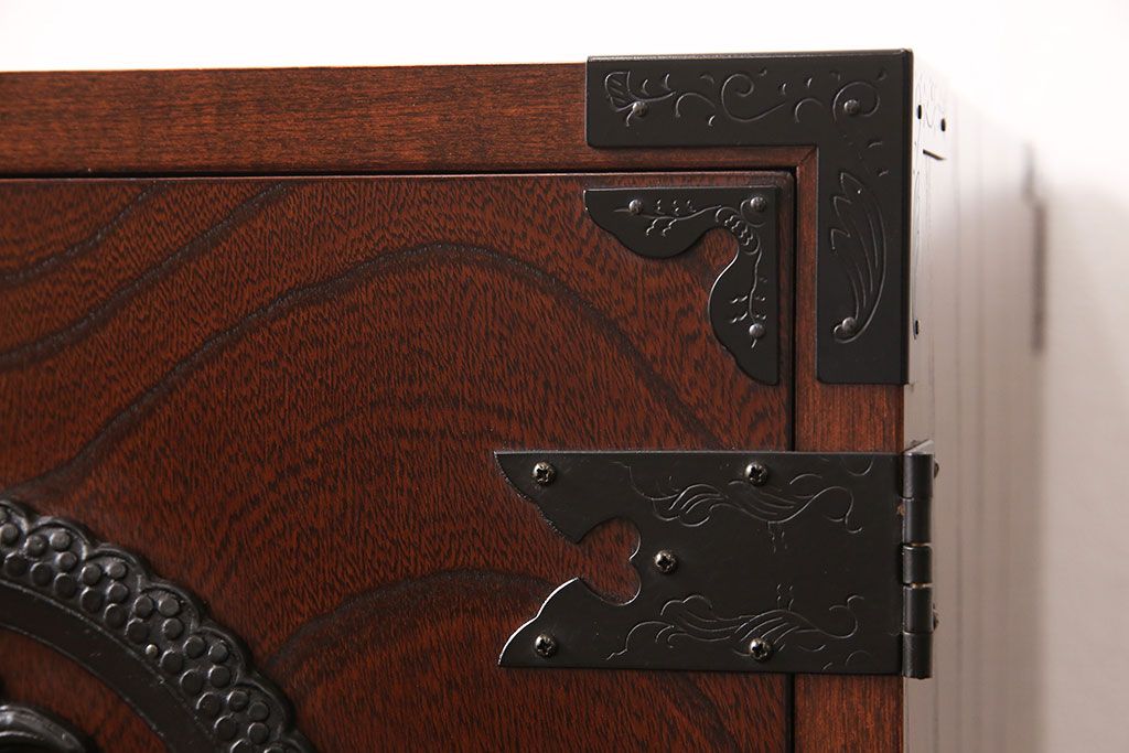 和箪笥 > 中古 美品 手造り民芸家具 存在感のある金具が魅力的な片開き戸付き小引き出し(小箪笥、小たんす、小抽斗、卓上収納、小物収納)(R-053274)