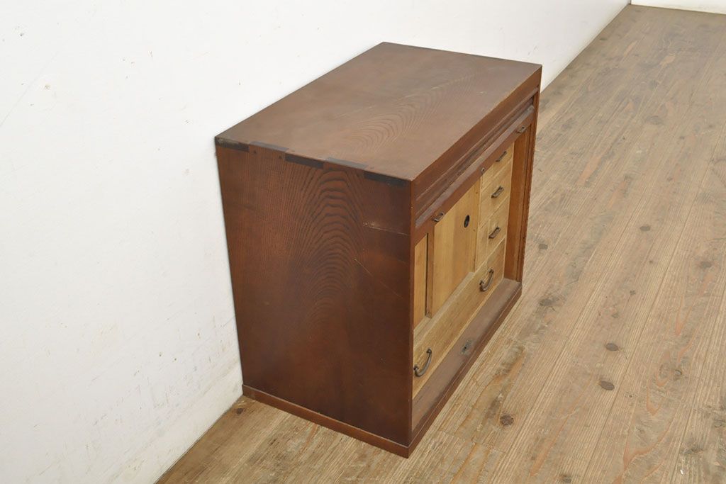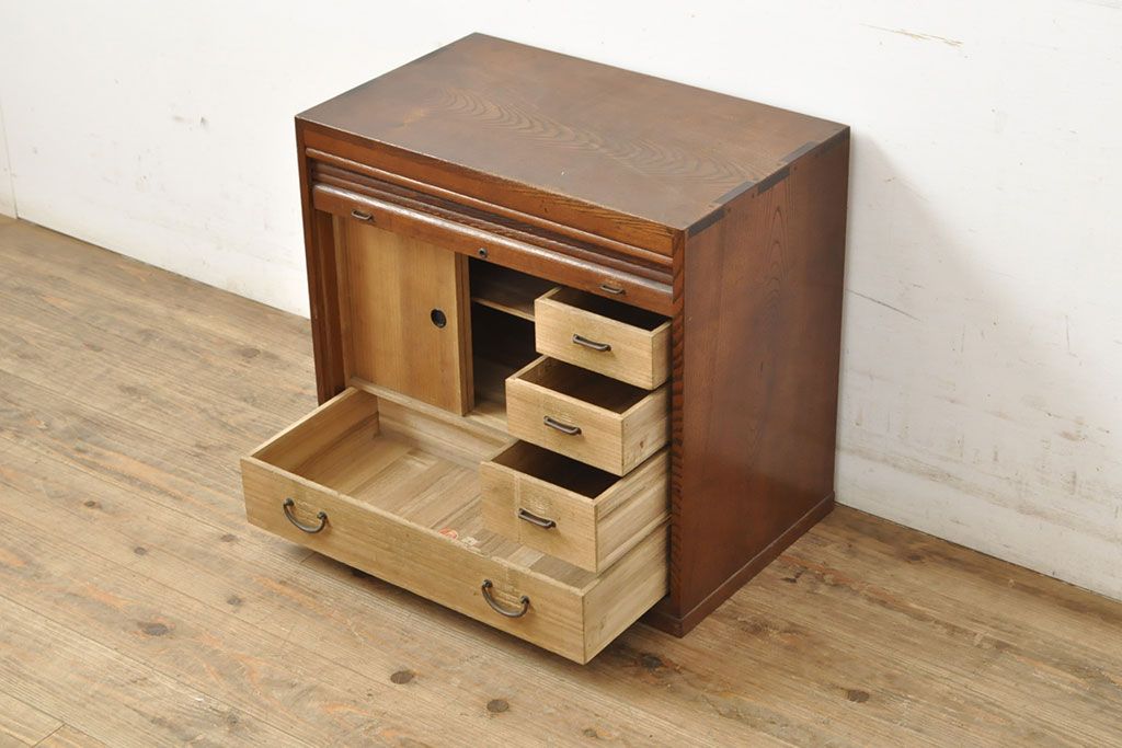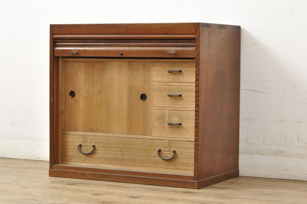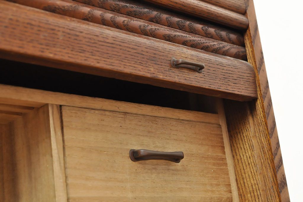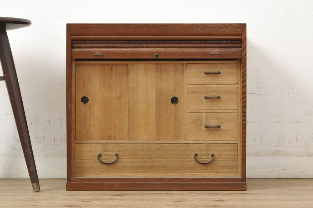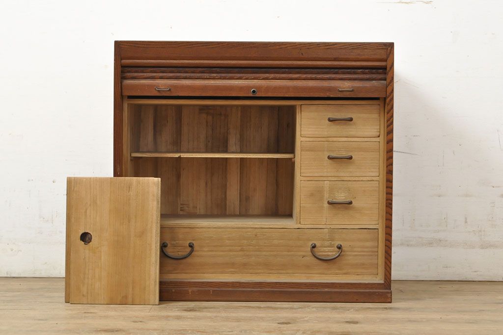 和製アンティーク 上手物 指物工芸家具 総栓材 明るい木色と深みのある木色のコントラストが映えるシャッター収納棚(蛇腹、小引き出し)(R-052712)