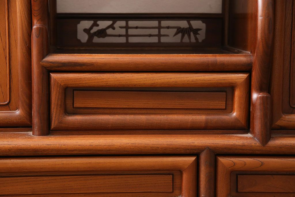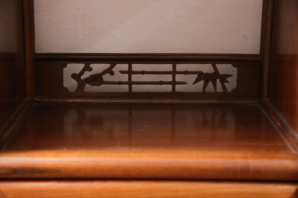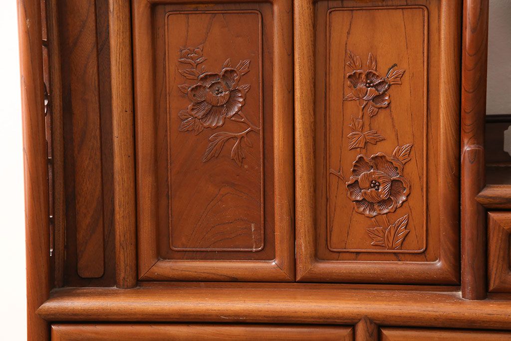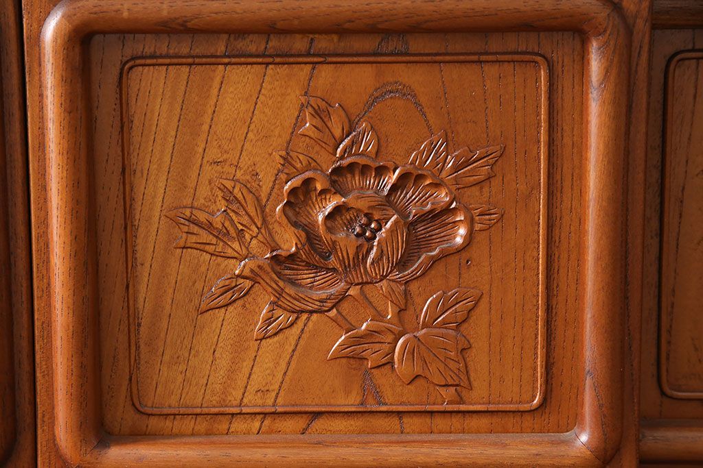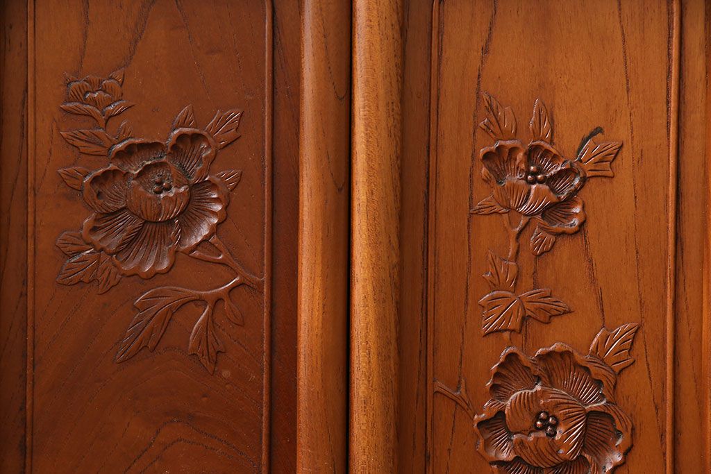 和箪笥 > 中古 美品 国産 手造り 指物工芸家具 松竹梅・牡丹 美しい彫りの意匠が見事な総ケヤキ材製の飾り棚(茶棚、収納棚、戸棚)(R-053338)