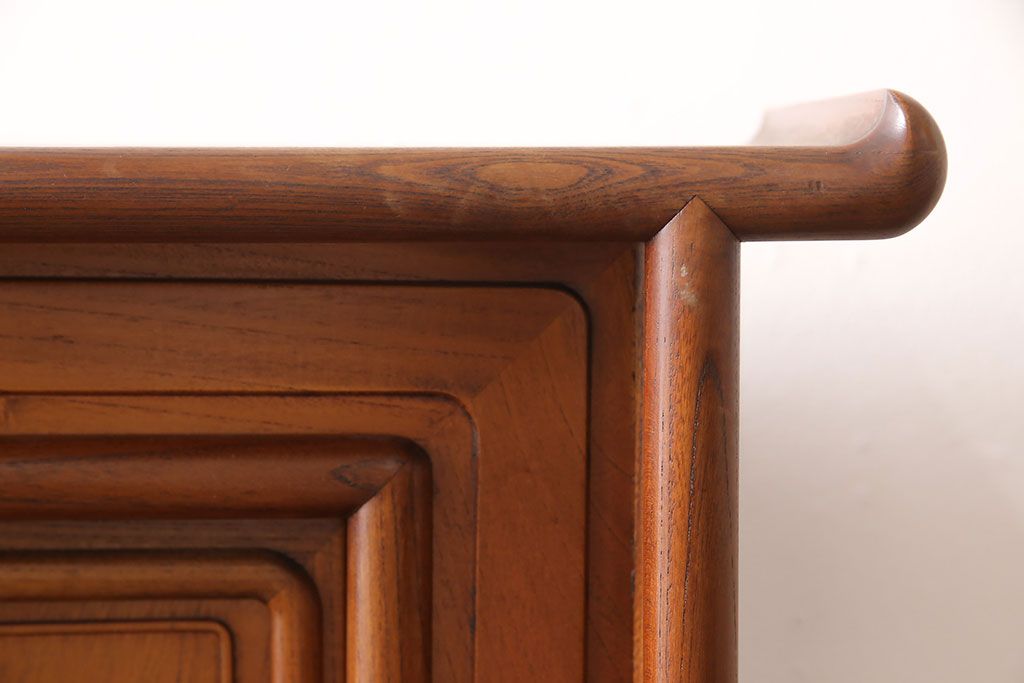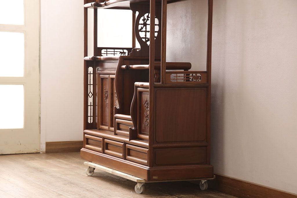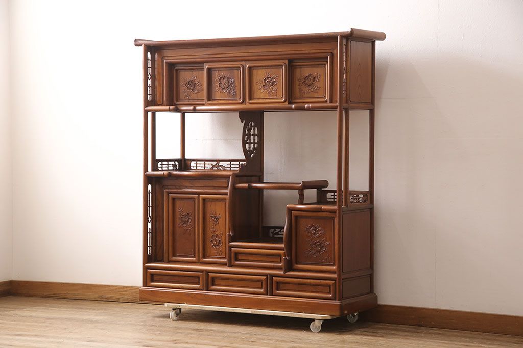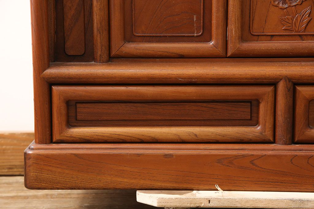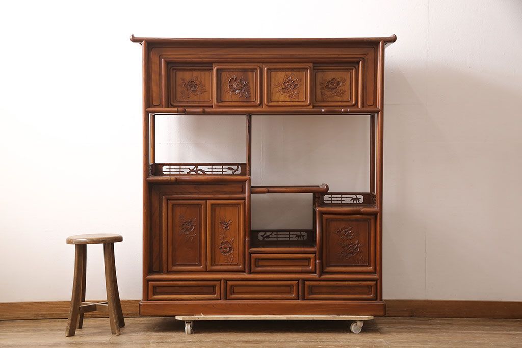和箪笥 > 中古 美品 国産 手造り 指物工芸家具 松竹梅・牡丹 美しい彫りの意匠が見事な総ケヤキ材製の飾り棚(茶棚、収納棚、戸棚)(R-053338)