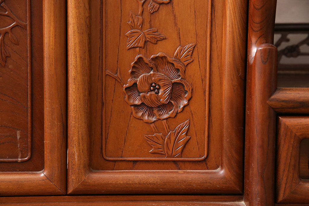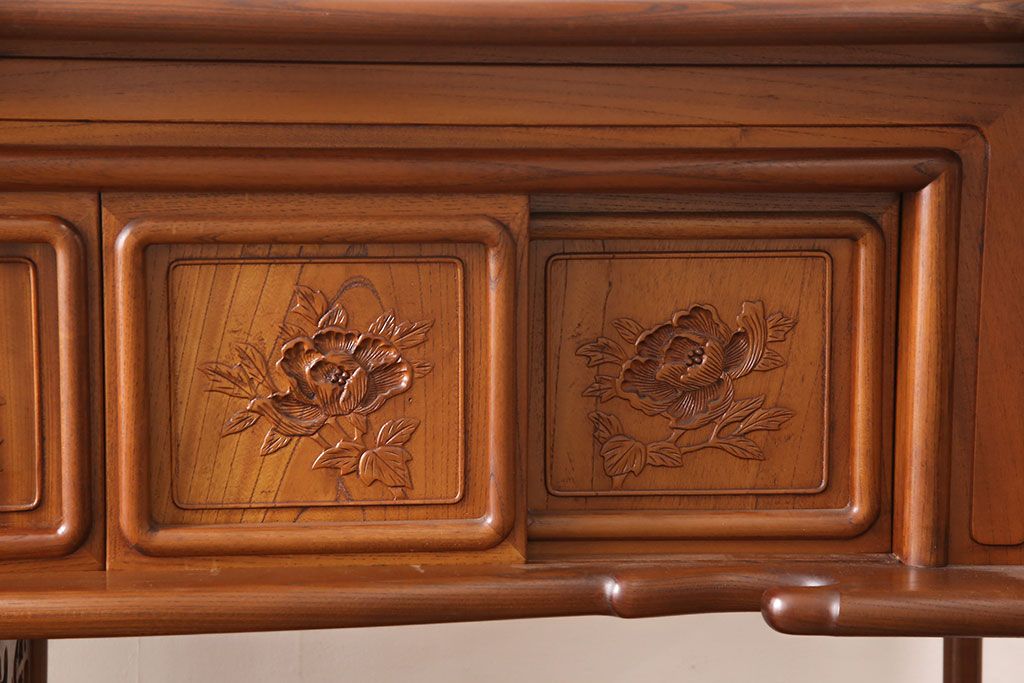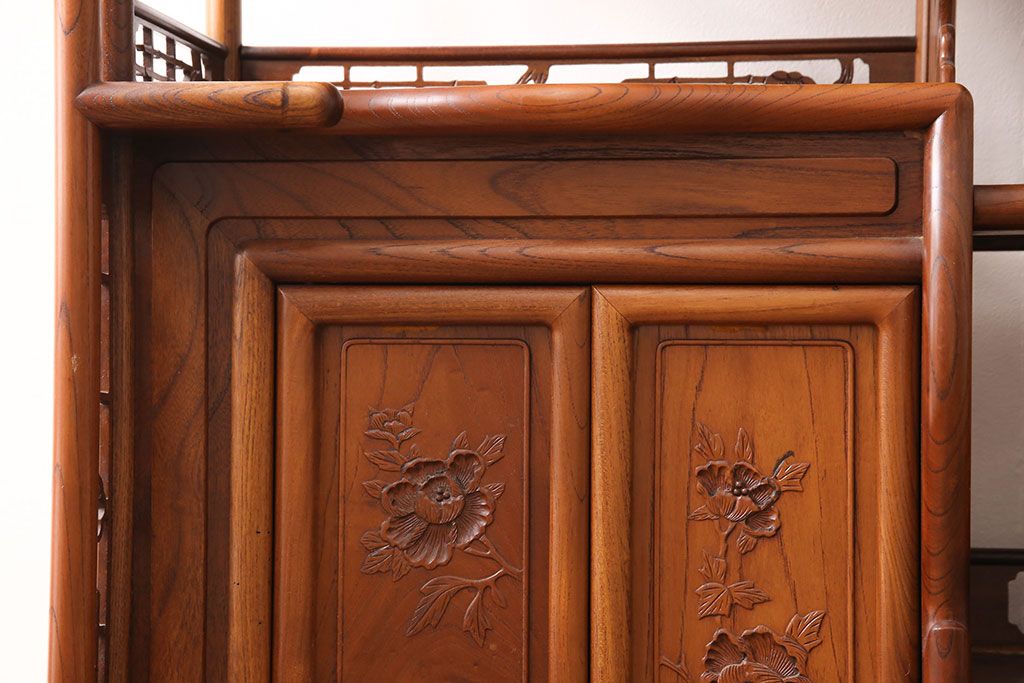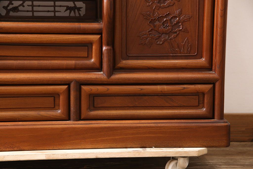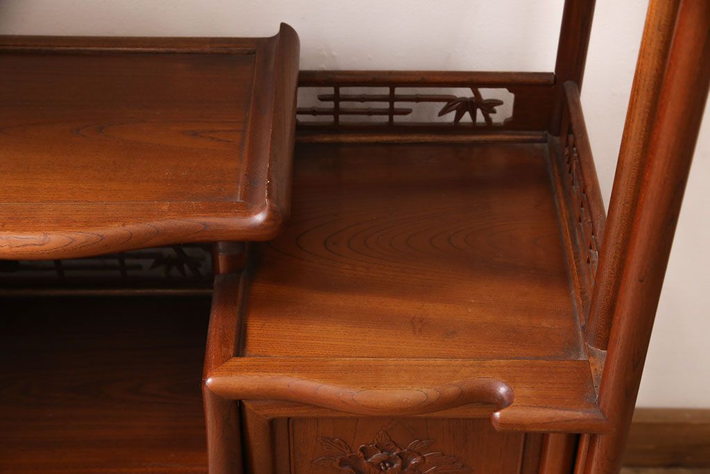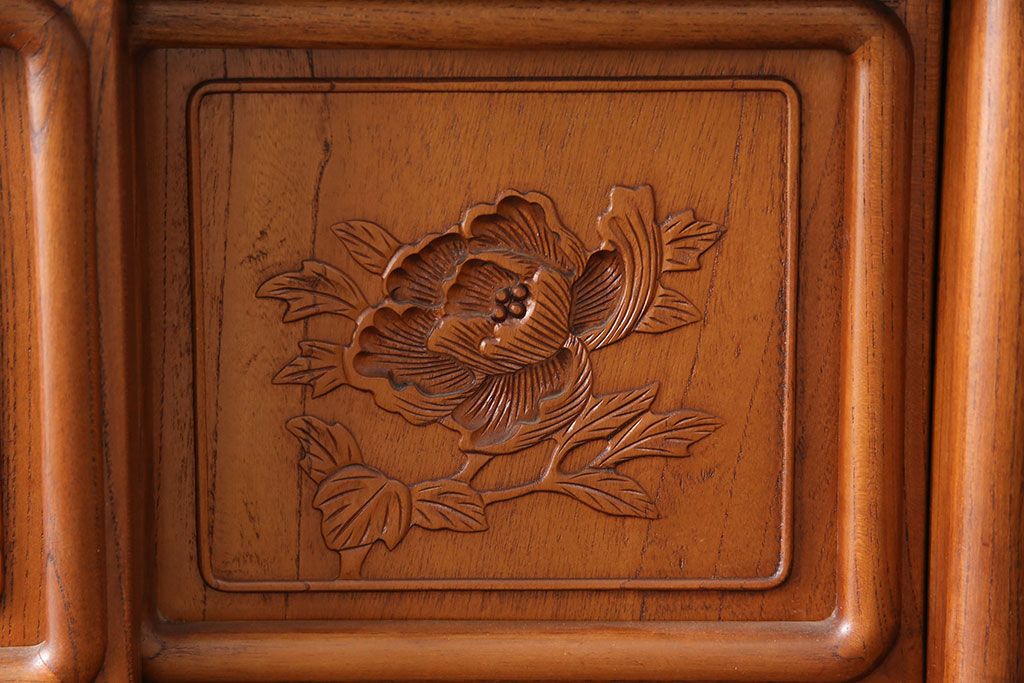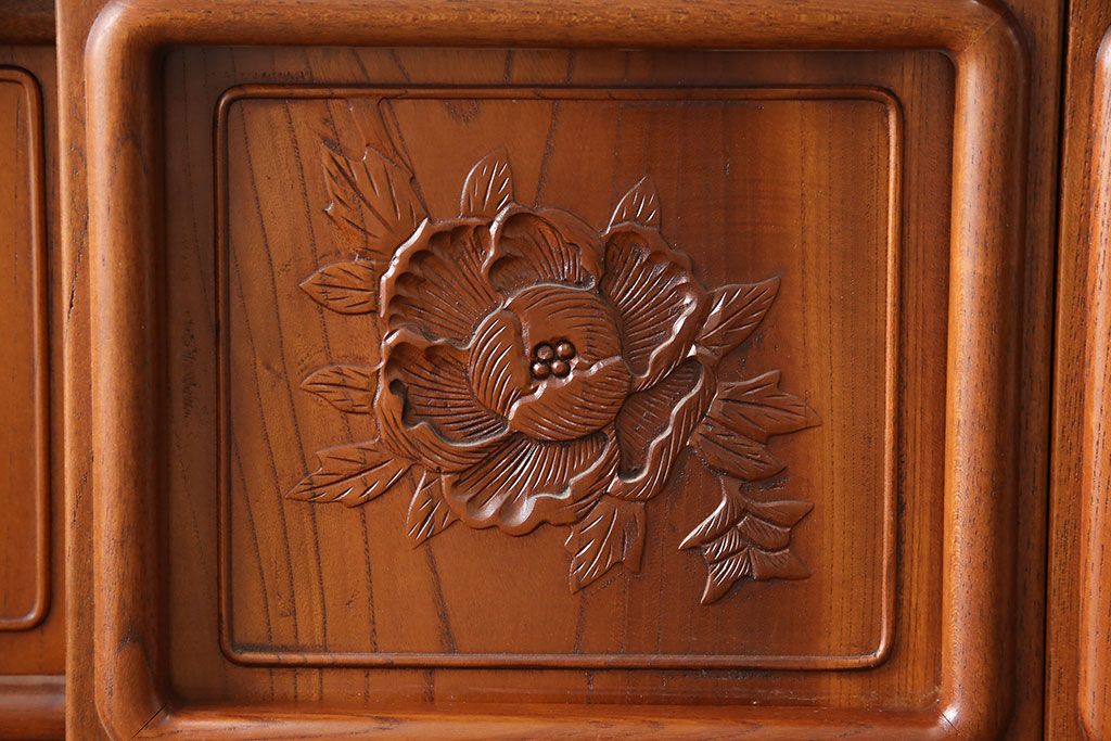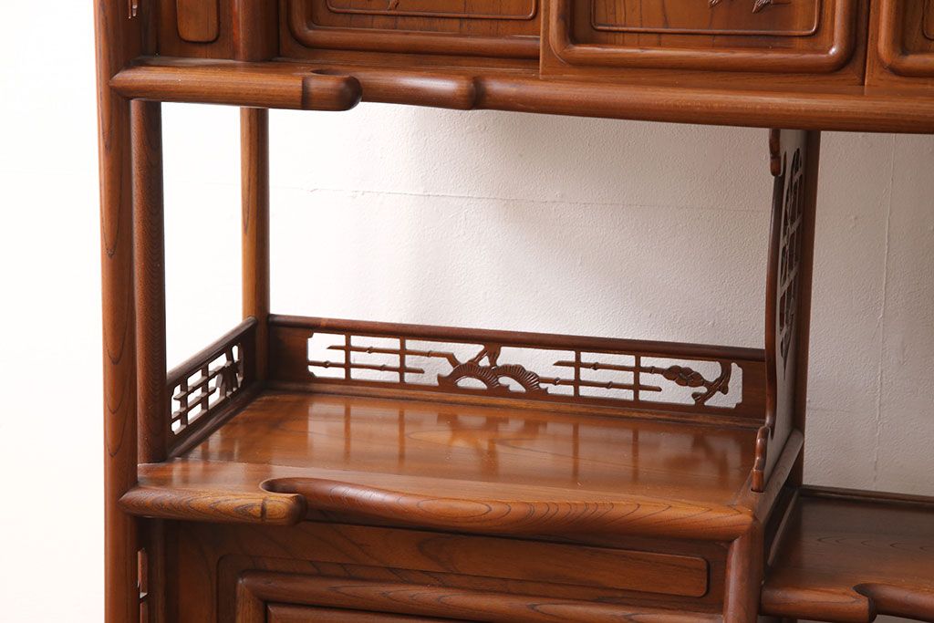 和箪笥> 茶箪笥・茶棚 > 中古 美品 国産 手造り 指物工芸家具 松竹梅・牡丹 美しい彫りの意匠が見事な総ケヤキ材製の飾り棚(茶棚、収納棚、戸棚)(R-053338)