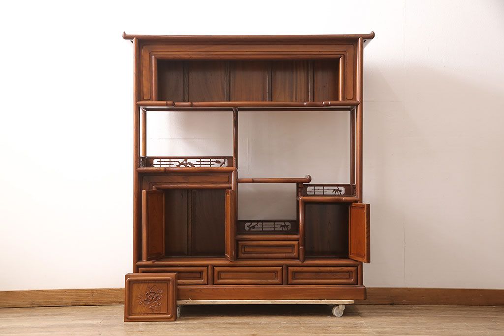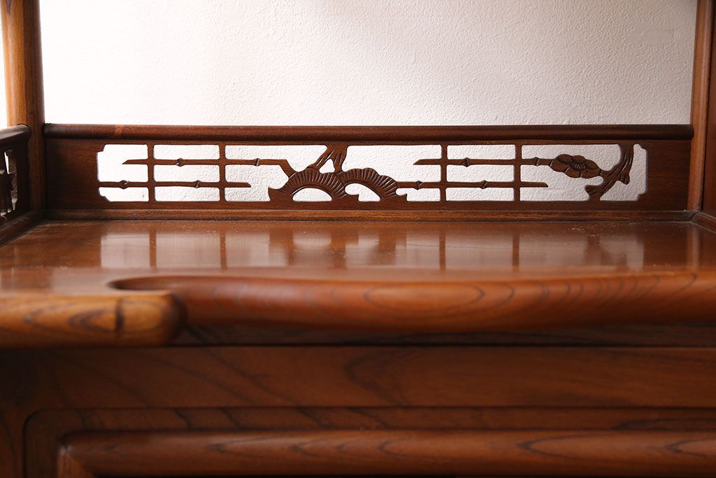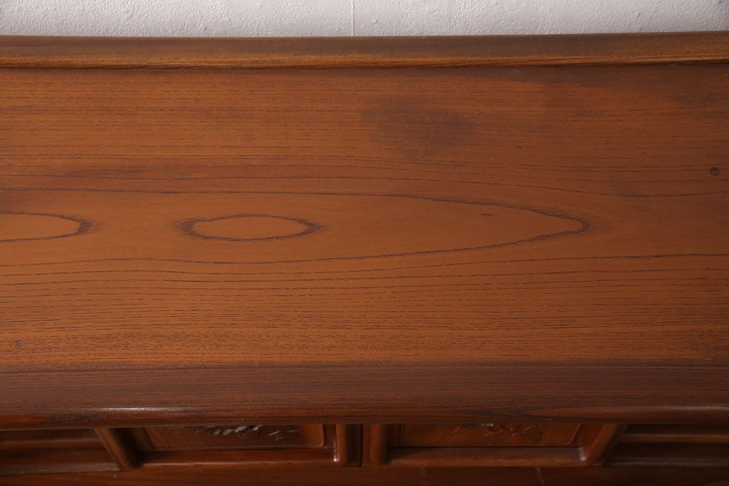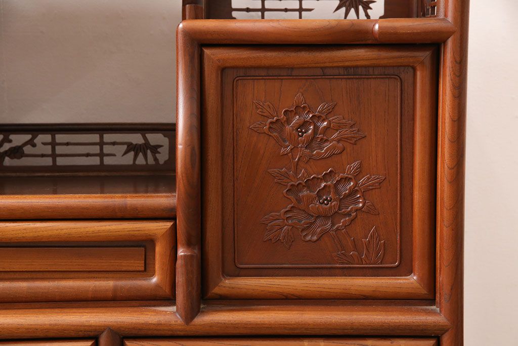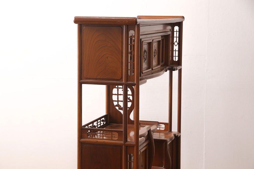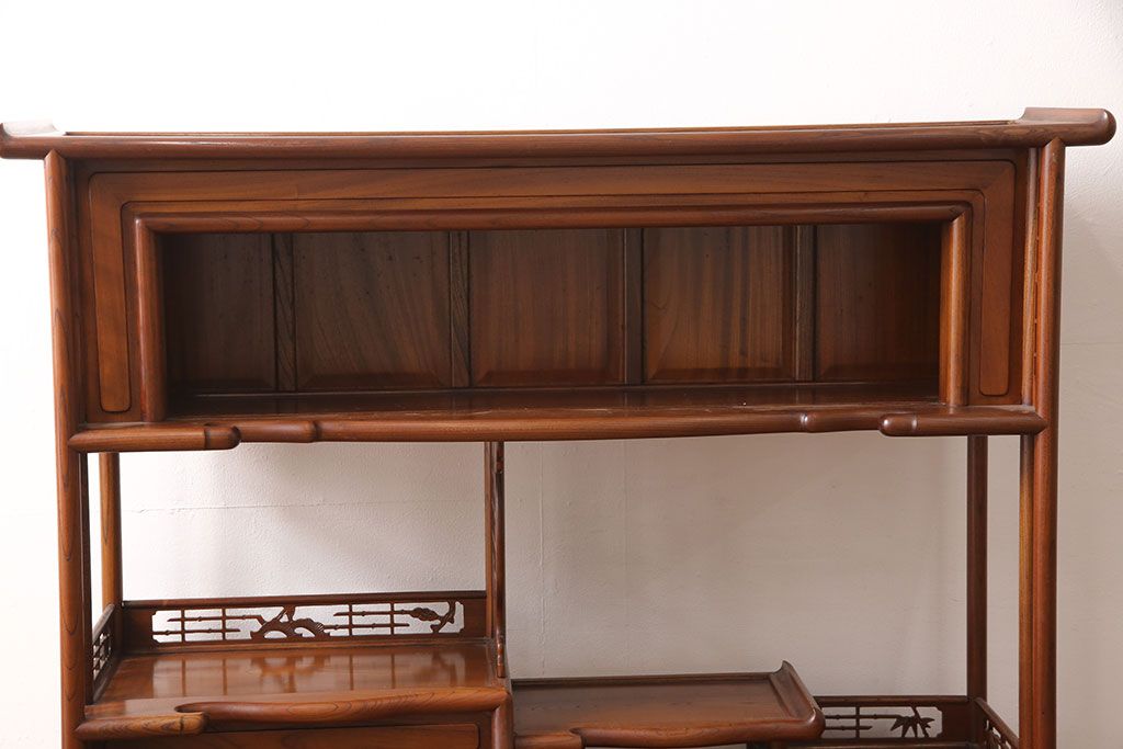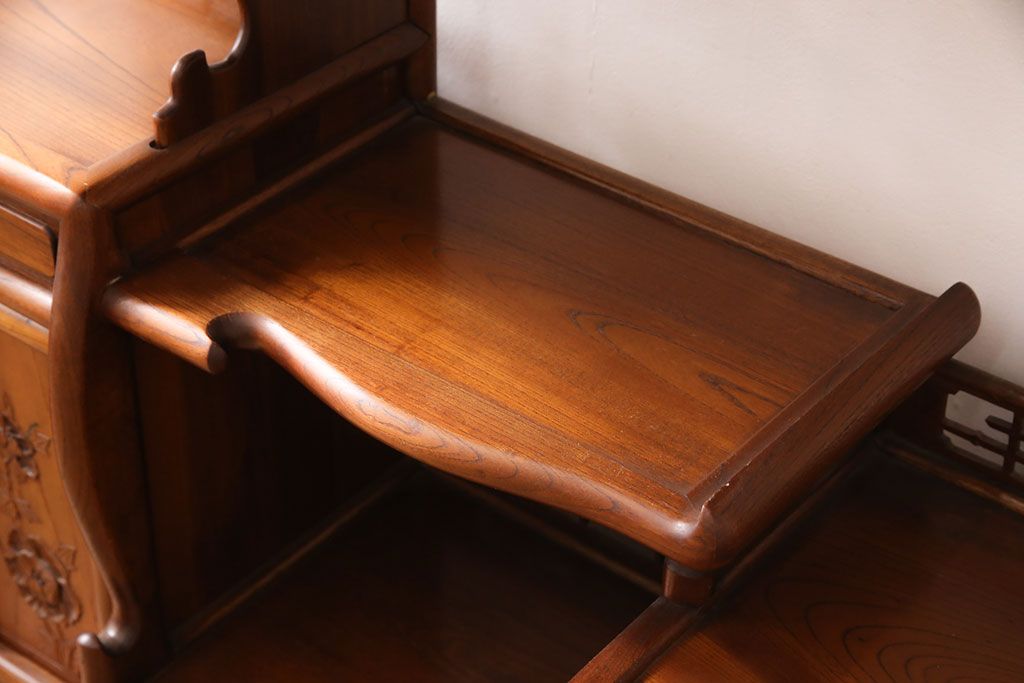 和箪笥> 茶箪笥・茶棚 > 中古 美品 国産 手造り 指物工芸家具 松竹梅・牡丹 美しい彫りの意匠が見事な総ケヤキ材製の飾り棚(茶棚、収納棚、戸棚)(R-053338)