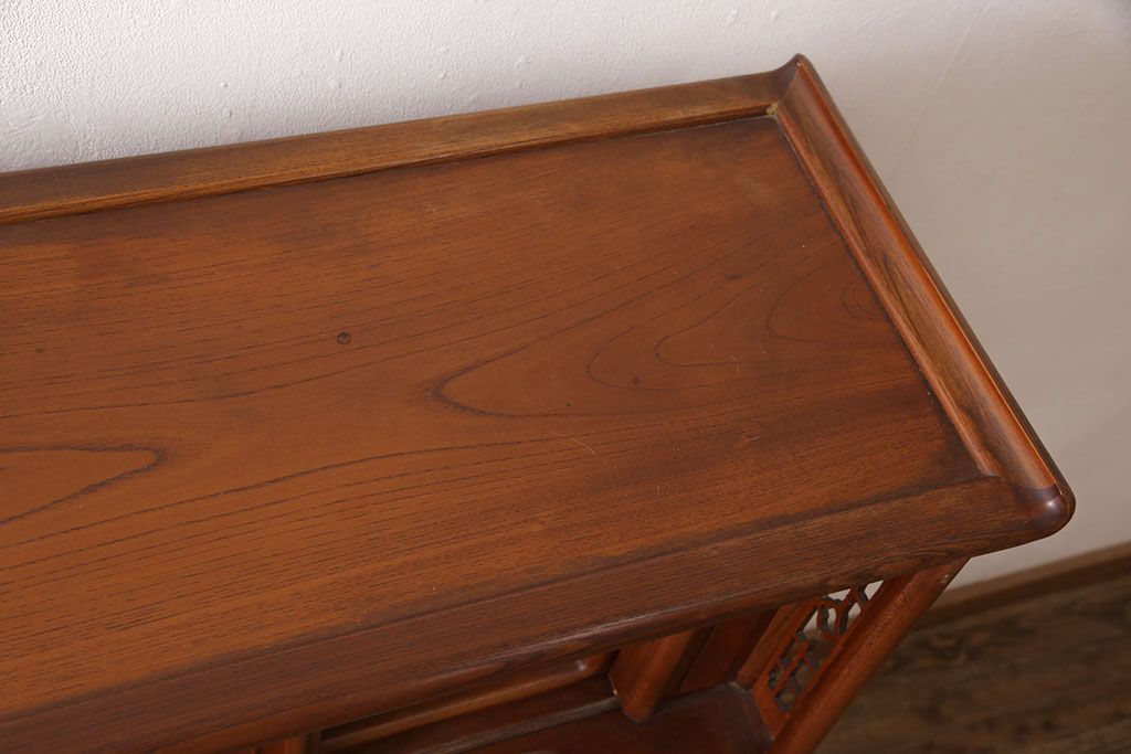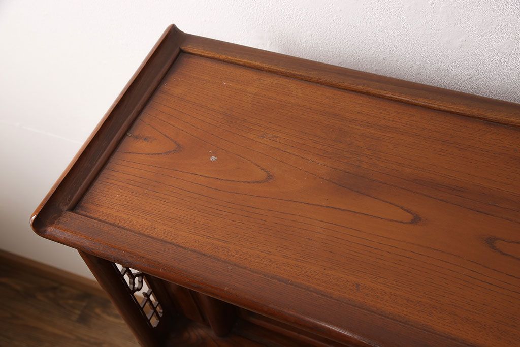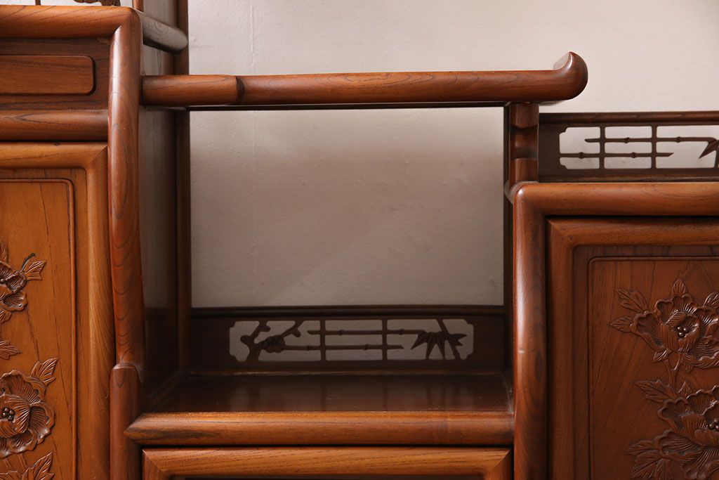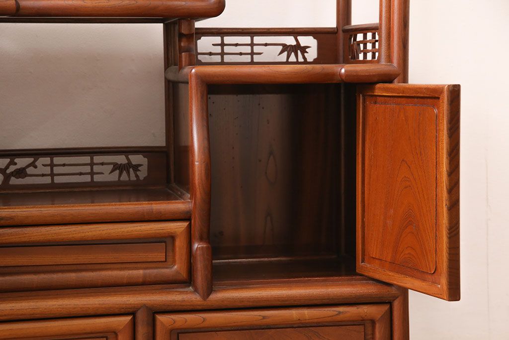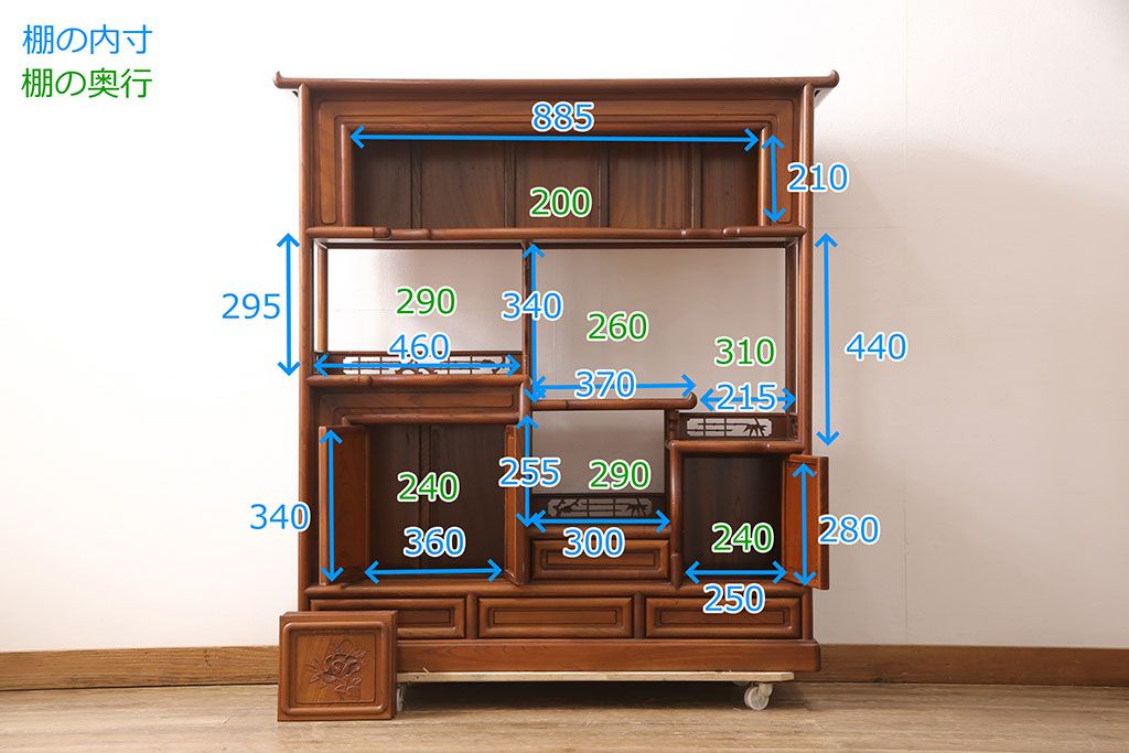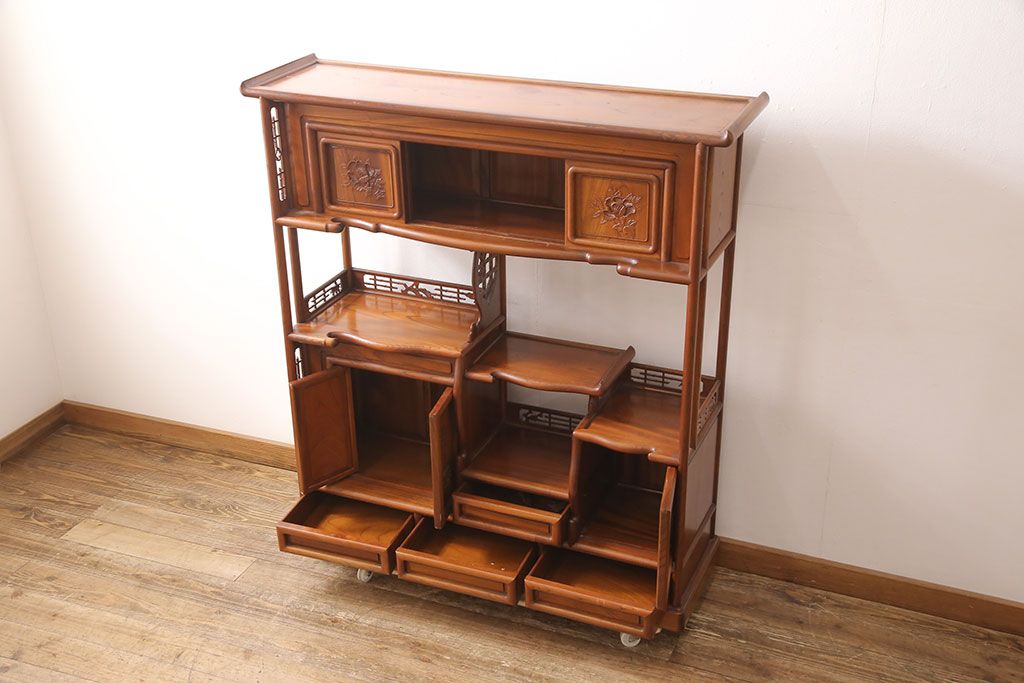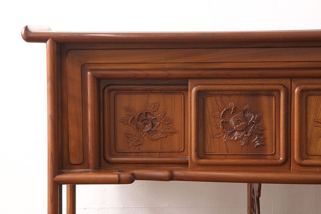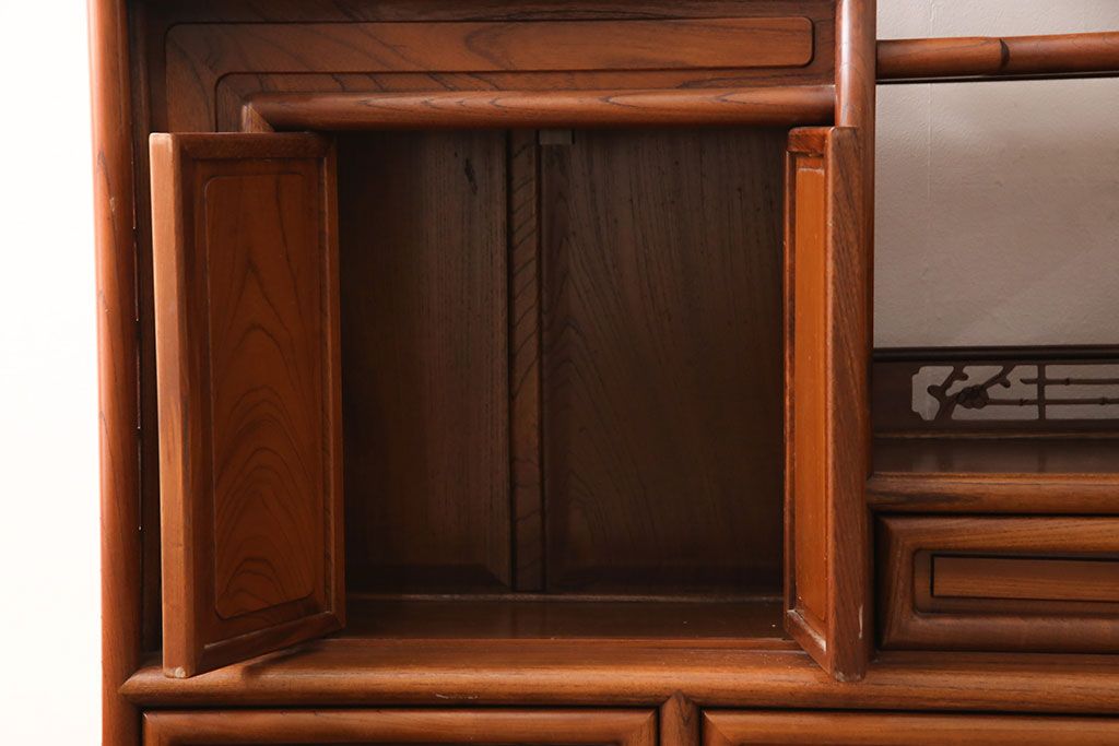 和箪笥> 茶箪笥・茶棚 > 中古 美品 国産 手造り 指物工芸家具 松竹梅・牡丹 美しい彫りの意匠が見事な総ケヤキ材製の飾り棚(茶棚、収納棚、戸棚)(R-053338)