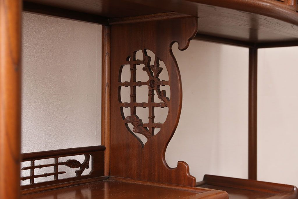 中古 美品 国産 手造り 指物工芸家具 松竹梅・牡丹 美しい彫りの意匠が見事な総ケヤキ材製の飾り棚(茶棚、収納棚、戸棚)(R-053338)