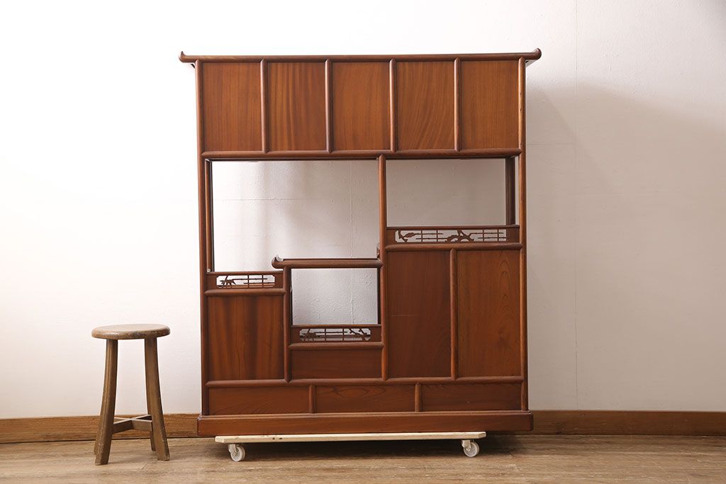 中古 美品 国産 手造り 指物工芸家具 松竹梅・牡丹 美しい彫りの意匠が見事な総ケヤキ材製の飾り棚(茶棚、収納棚、戸棚)(R-053338)です。