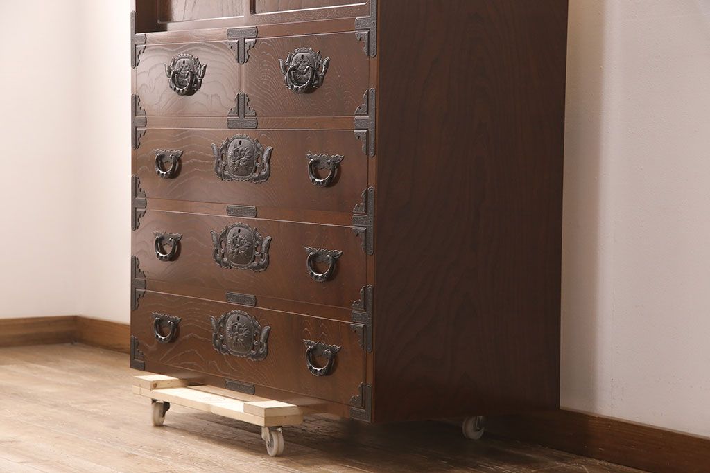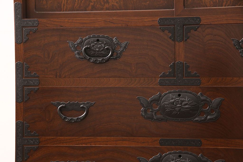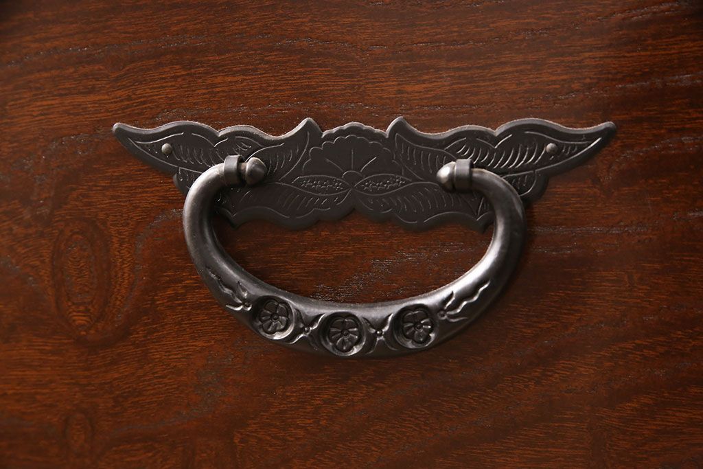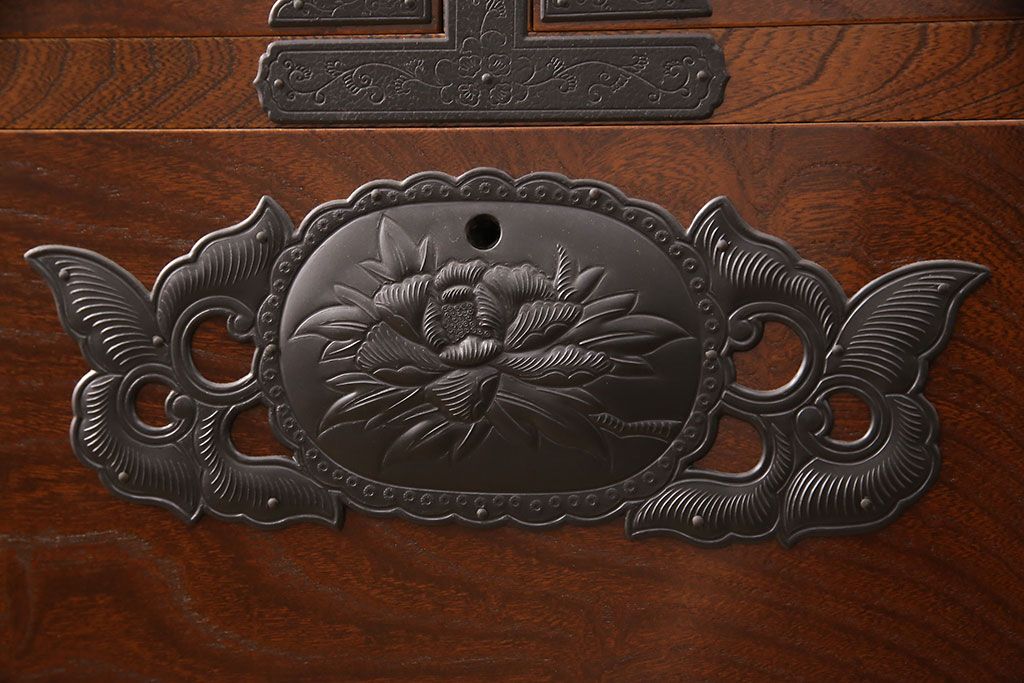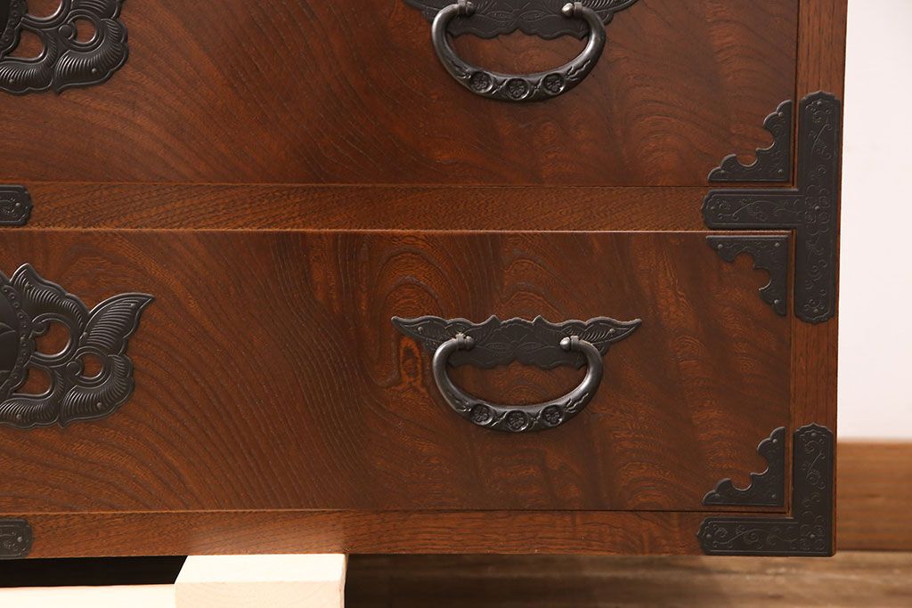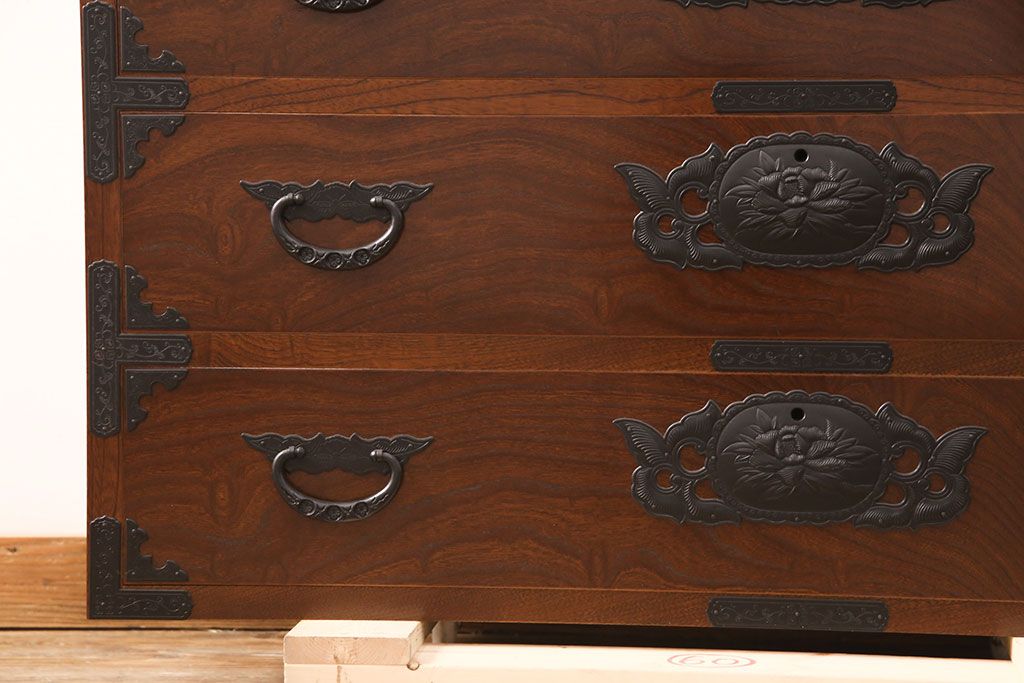 ラフジュ工房> 民芸家具 > 中古 美品 脚(台輪)付きリメイク 国産手造り民芸家具 凝ったデザインの金具と深みのある色合いが美しい和タンス(和箪笥、チェスト、引き出し)(R-052654)