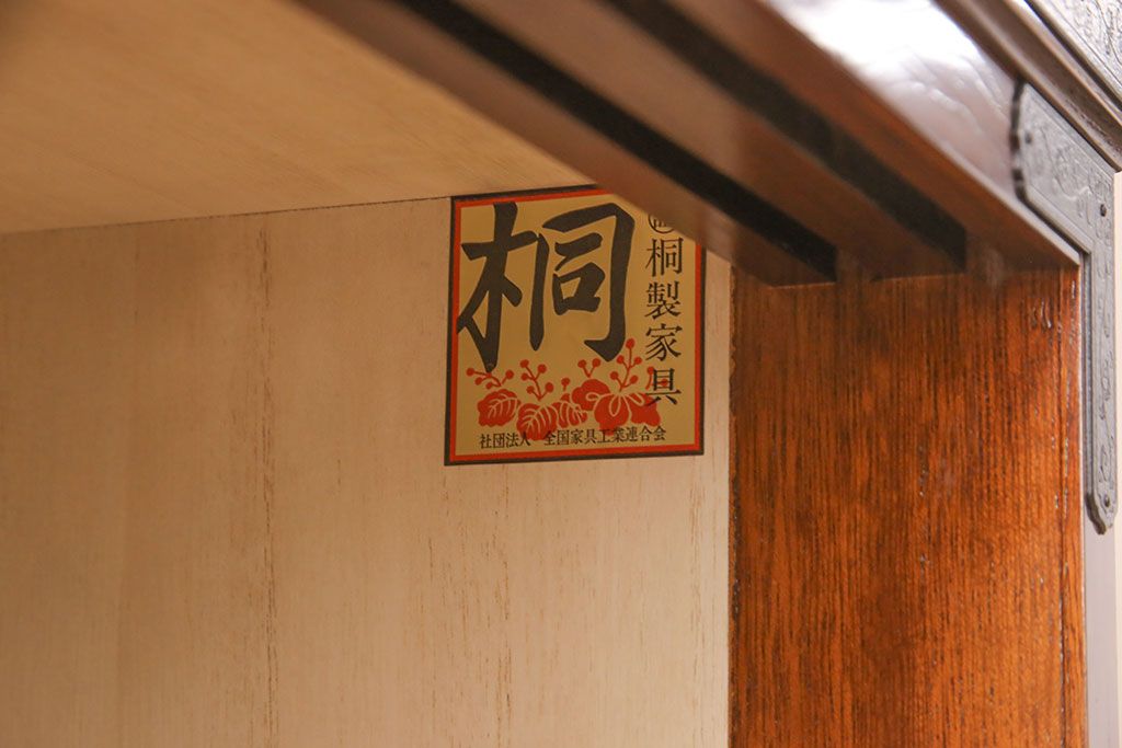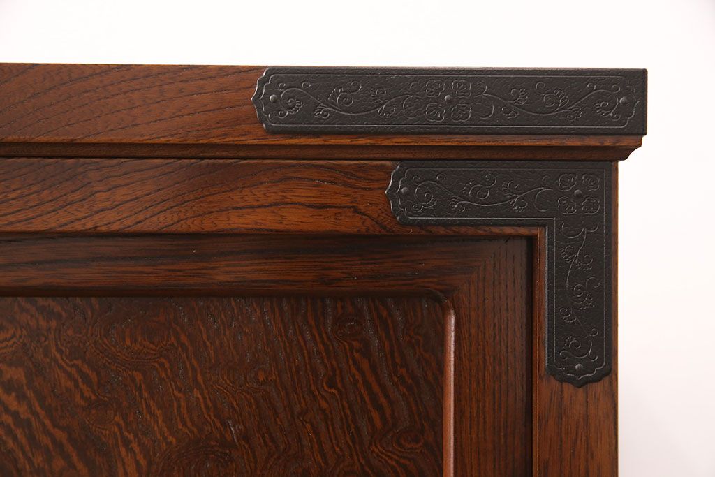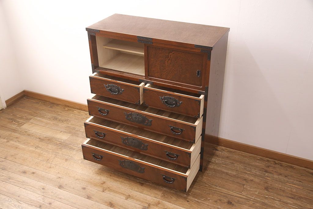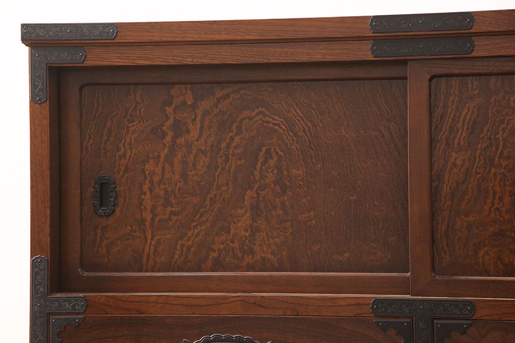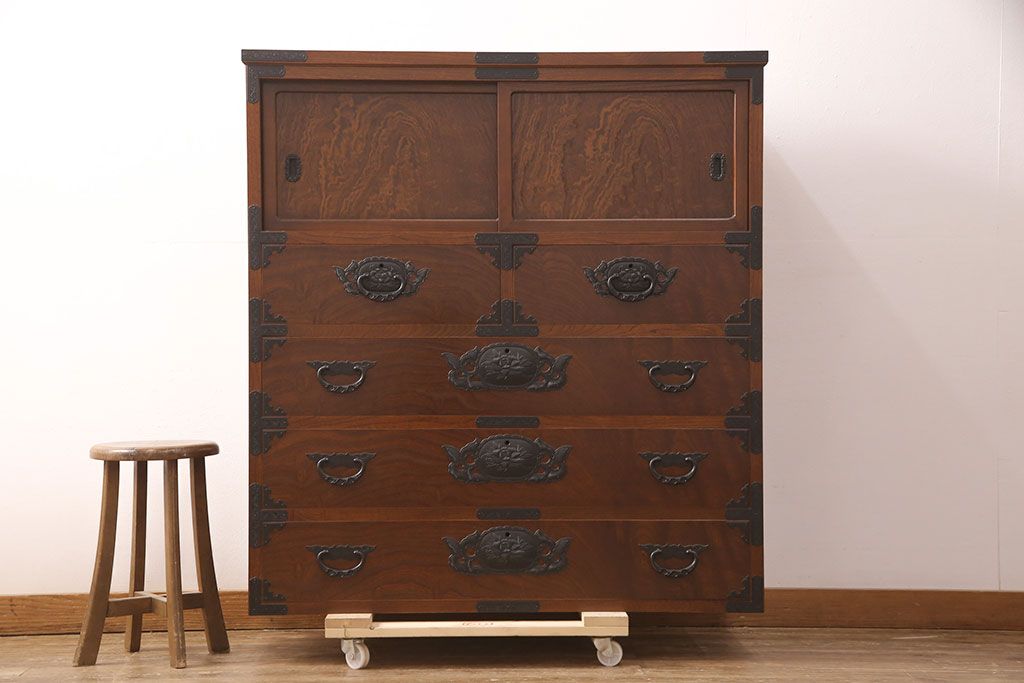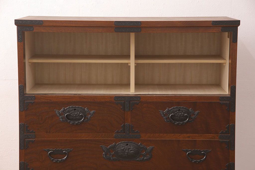 ラフジュ工房> 民芸家具 > 中古 美品 脚(台輪)付きリメイク 国産手造り民芸家具 凝ったデザインの金具と深みのある色合いが美しい和タンス(和箪笥、チェスト、引き出し)(R-052654)