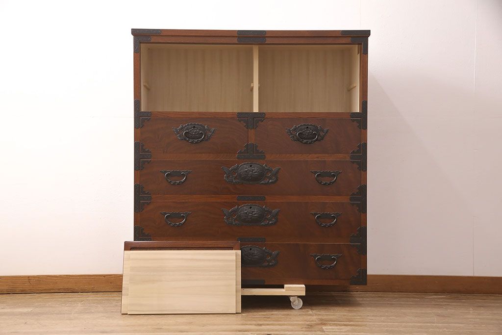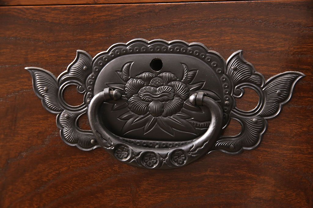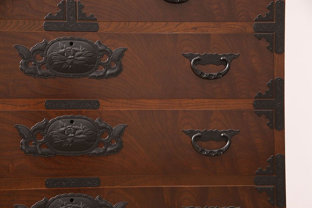 中古 美品 脚(台輪)付きリメイク 国産手造り民芸家具 凝ったデザインの金具と深みのある色合いが美しい和タンス(和箪笥、チェスト、引き出し)(R-052654)