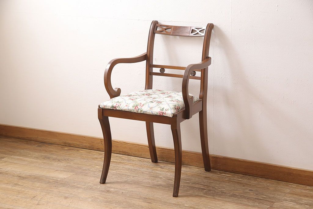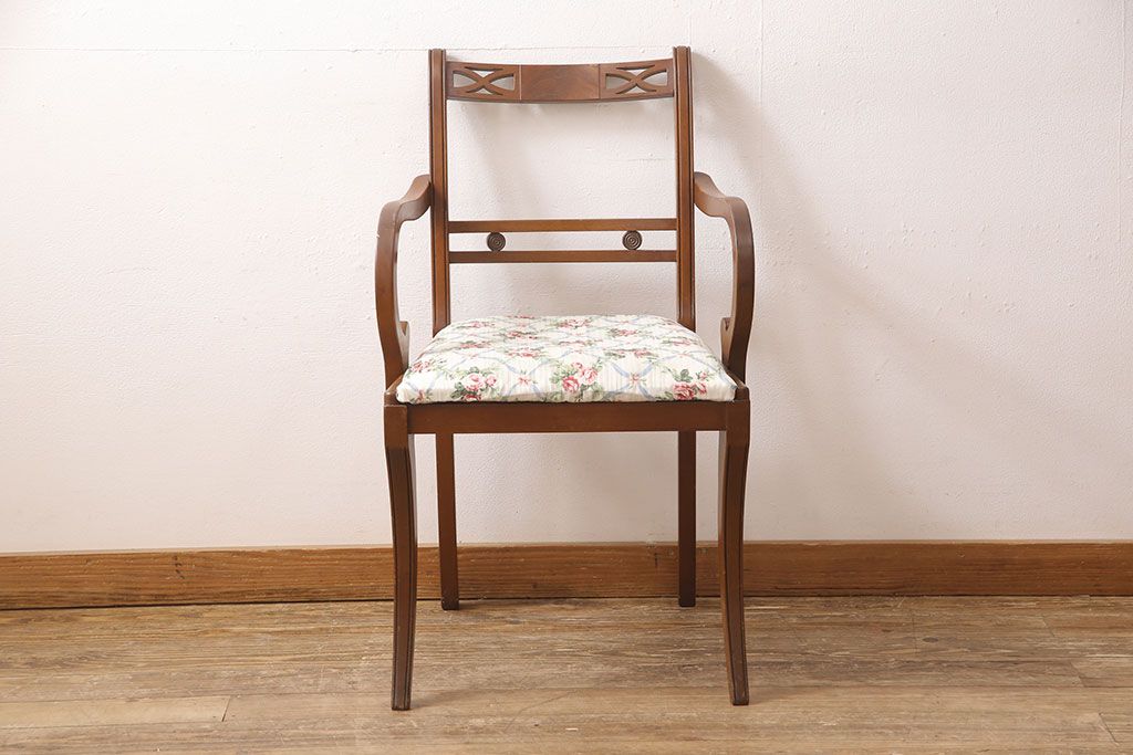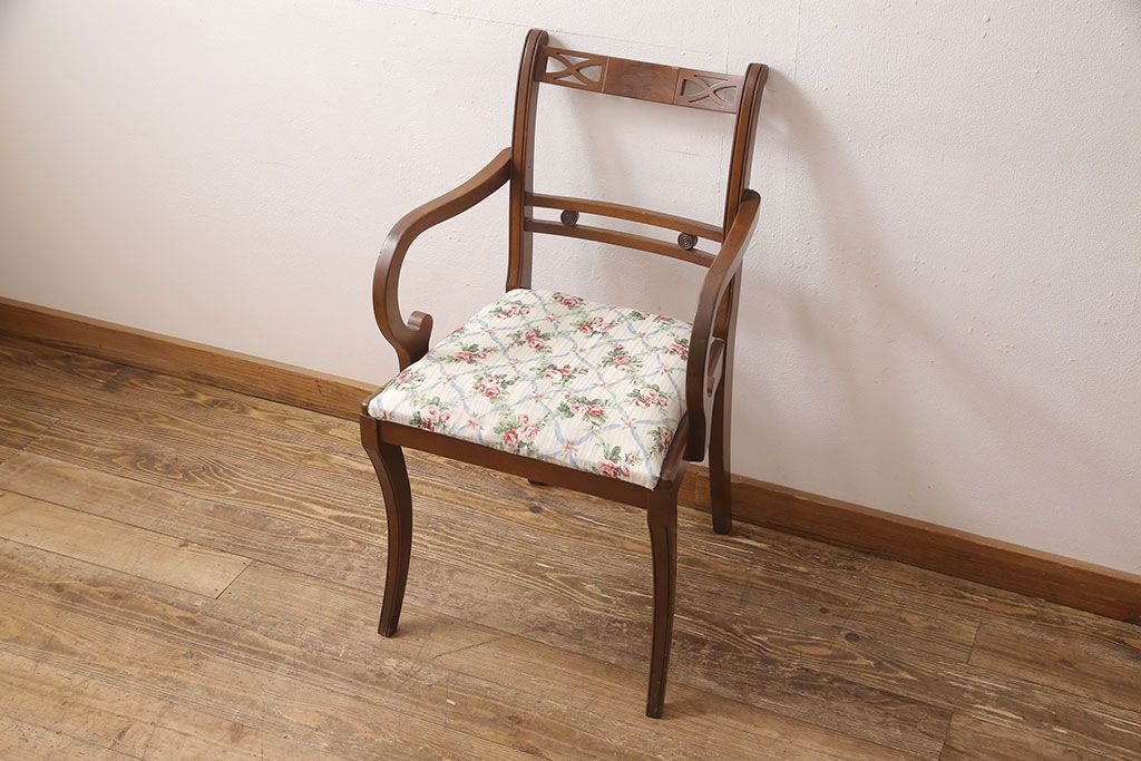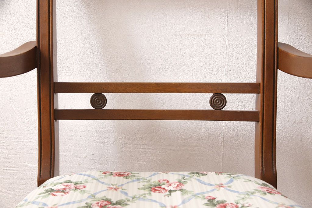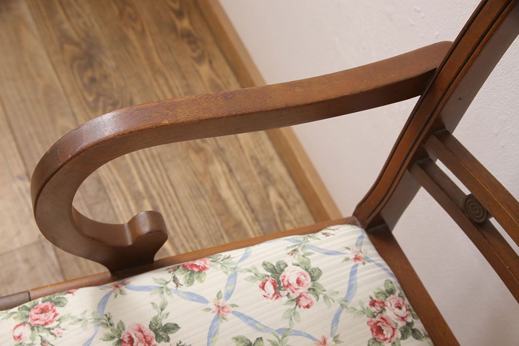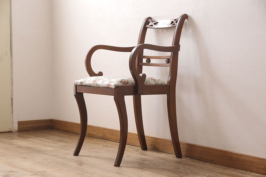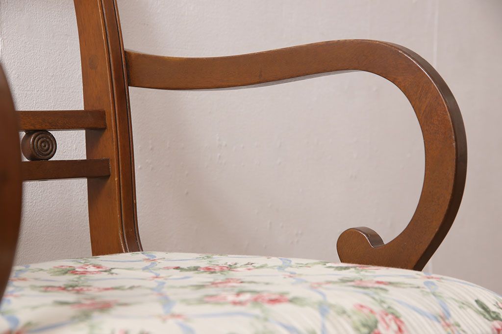 状態が気になる方には現状販売はおすすめできませんので、慎重なご検討をお願いいたします。ヨーロッパアンティーク マホガニー材 曲線的なデザインが美しいアームチェア(ダイニングチェア、椅子、イス)(R-052952)です。