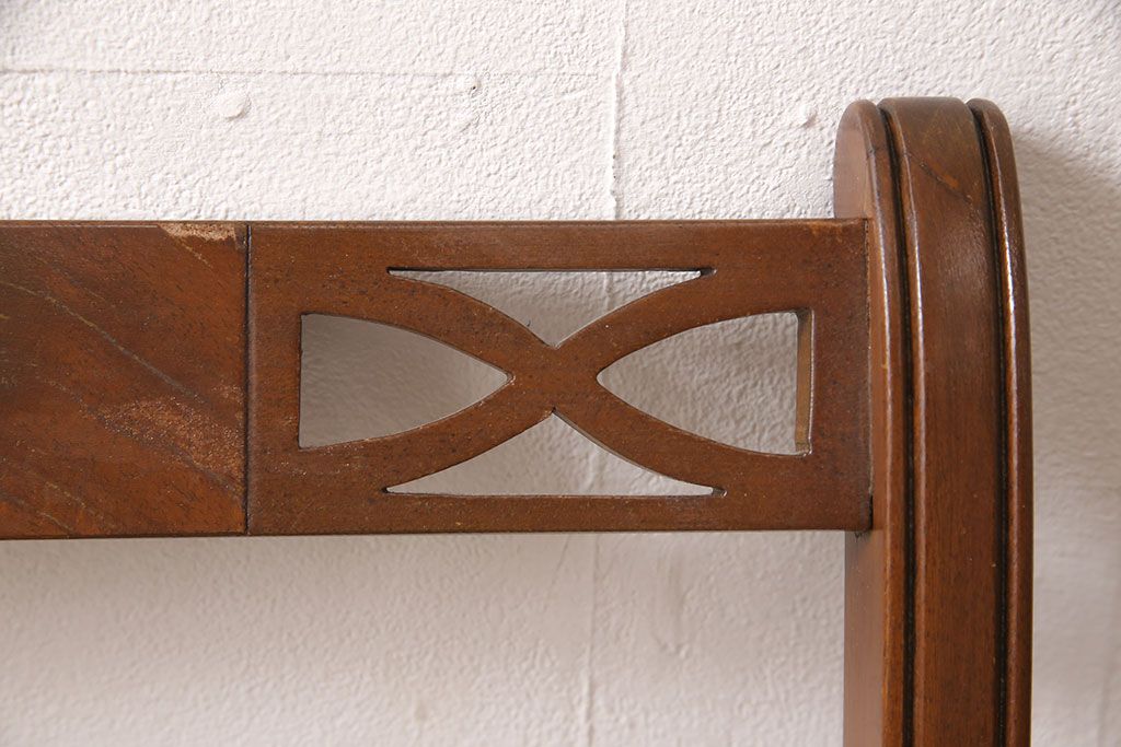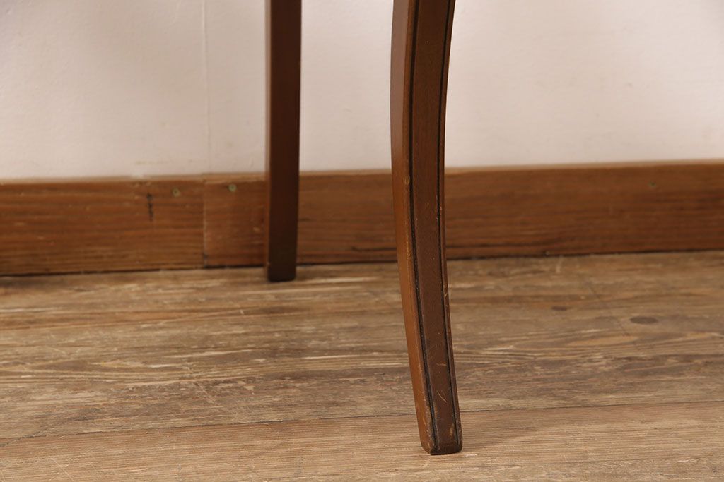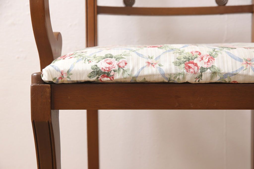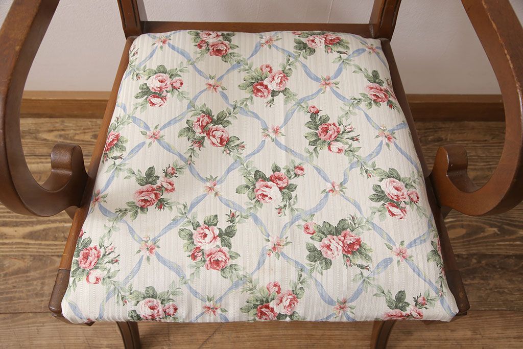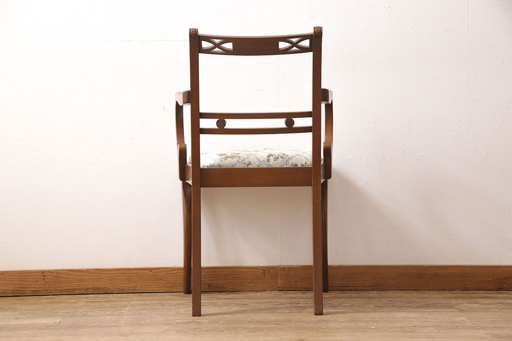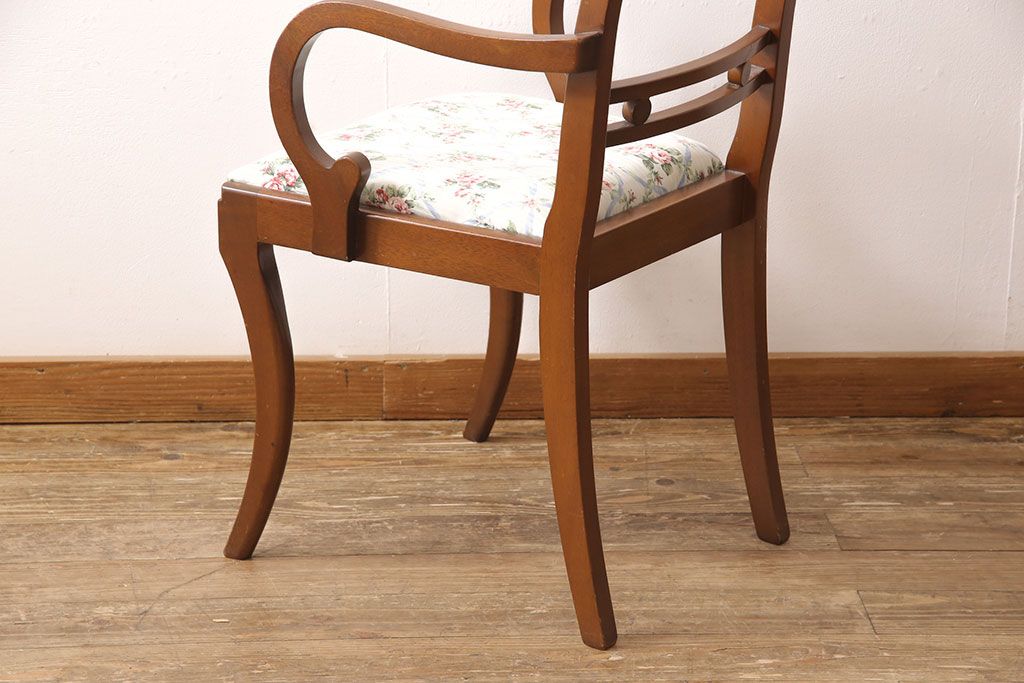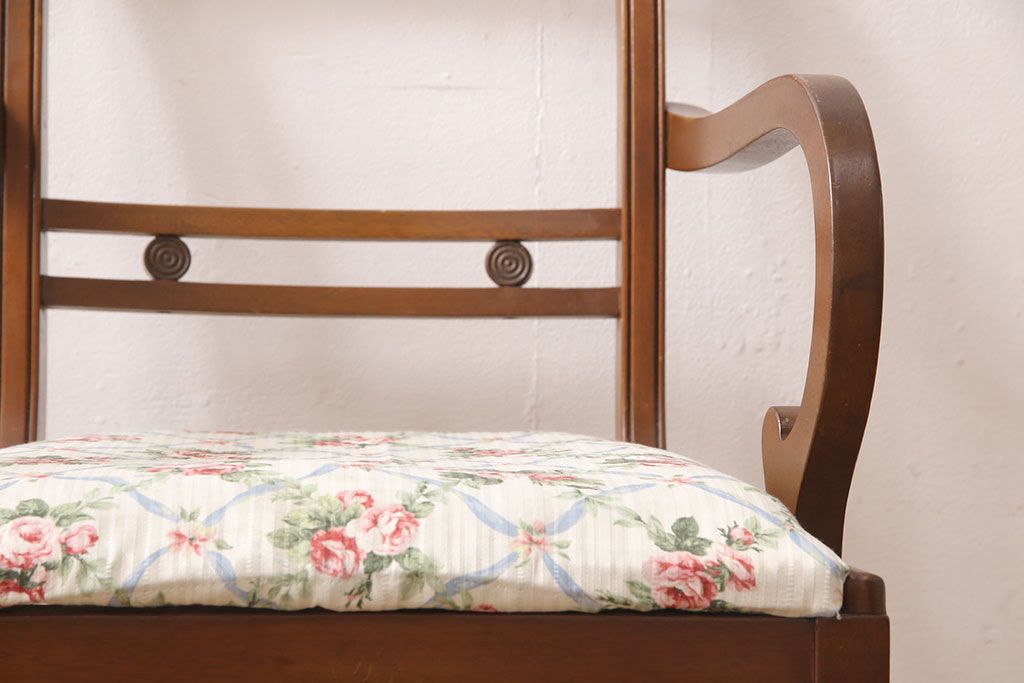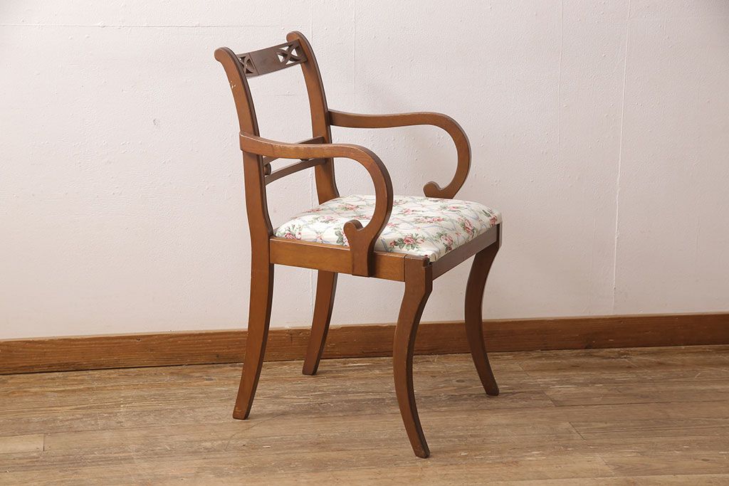 状態が気になる方には現状販売はおすすめできませんので、慎重なご検討をお願いいたします。ヨーロッパアンティーク マホガニー材 曲線的なデザインが美しいアームチェア(ダイニングチェア、椅子、イス)(R-052952)です。