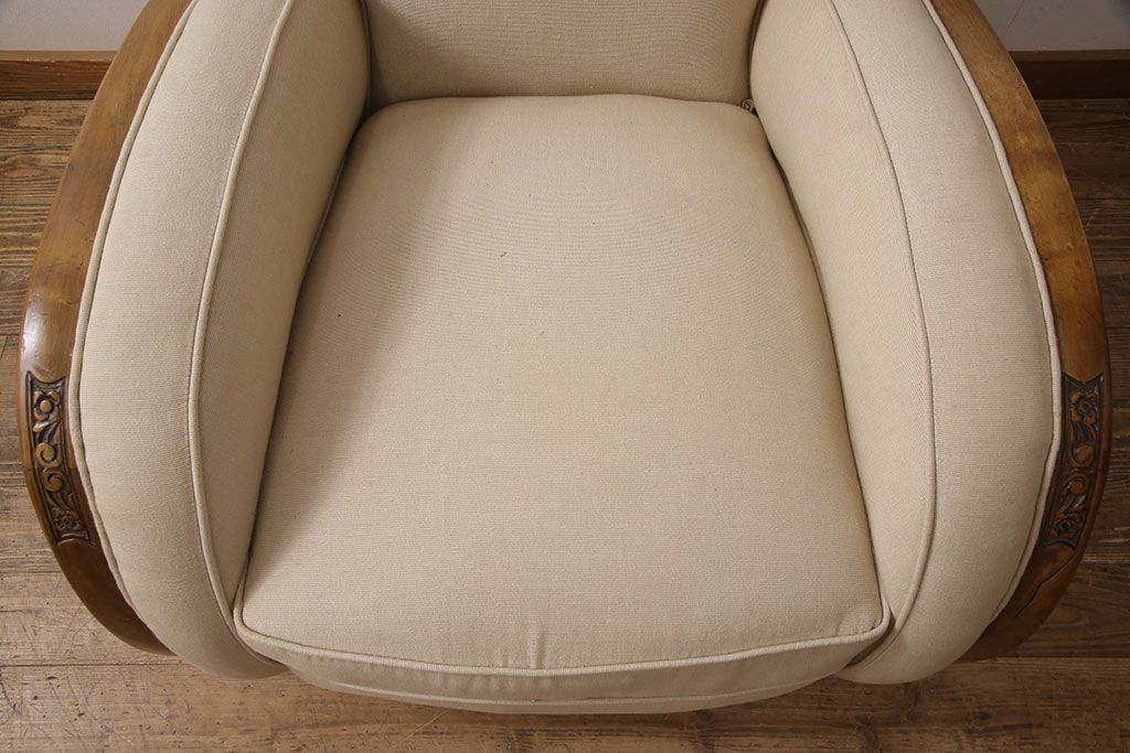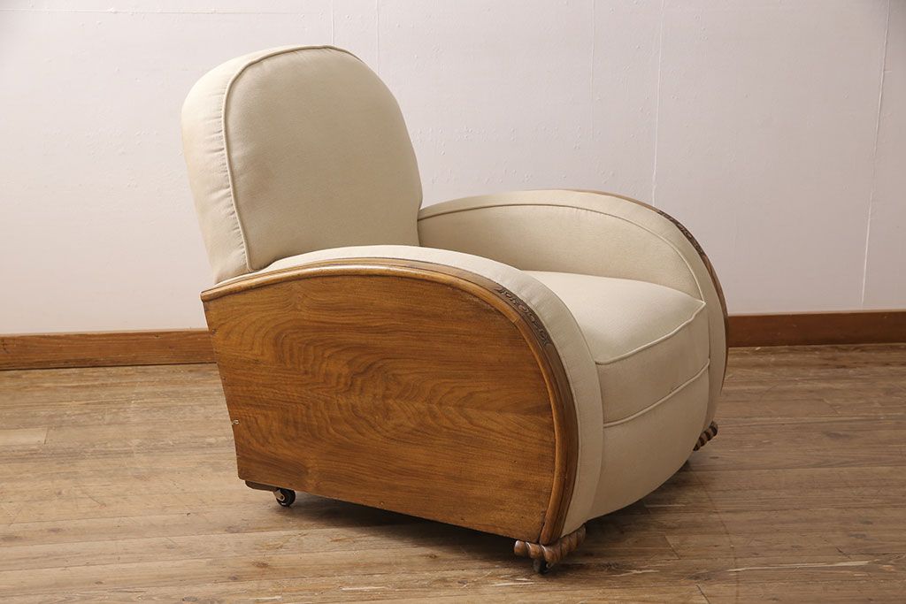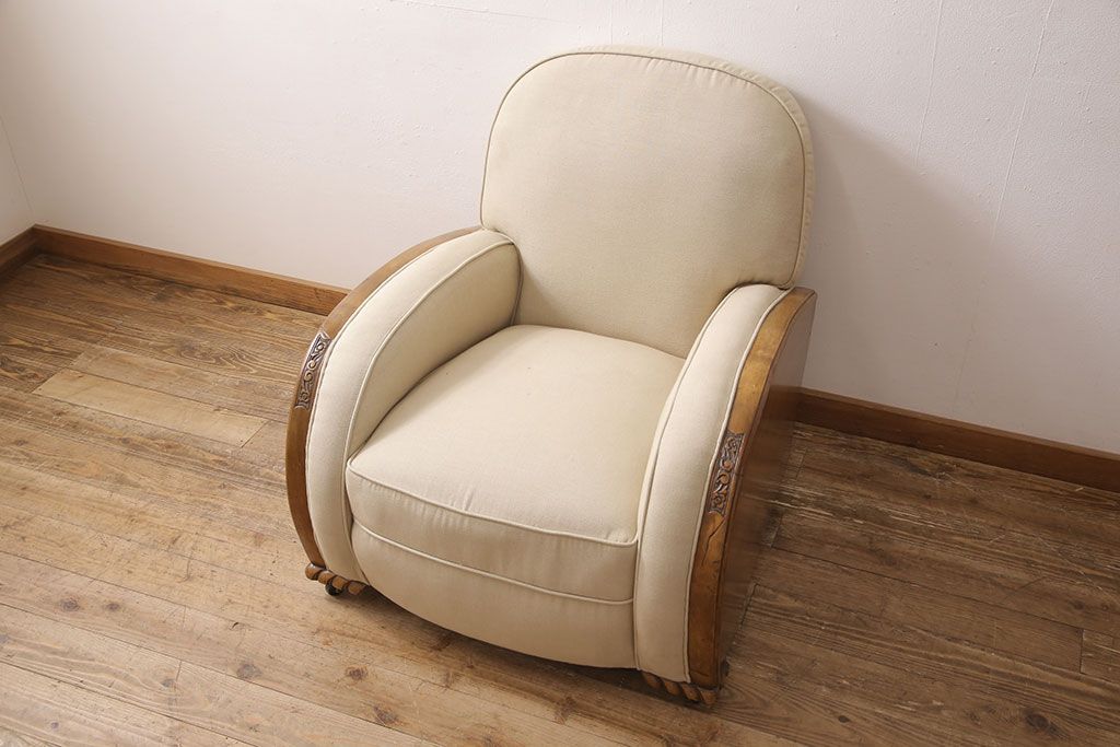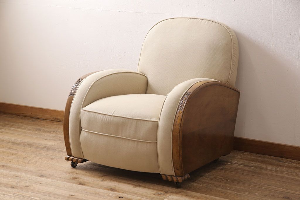 椅子・ベンチ> アームチェア > イギリスアンティーク 美品 高級品 脚やアームの凝ったつくりと、丸みを帯びたフォルムが目を引く1人掛けソファ(一人掛けソファ、アームチェア)(R-053356)