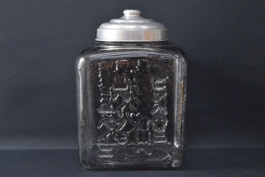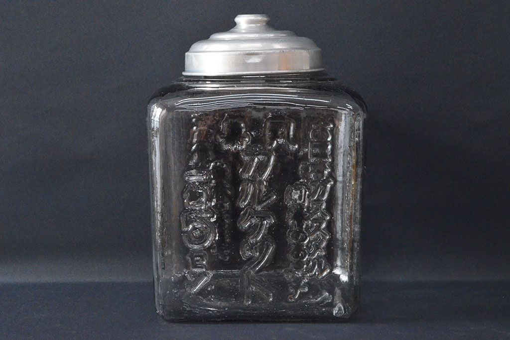 ラフジュ工房> 洋食器・キッチン用品 > 昭和レトロ 乳菓カルケット ガラス瓶(エンボス、アルミ蓋、ガラスビン、小物収納、ディスプレイ)(R-052944)