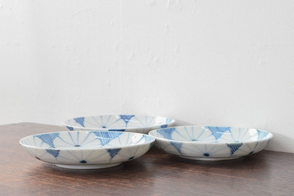 ラフジュ工房> 和食器・茶道具> 皿 > 江戸期 古伊万里 菊花尽し 染付五寸五分皿3枚セット(和食器、小皿)(R-052852)