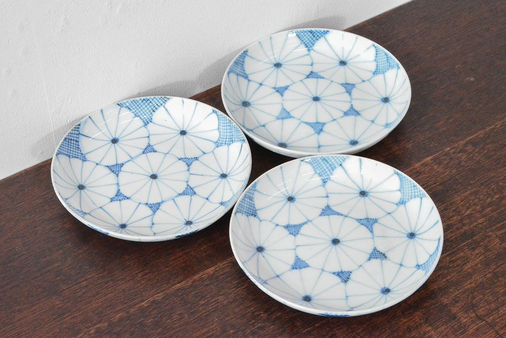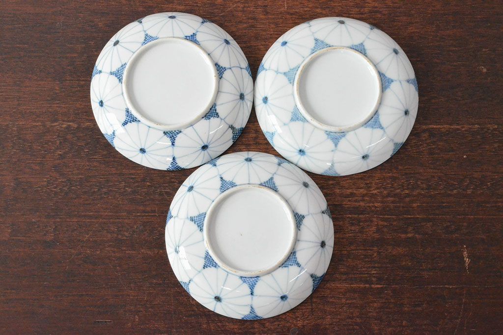 ラフジュ工房> 和食器・茶道具> 皿 > 江戸期 古伊万里 菊花尽し 染付五寸五分皿3枚セット(和食器、小皿)(R-052854)