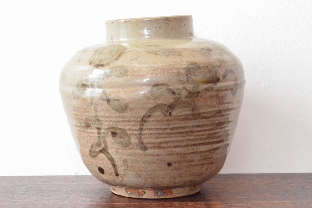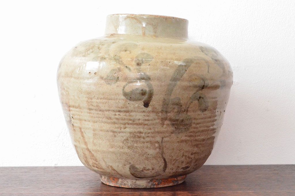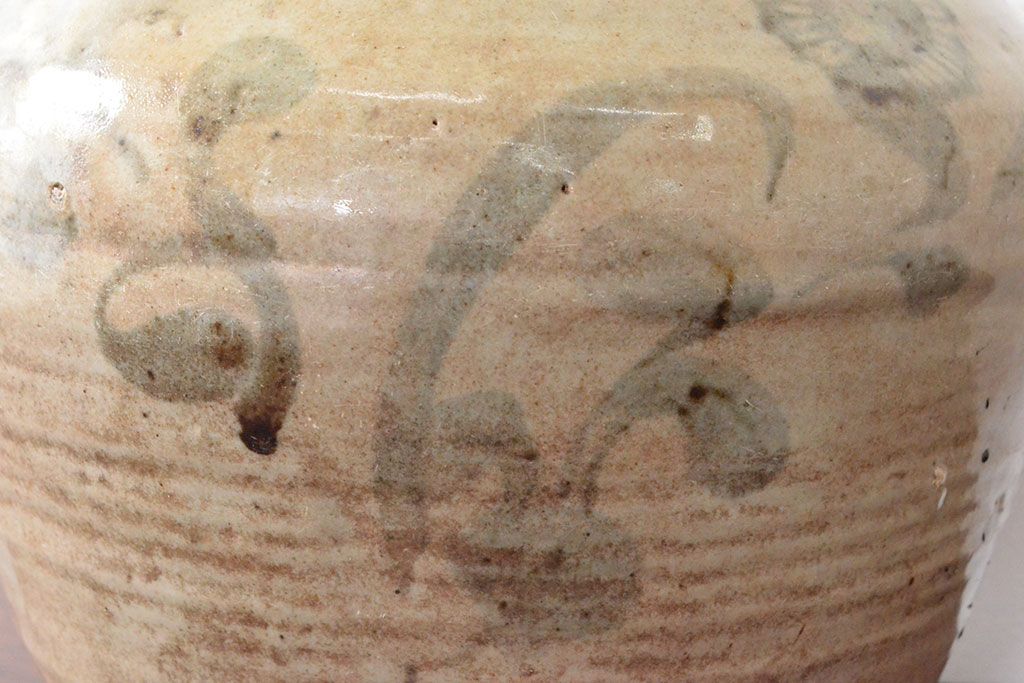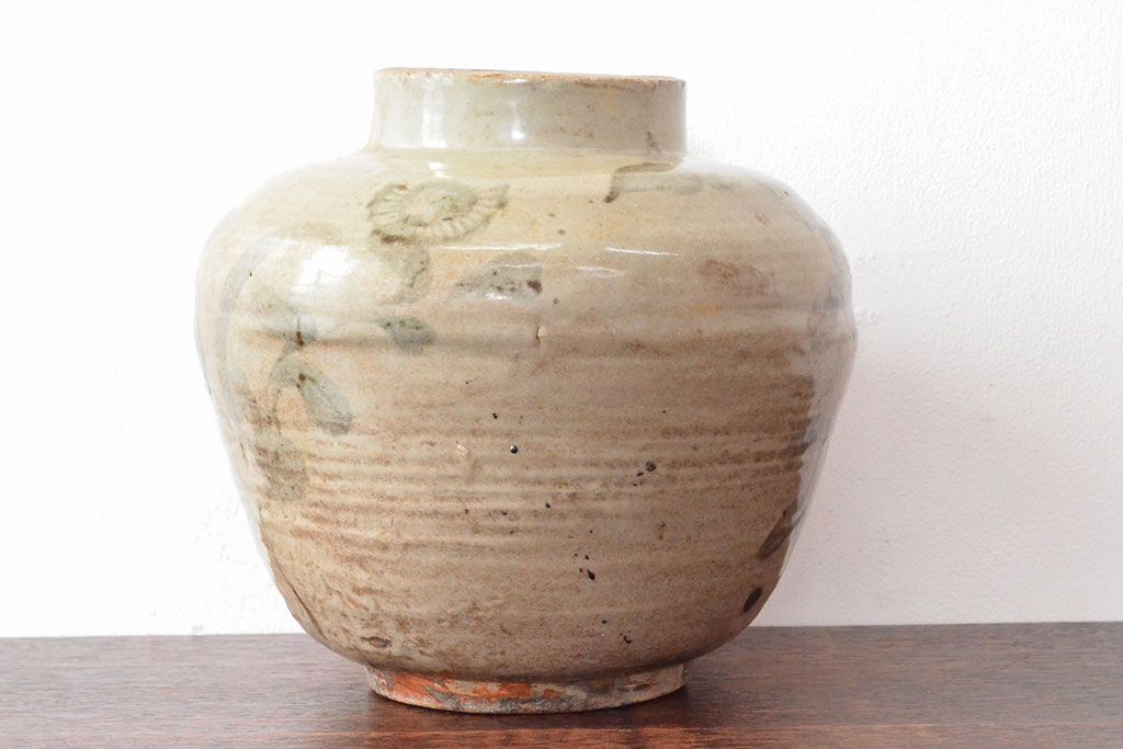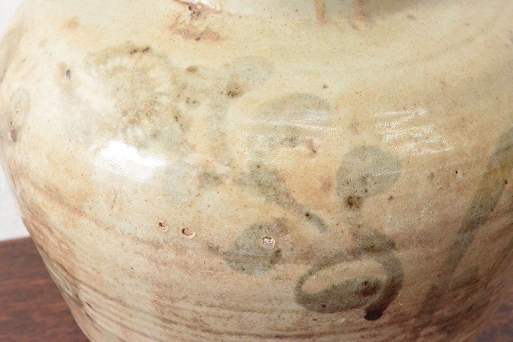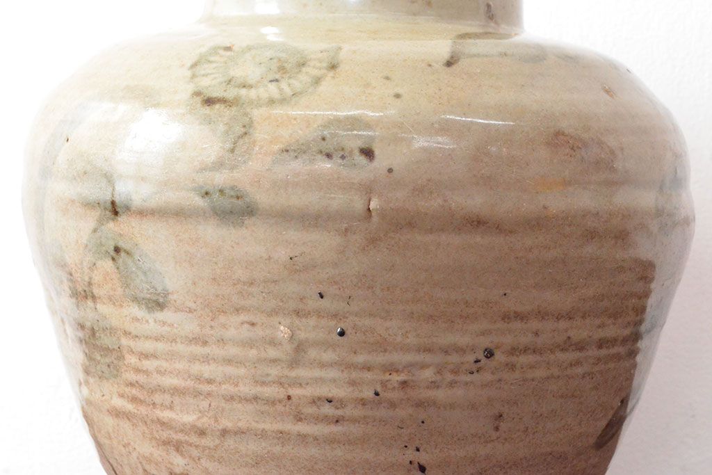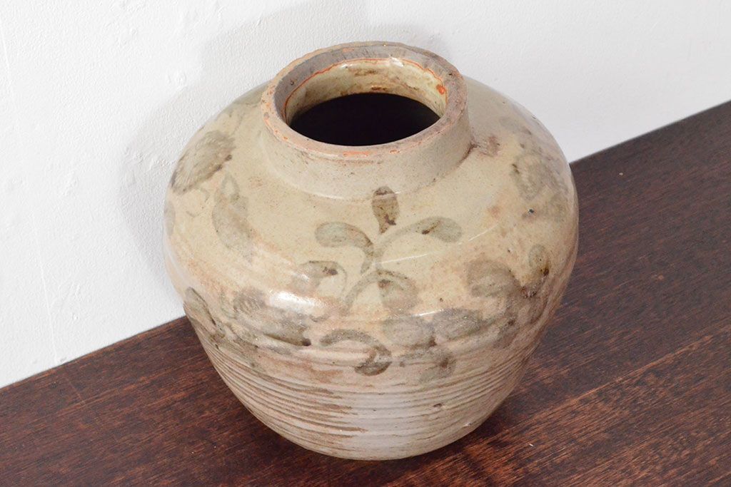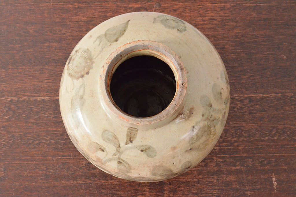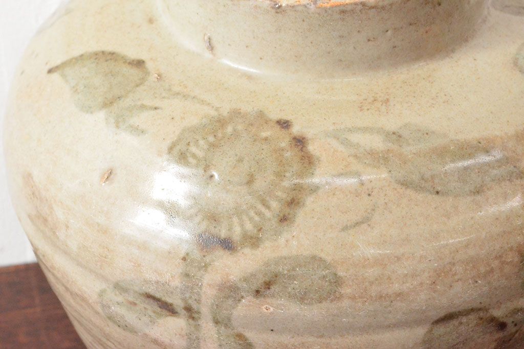 古い 李朝青磁 染付草花文瓶(壷、花瓶、花入)(R-052906)