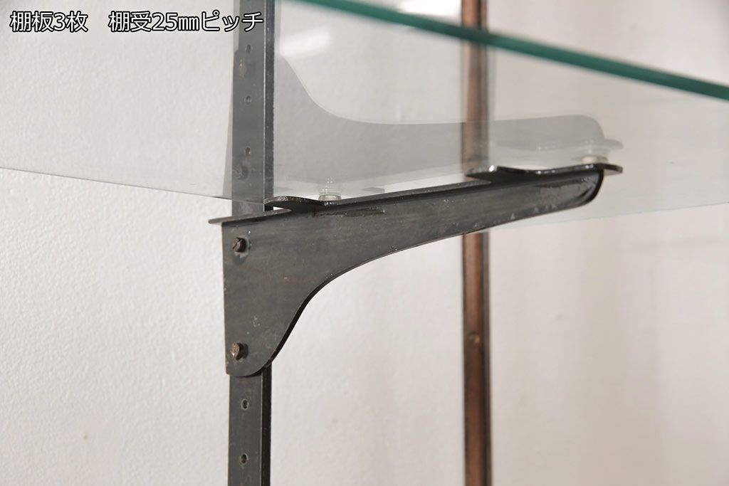 棚板は取り外しできます。棚板は3枚あります。棚受けは25mmピッチで調整できます。棚幅サイズのものが1枚の作りです。